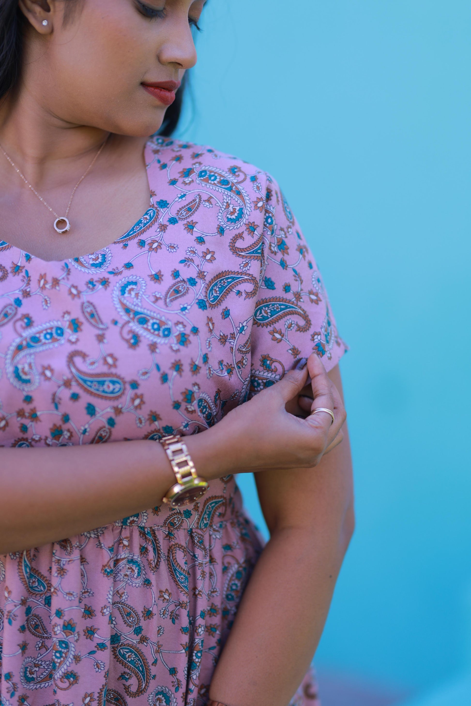 Pink With Brown & White Kalamkari Flower design Alphine Without zip frock