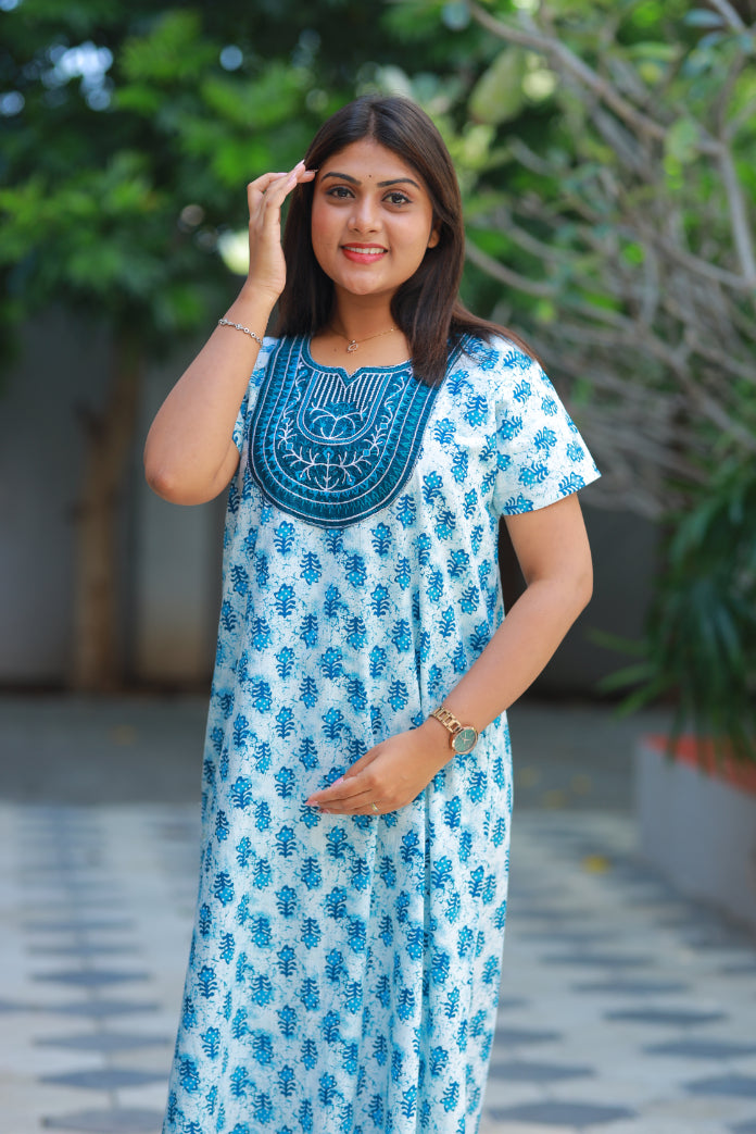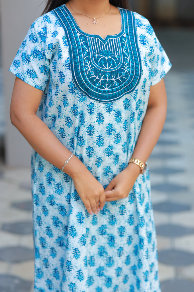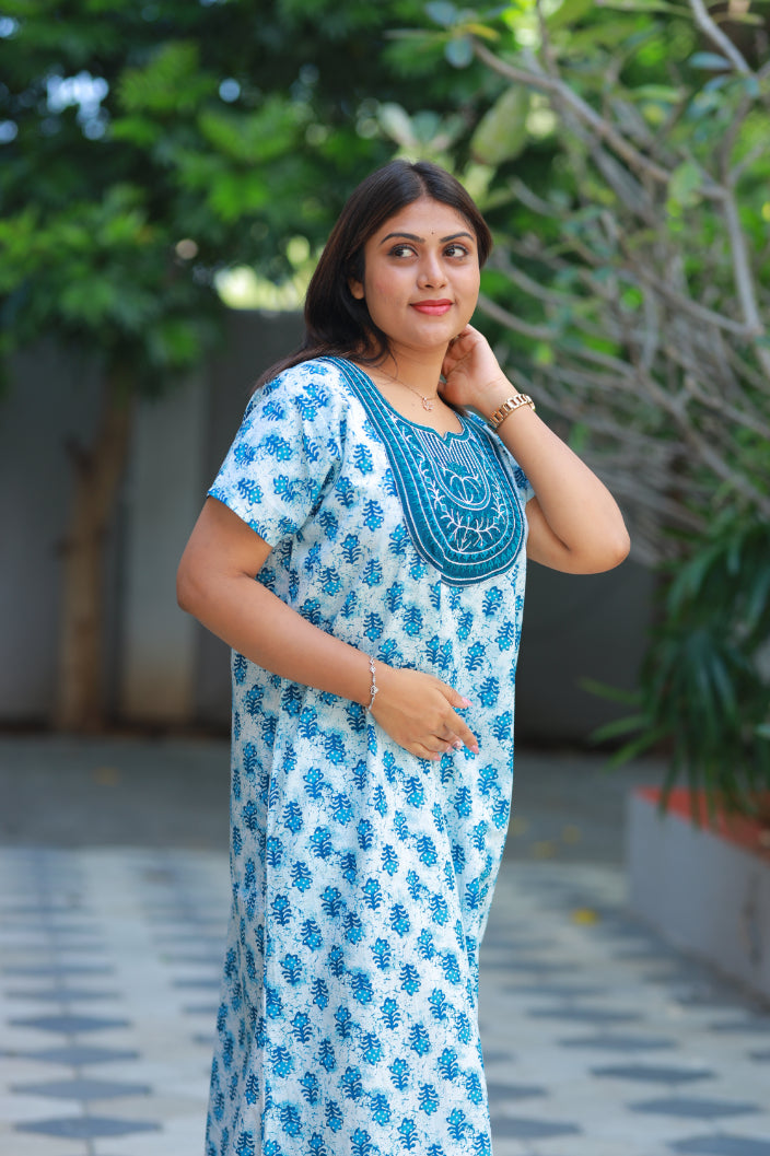 White With Blue Butta design embroidery neck nighty