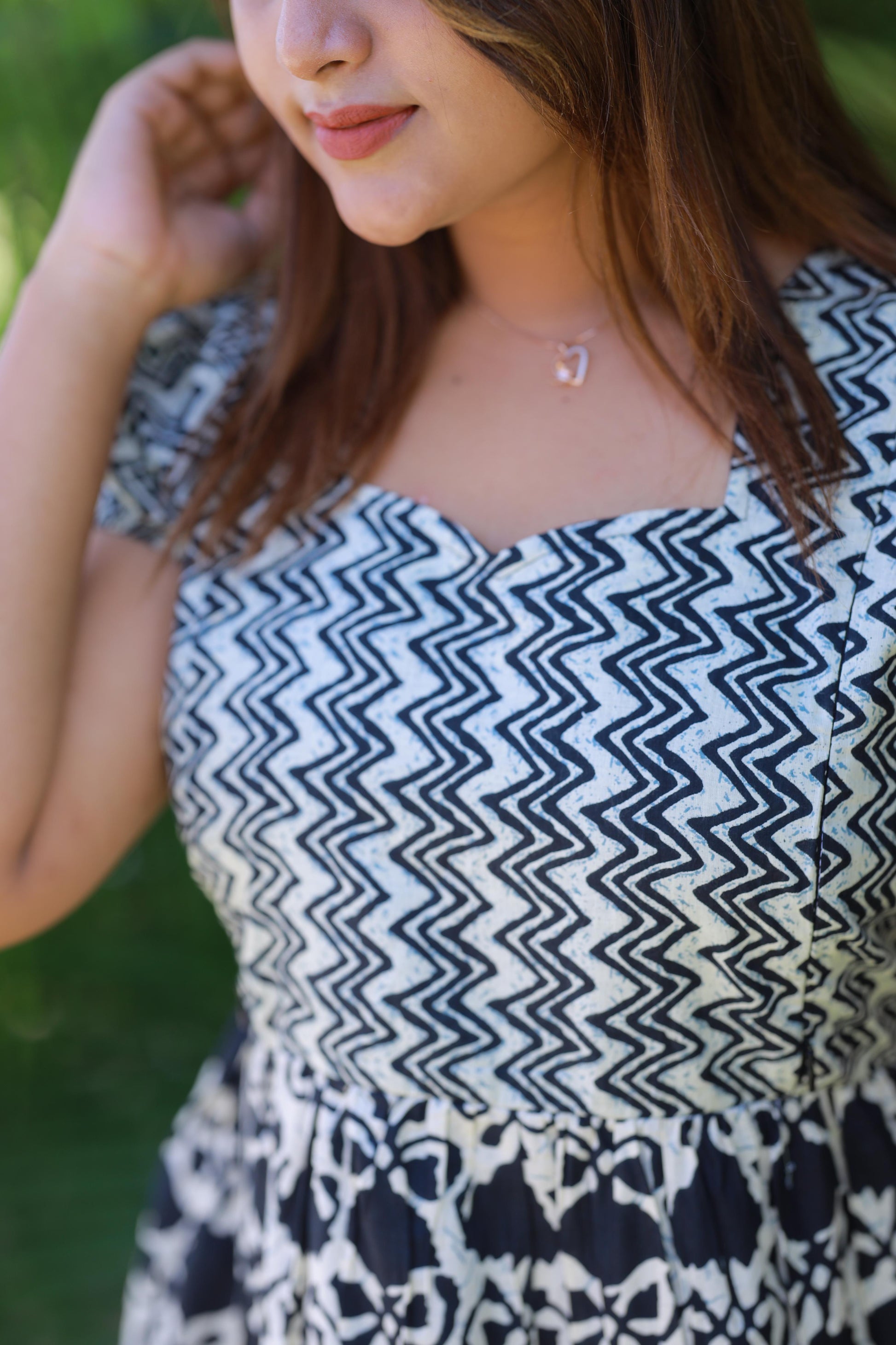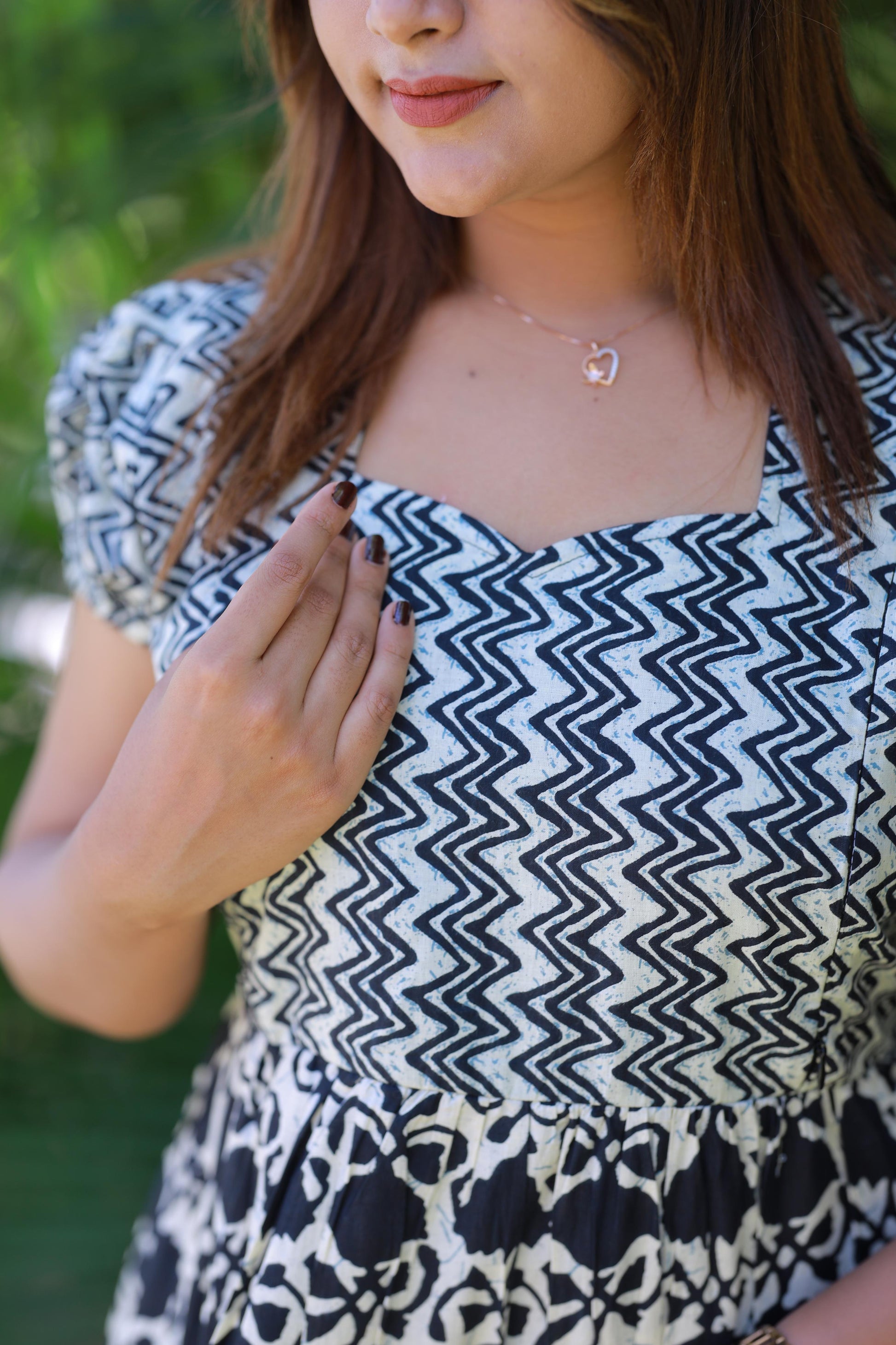 Black With White zigzag and Flower Design Pure cotton 3 Layer frock with Side zip