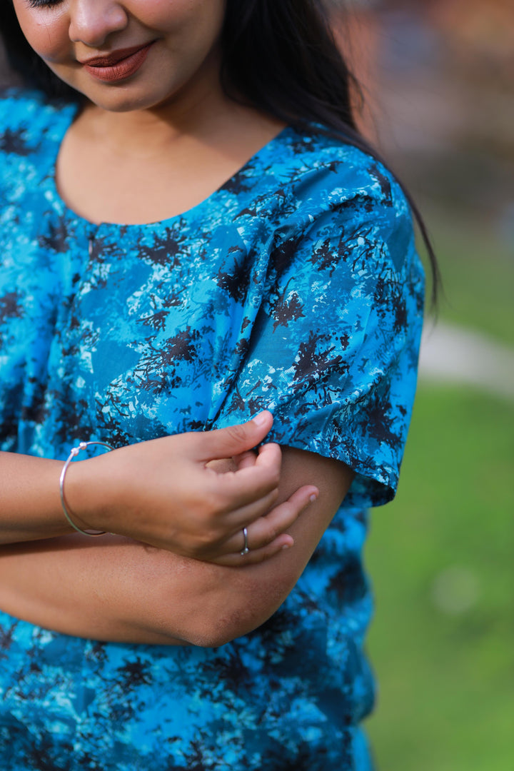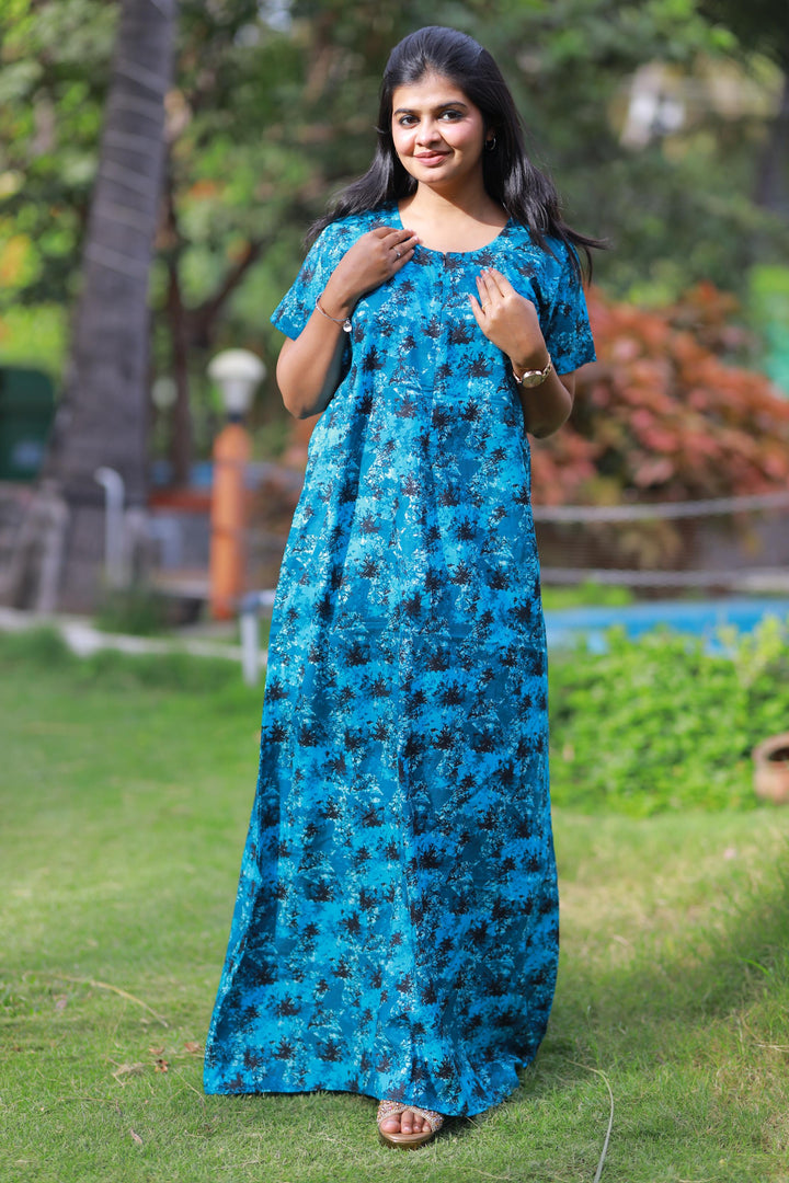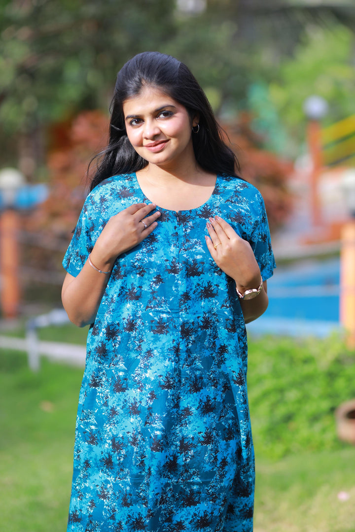Dark Blue With Black and Offwhite Pattern Design Invisible Center Zip Feeding Nighty