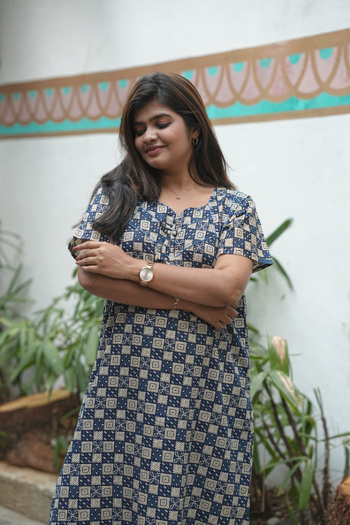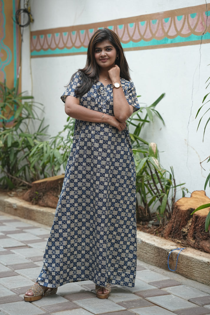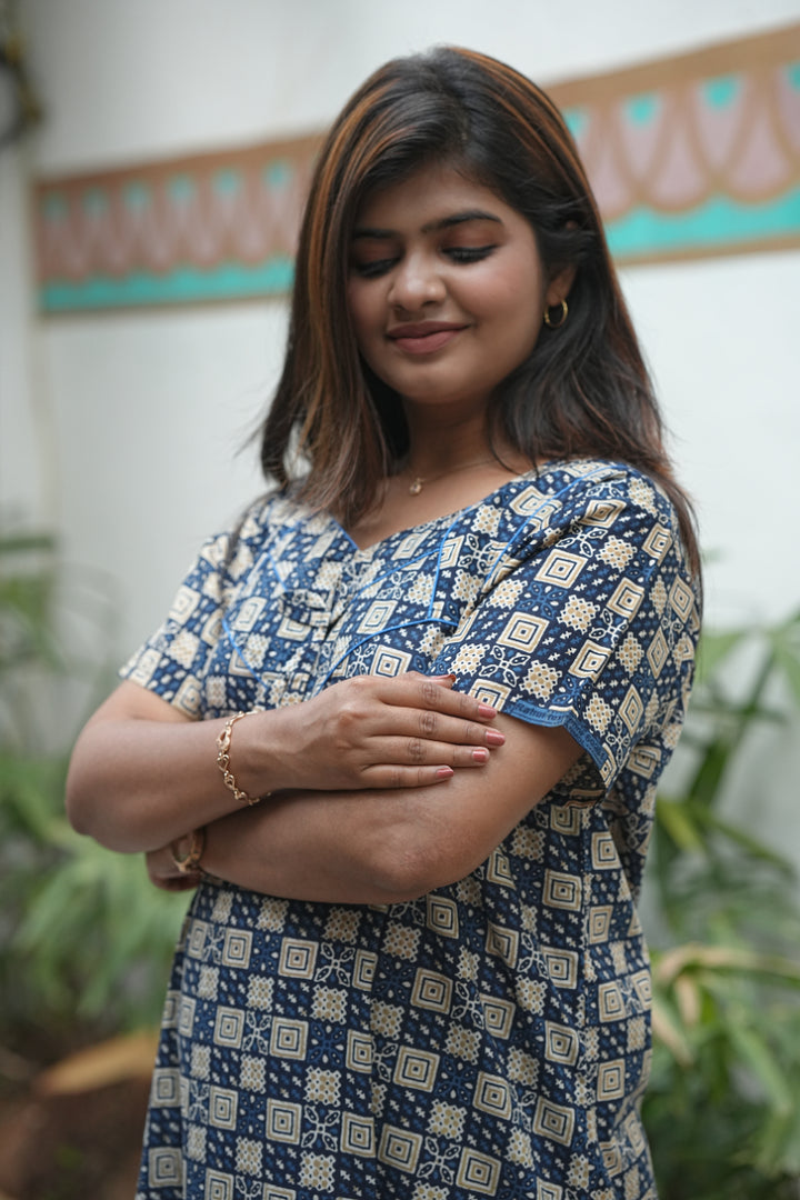 Navy Blue with Off White Floral Pattern Piping Without Zip Nighty