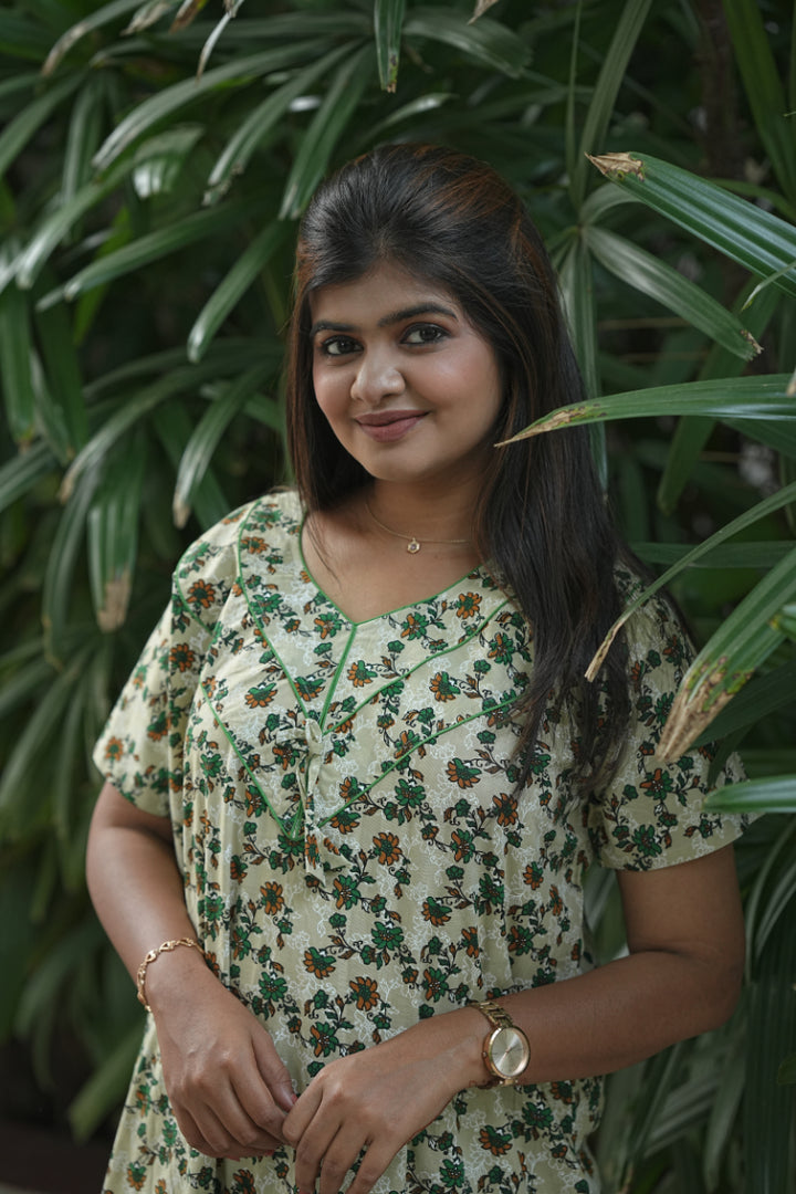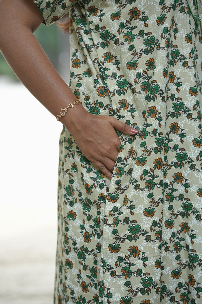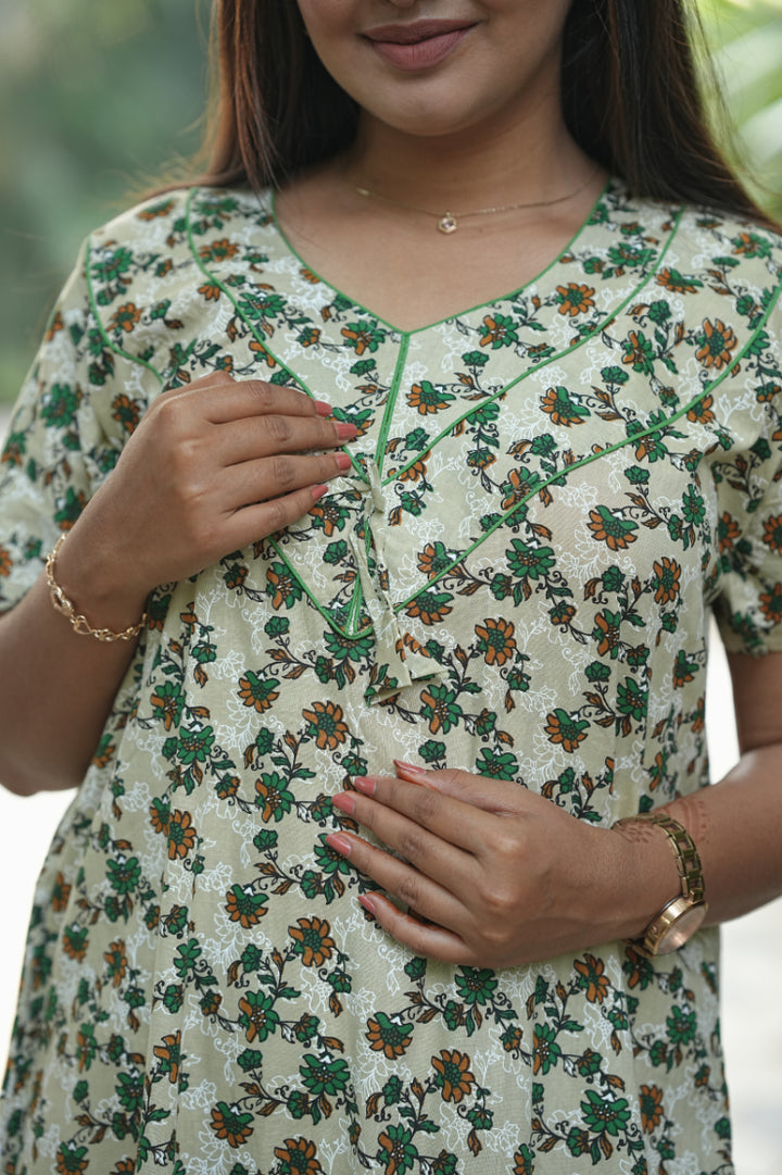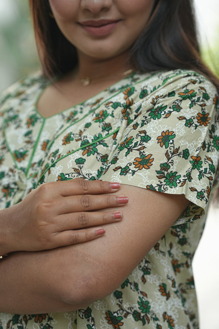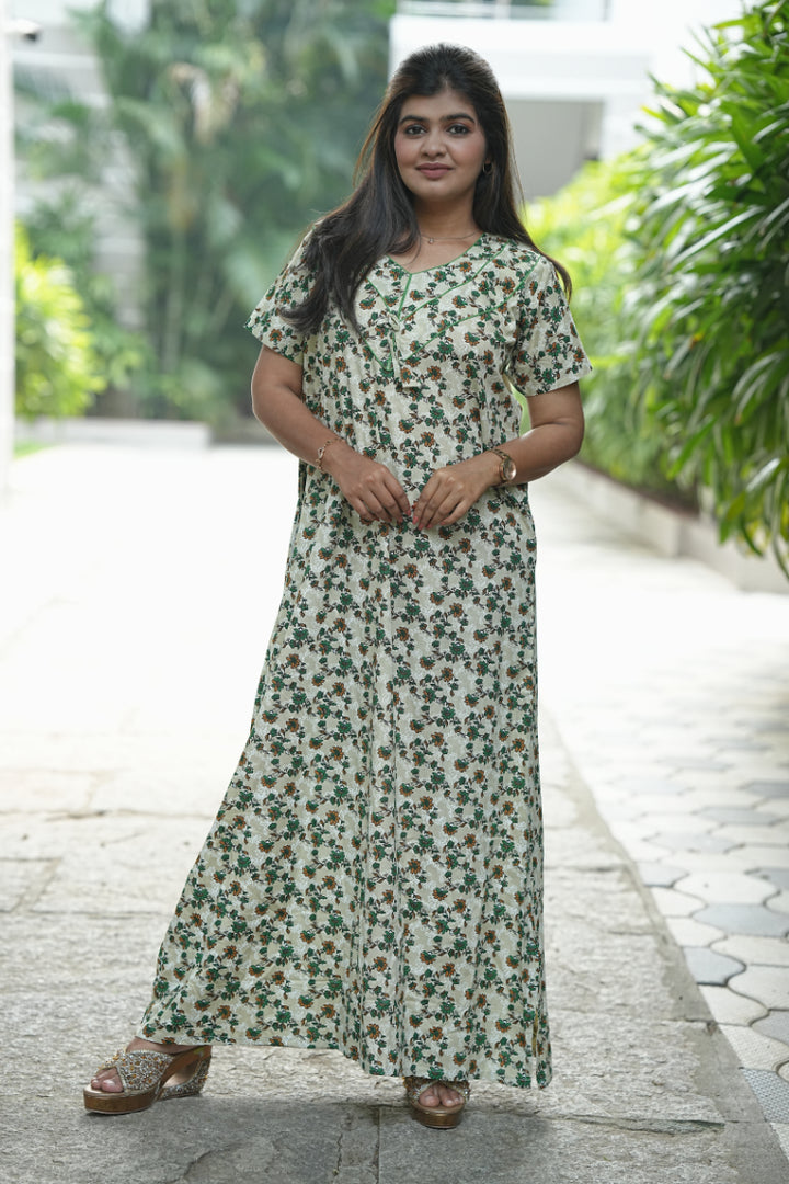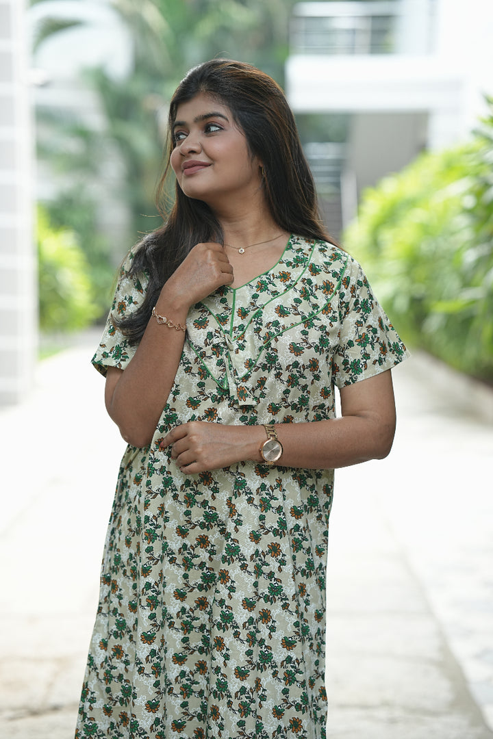 Pistha Green With Maroon Flower Design Piping Without Zip Nighty