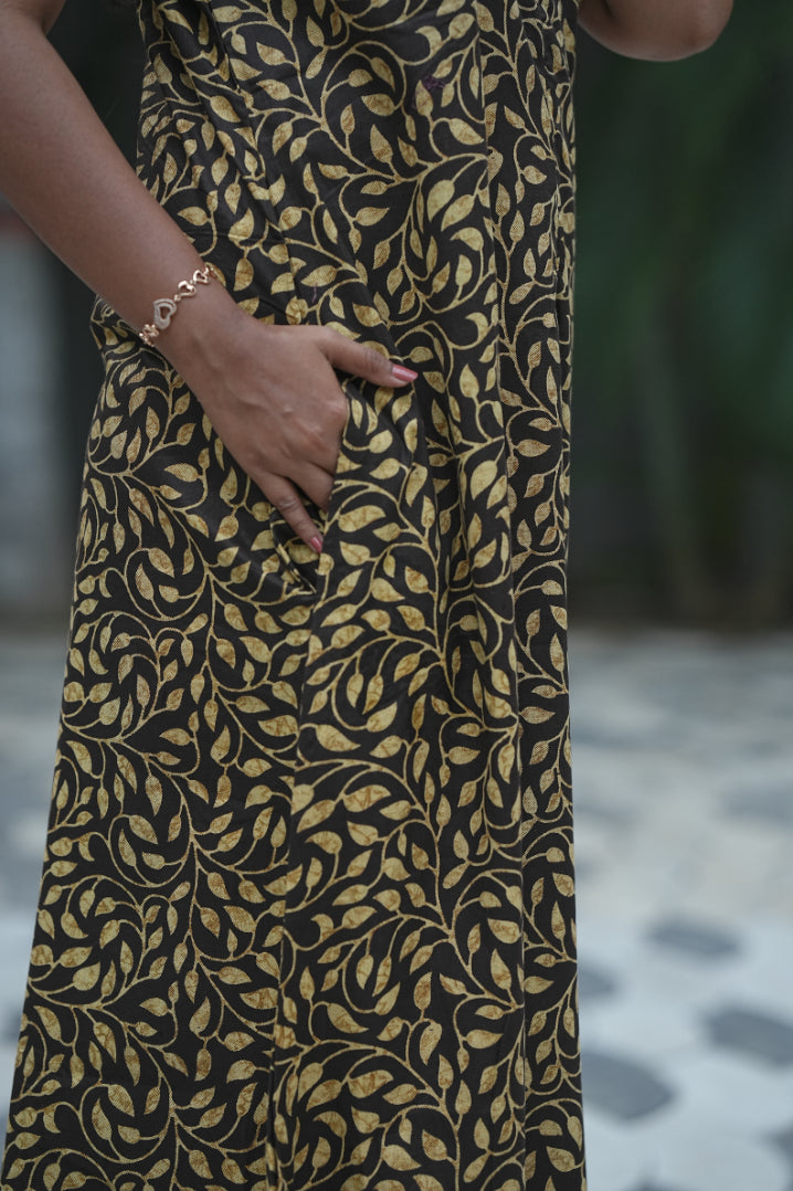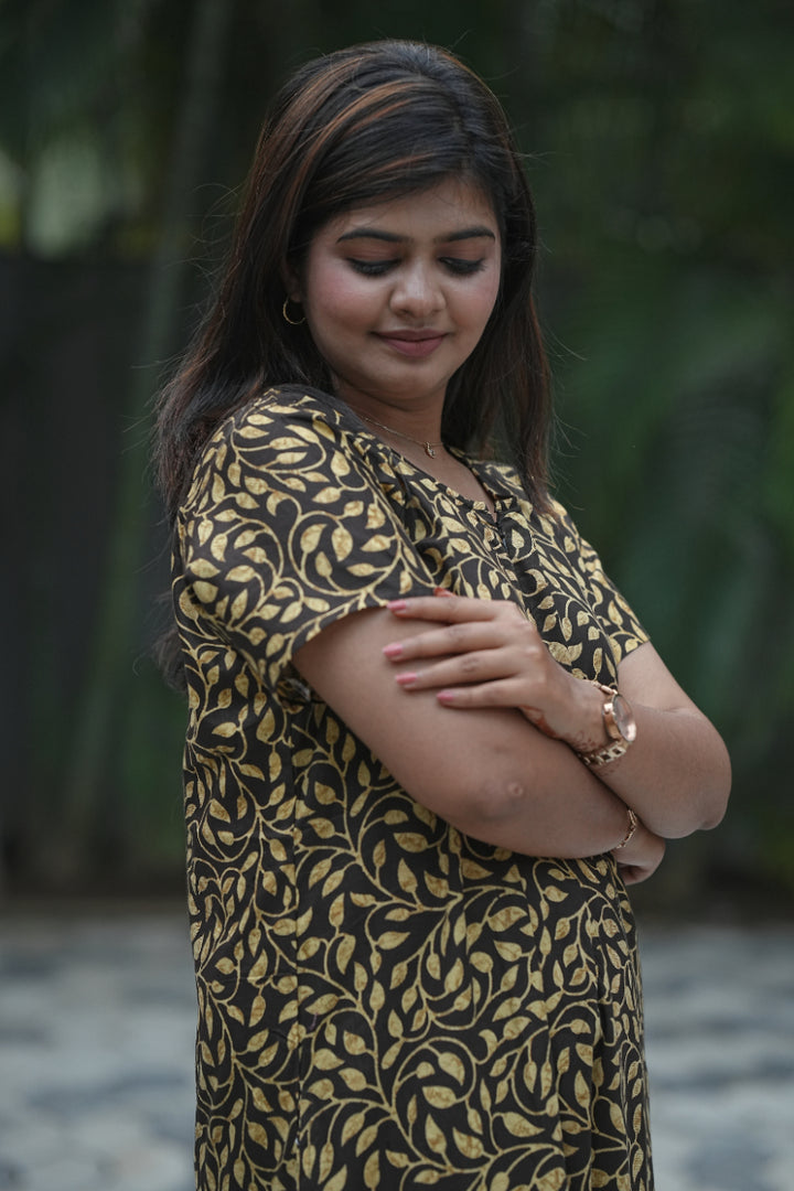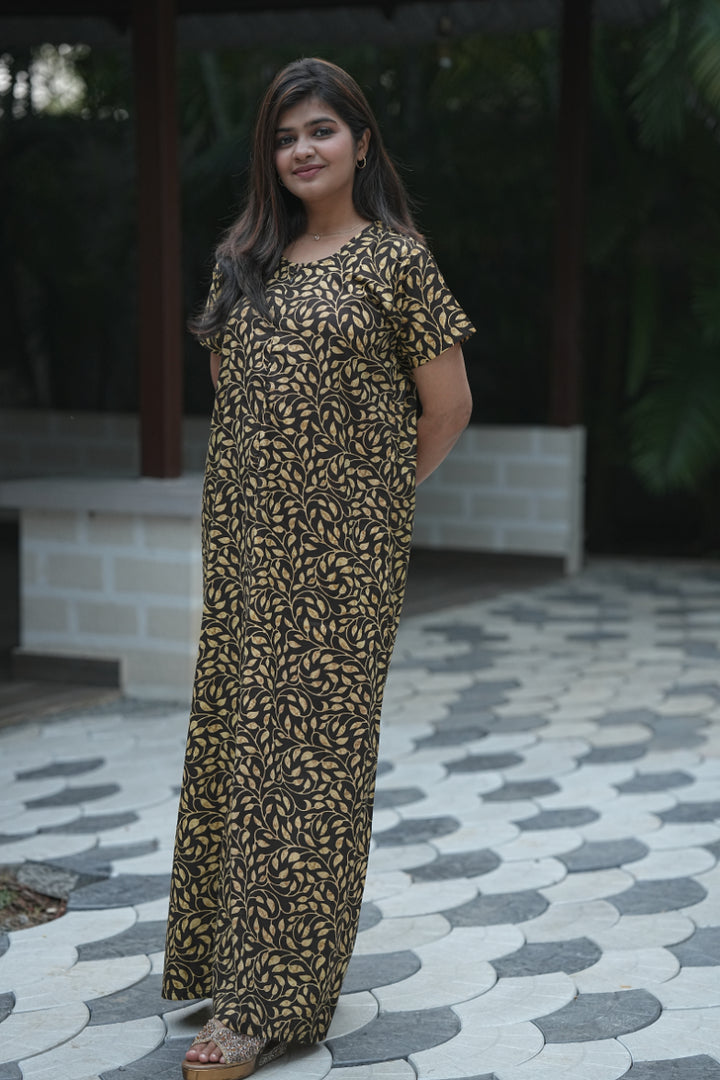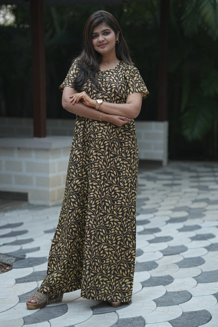 Dark Brown With Golden Yellow Leaf Design Invisible Center Zip Feeding Nighty