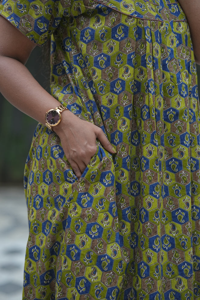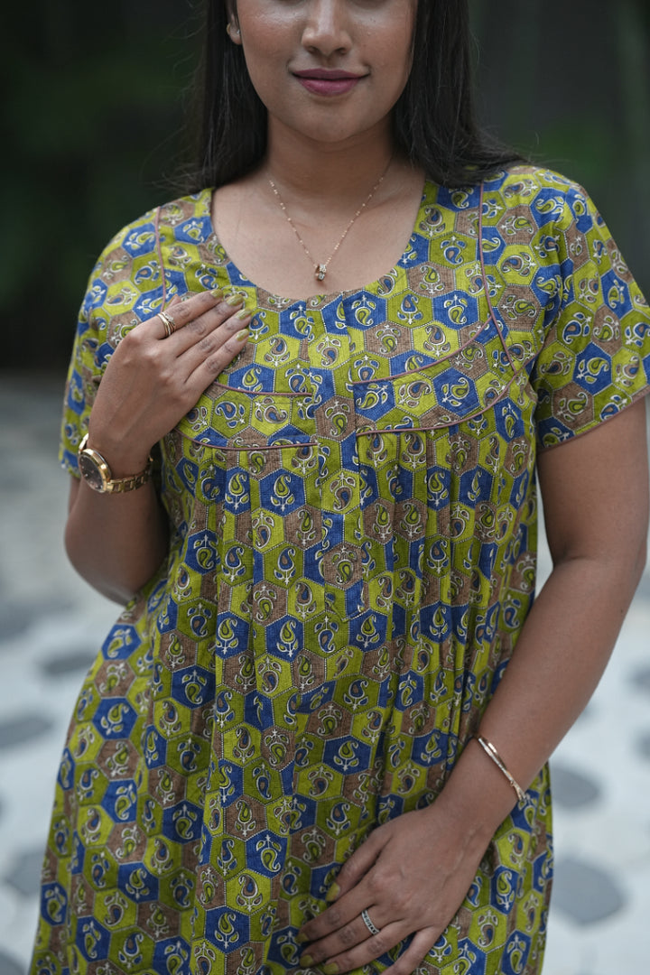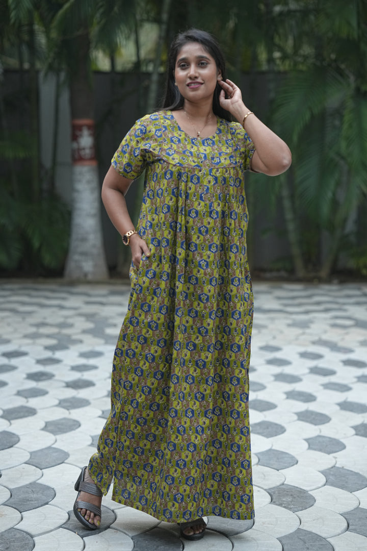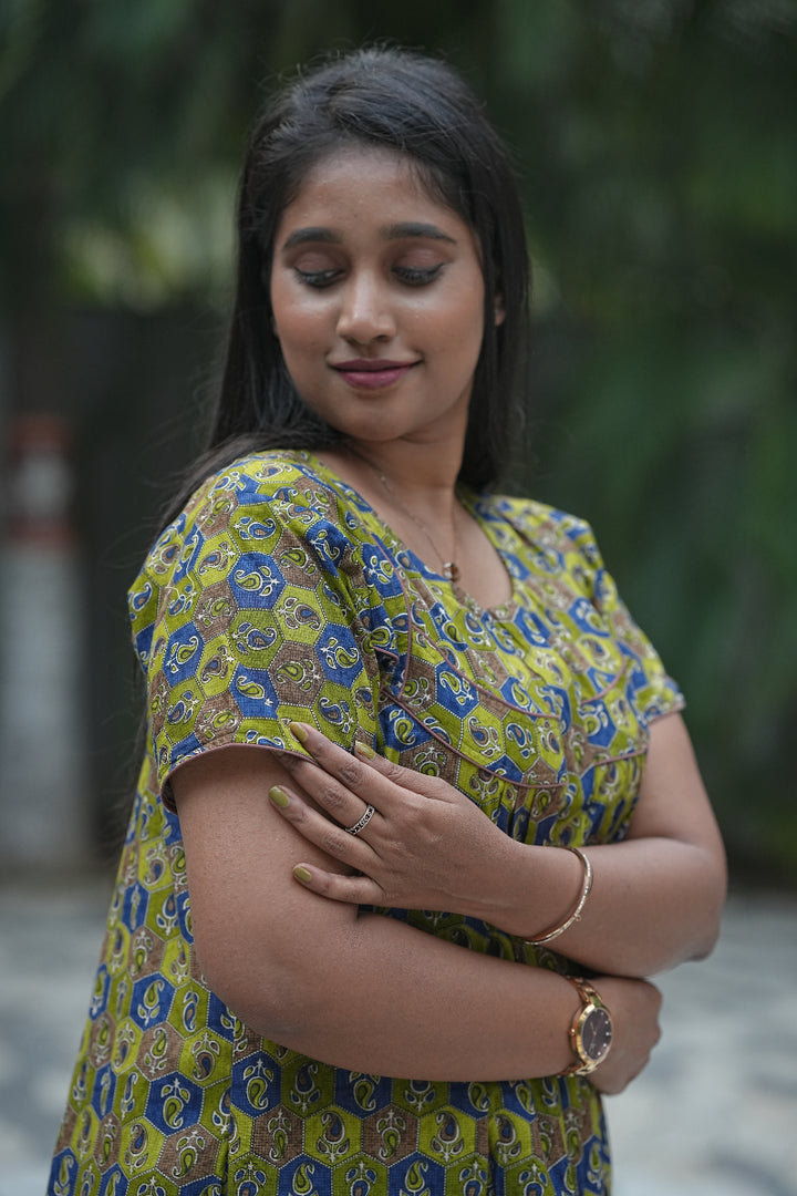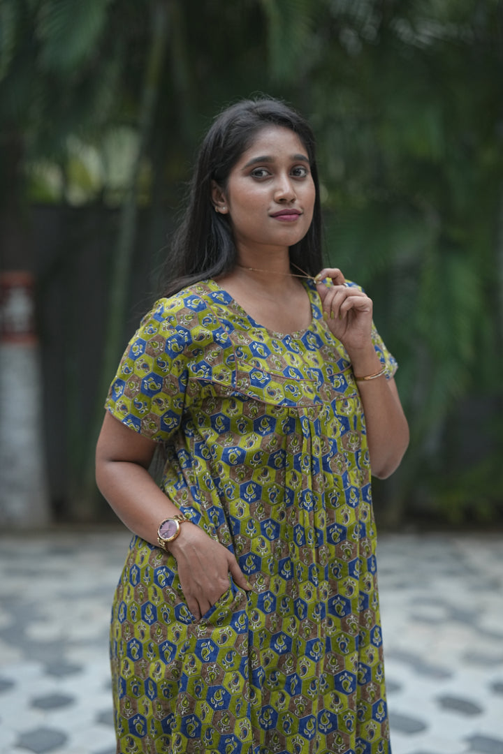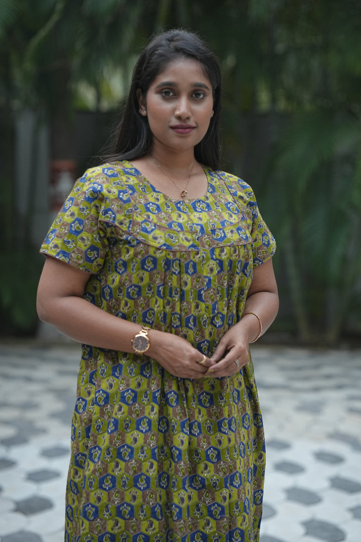 Olive Green with navy Blue Geometric Pattern Kalamkari Fleet cut Piping Center Zip Nighty