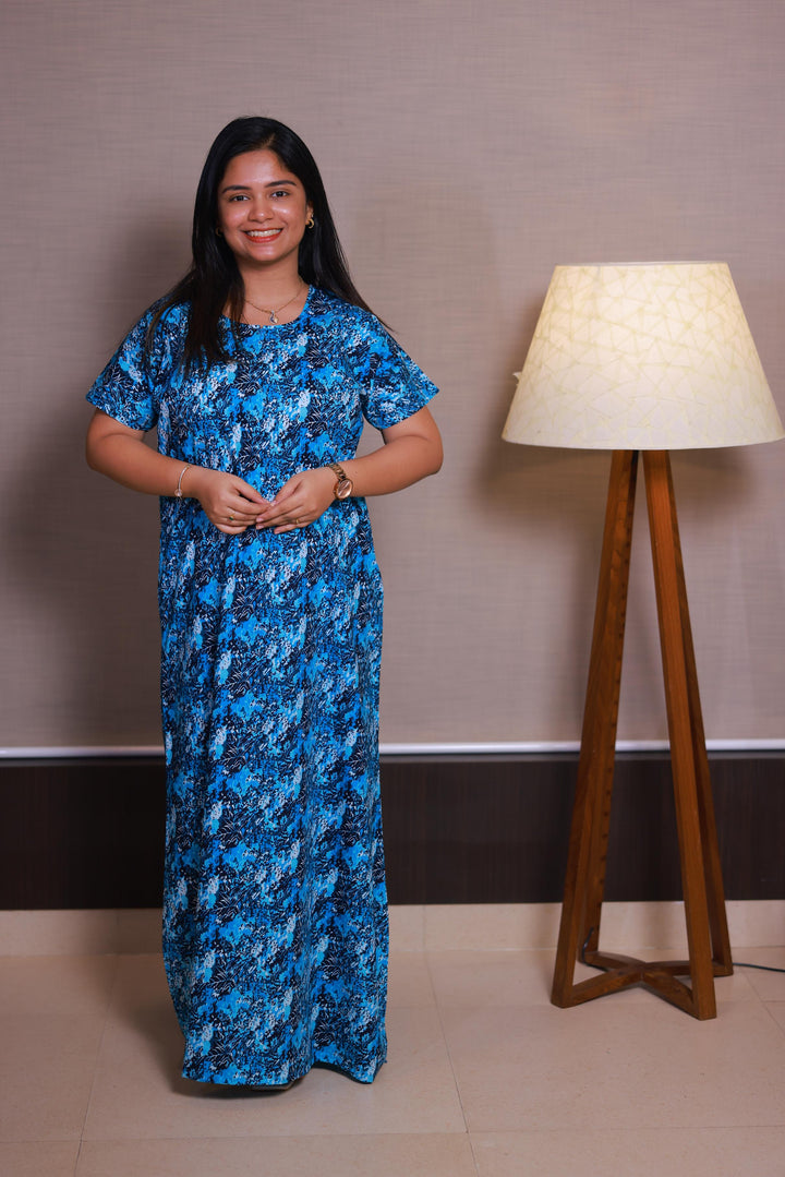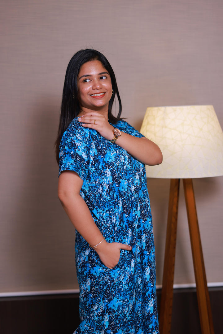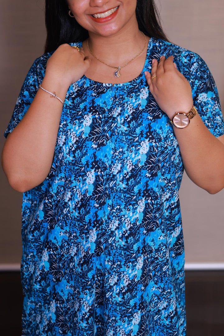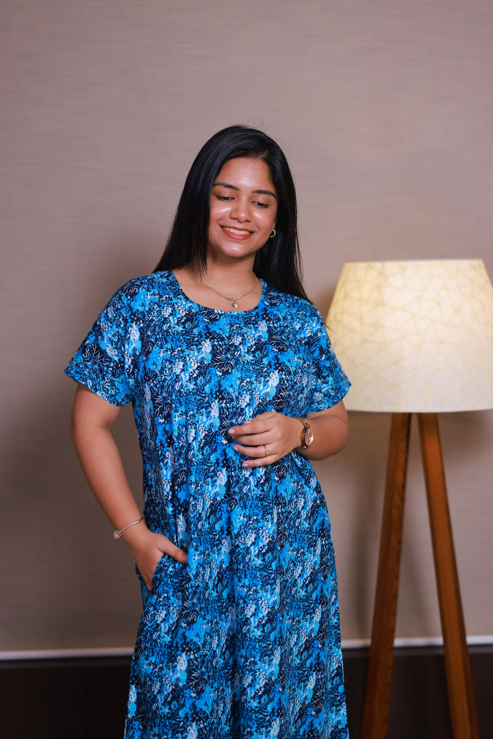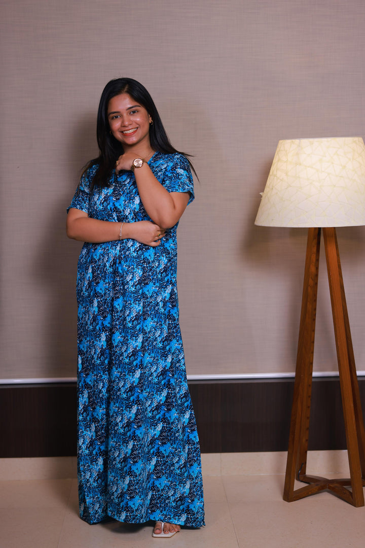 Dark Blue With White Flower Design Invisible Center Zip Feeding Nighty