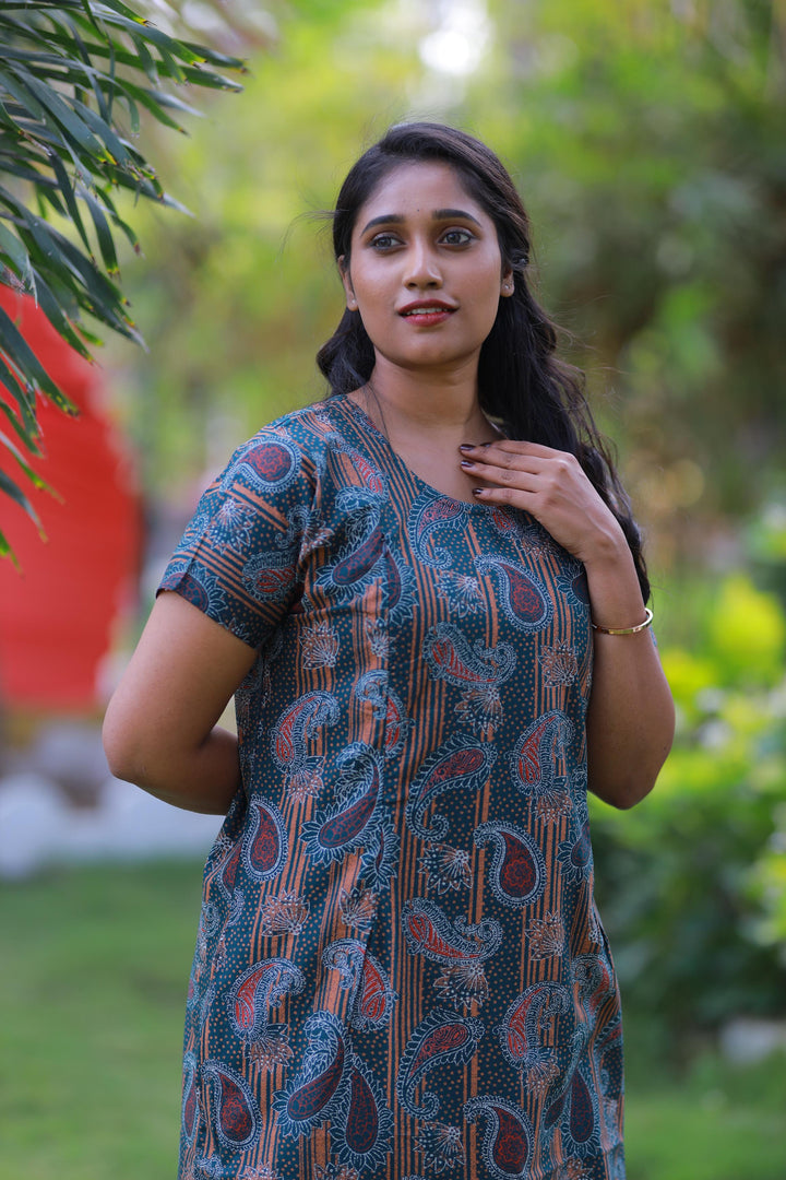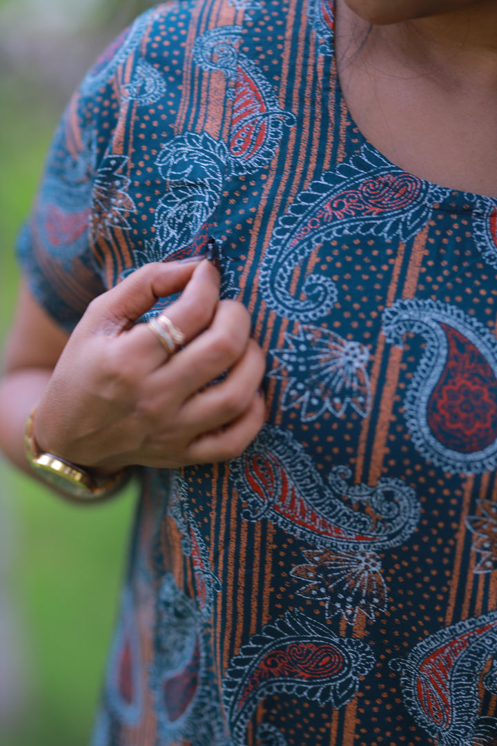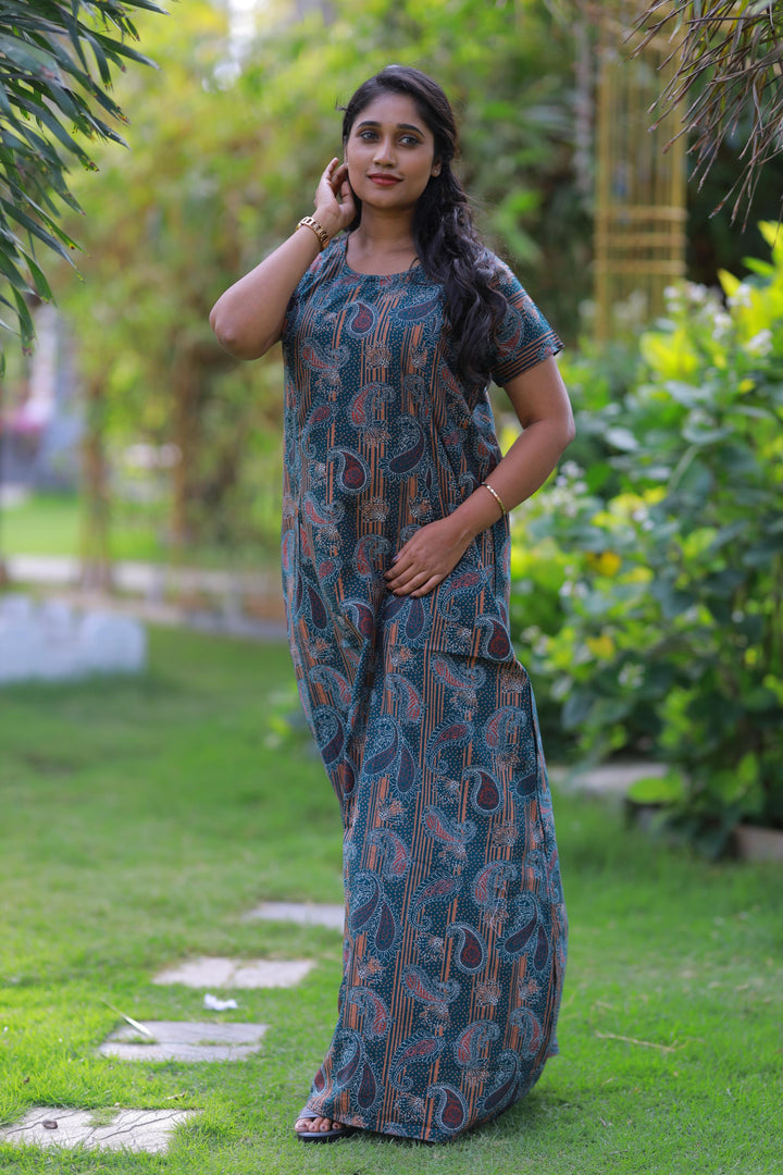 Dark Green With Orange and White Mehandi Design Vertical Side Zip Feeding Nighty