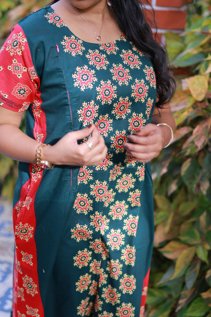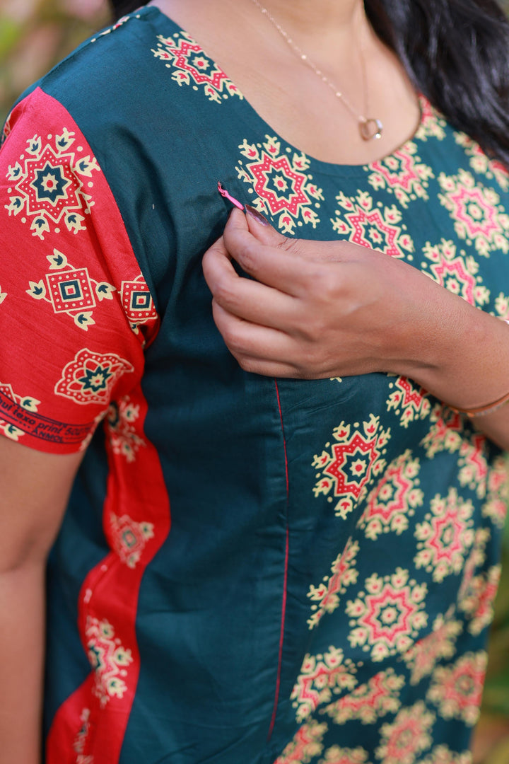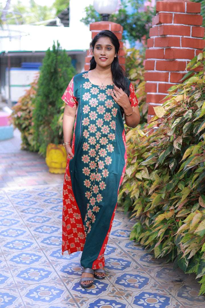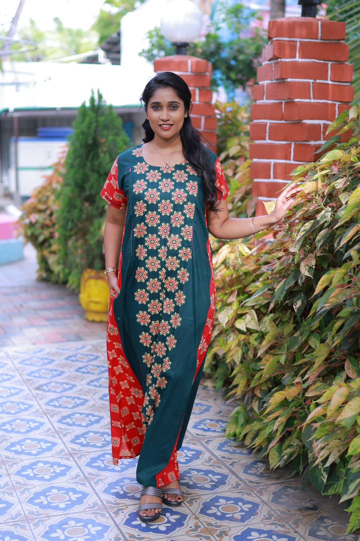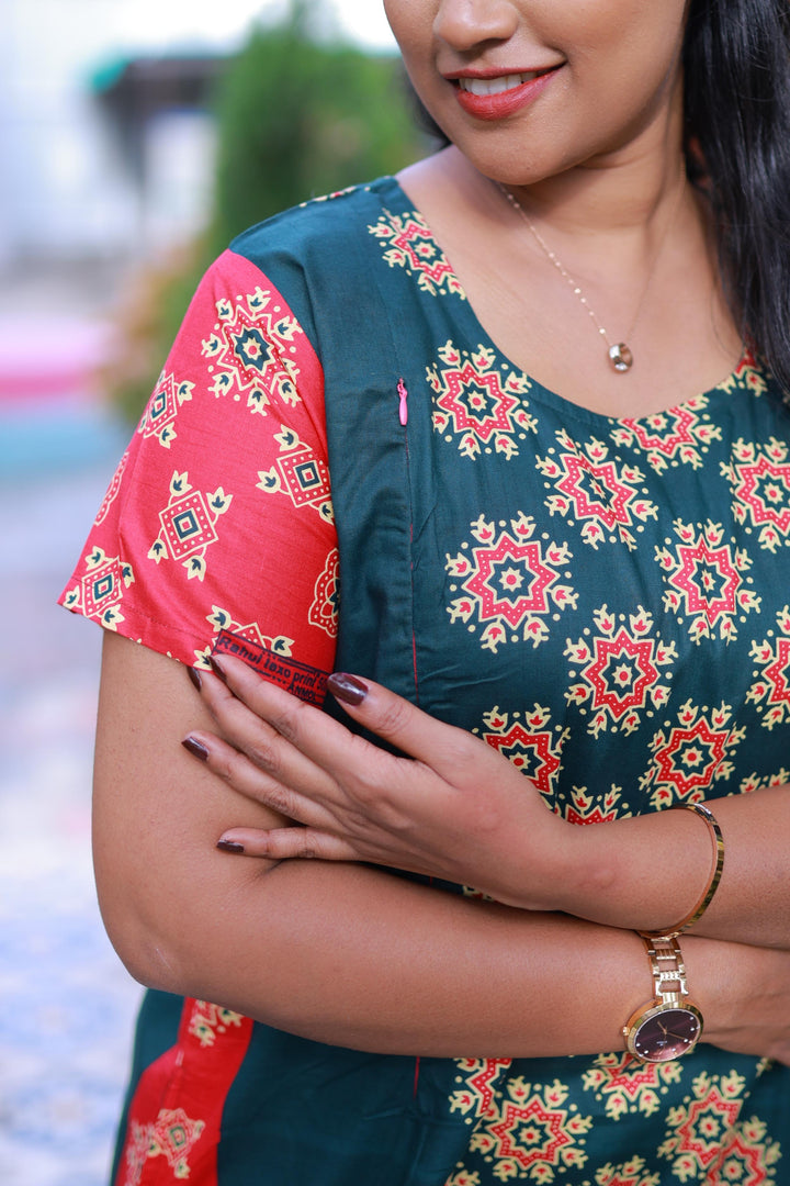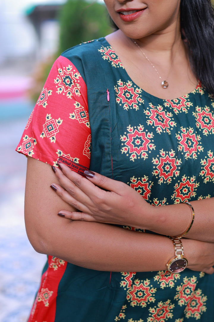 Dark Green With Pink Flower Design Vertical Side Zip Feeding Nighty