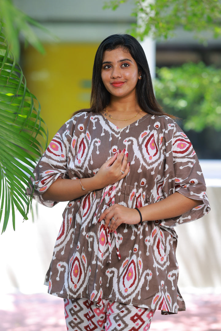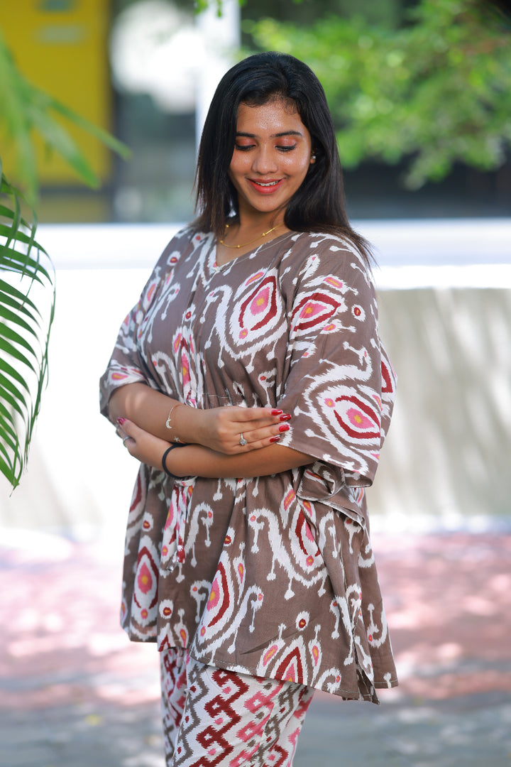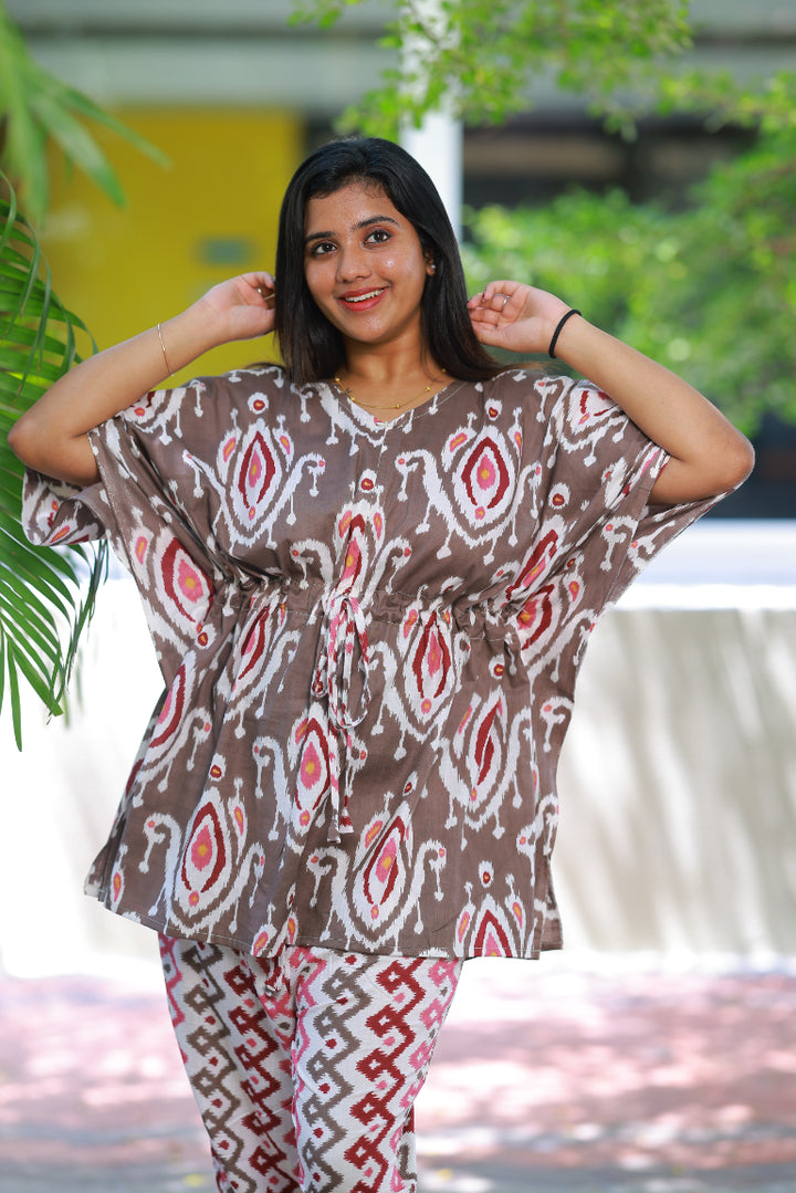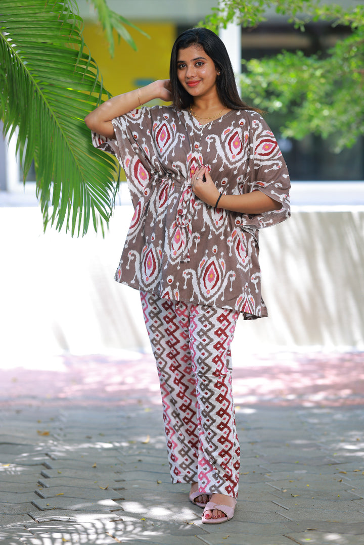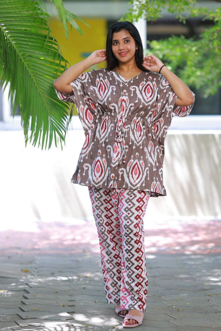 Dark maroon Ikat Pretty Jaipur cotton kaftan with pyjamas set ( 2 pcs set )