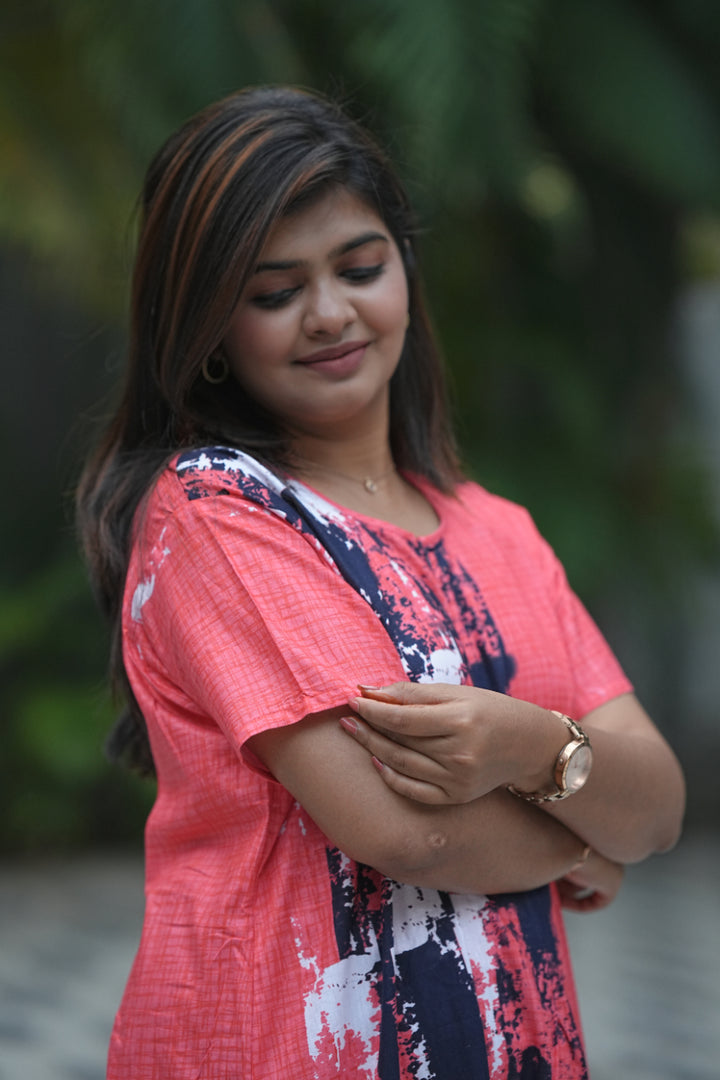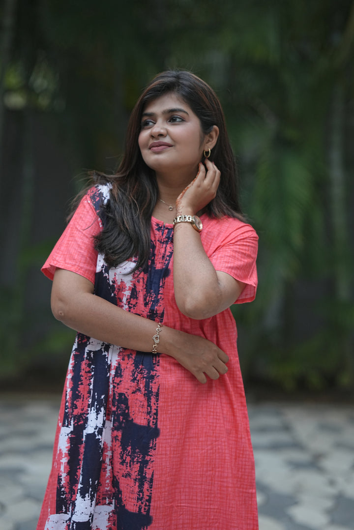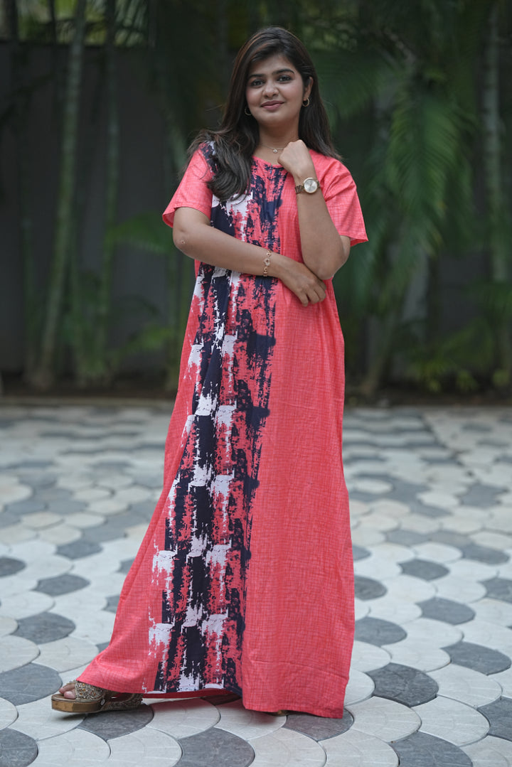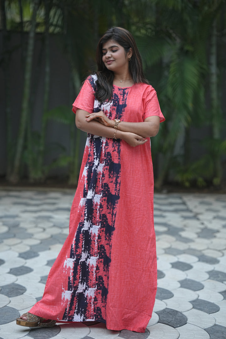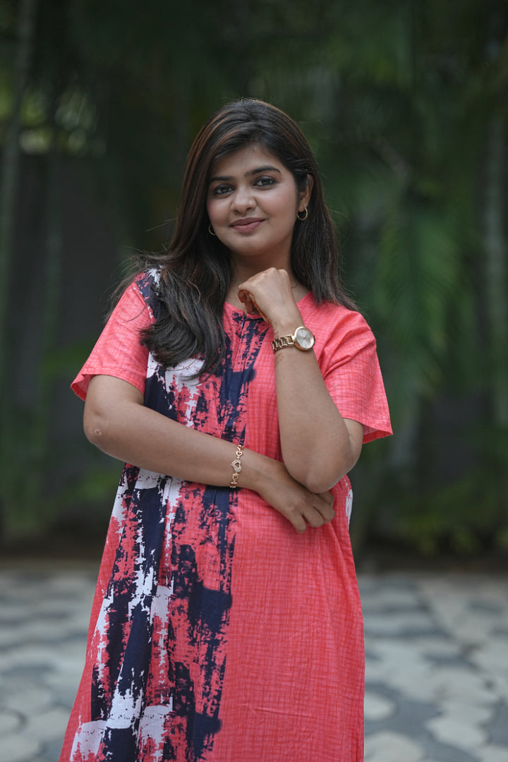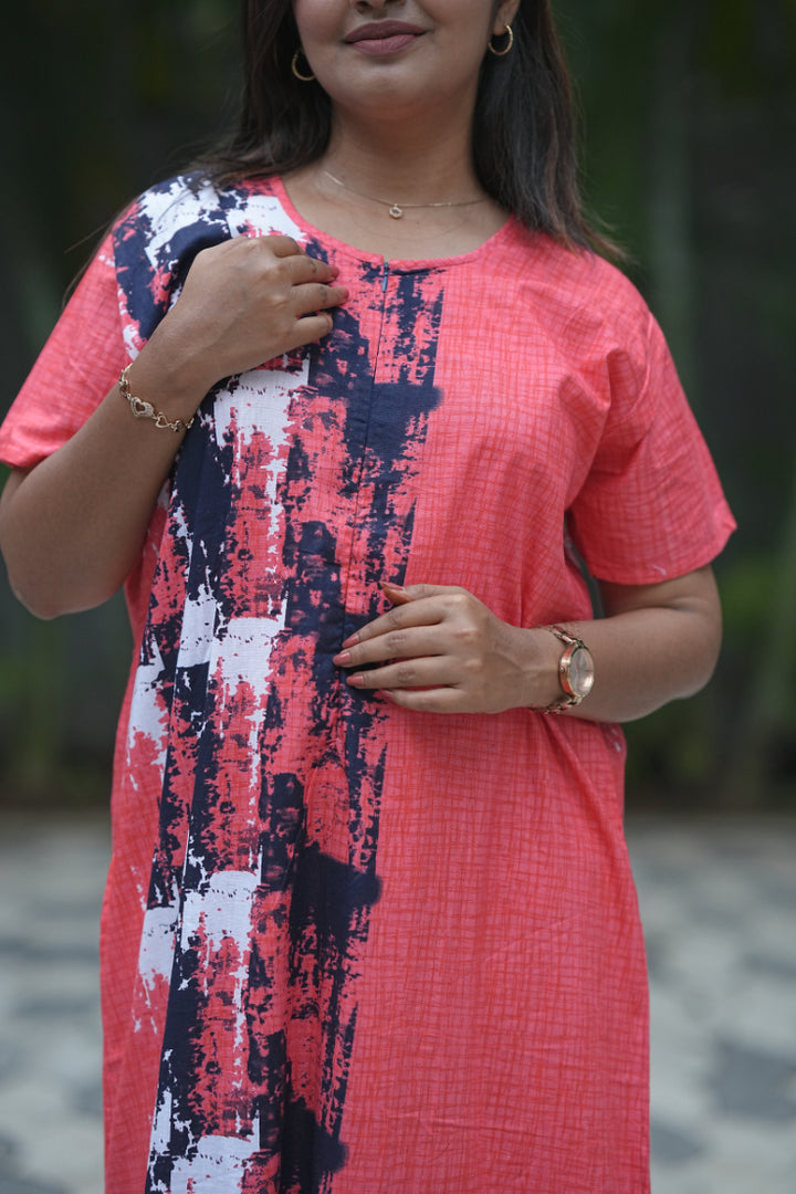 Pinkish Red With Navy Blue Invisible Center Zip Feeding Nighty