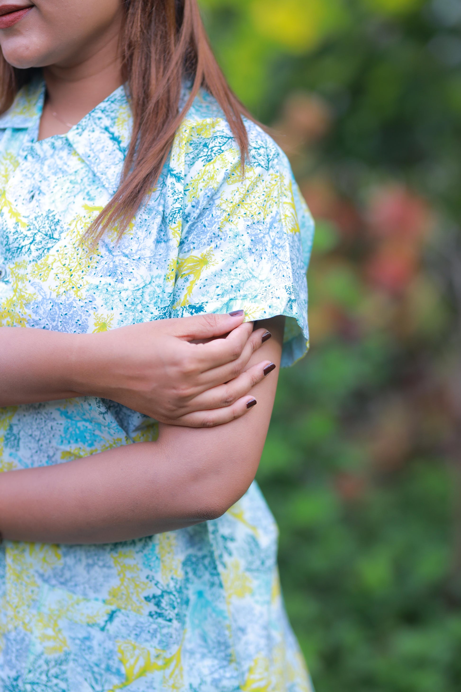 FANCY - Yellow With Sky Blue full button collar type Nightdress