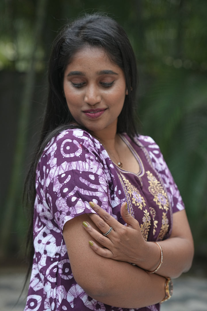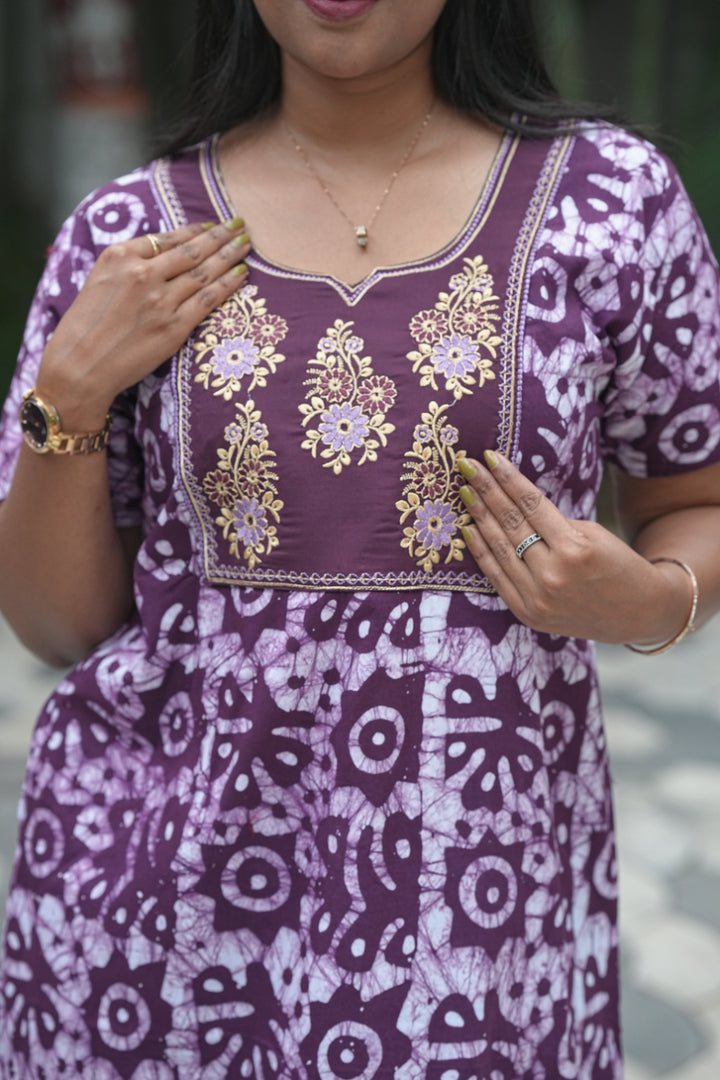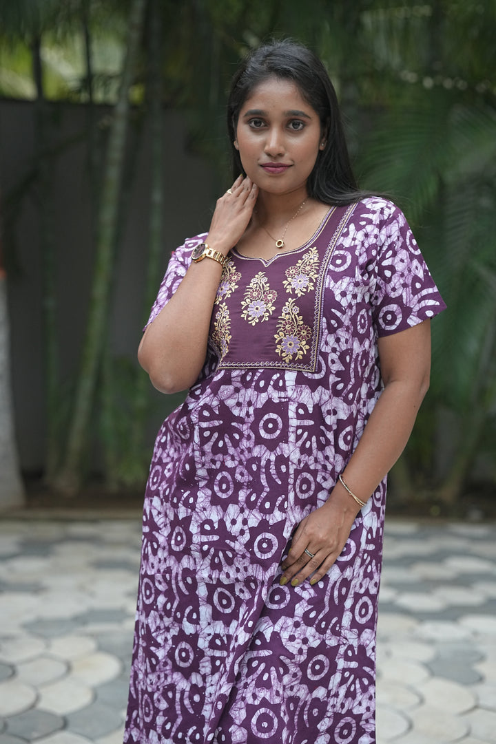 Purple Batik Cotton Front Embroidery Nighty