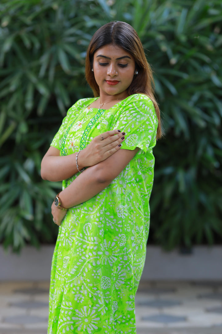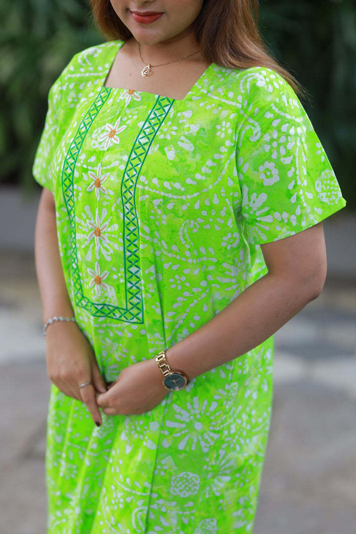 Green With White Pure Cotton Batik Nighty With Elegent Embroidery Design