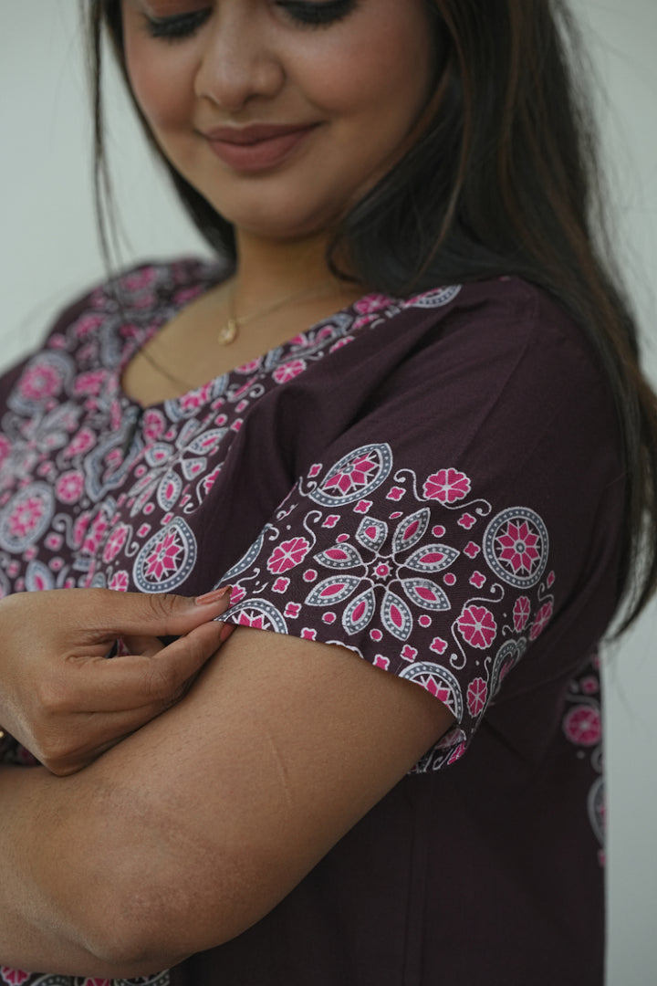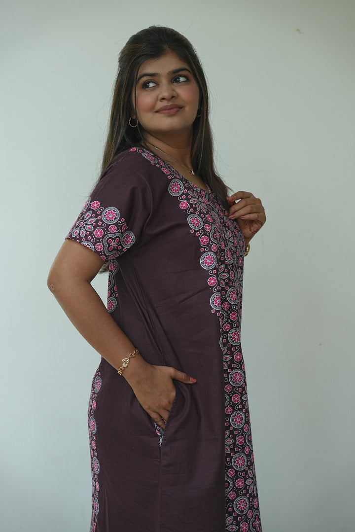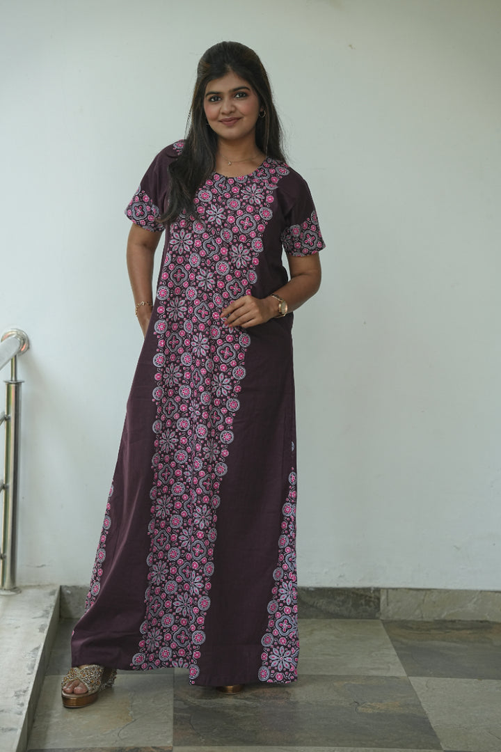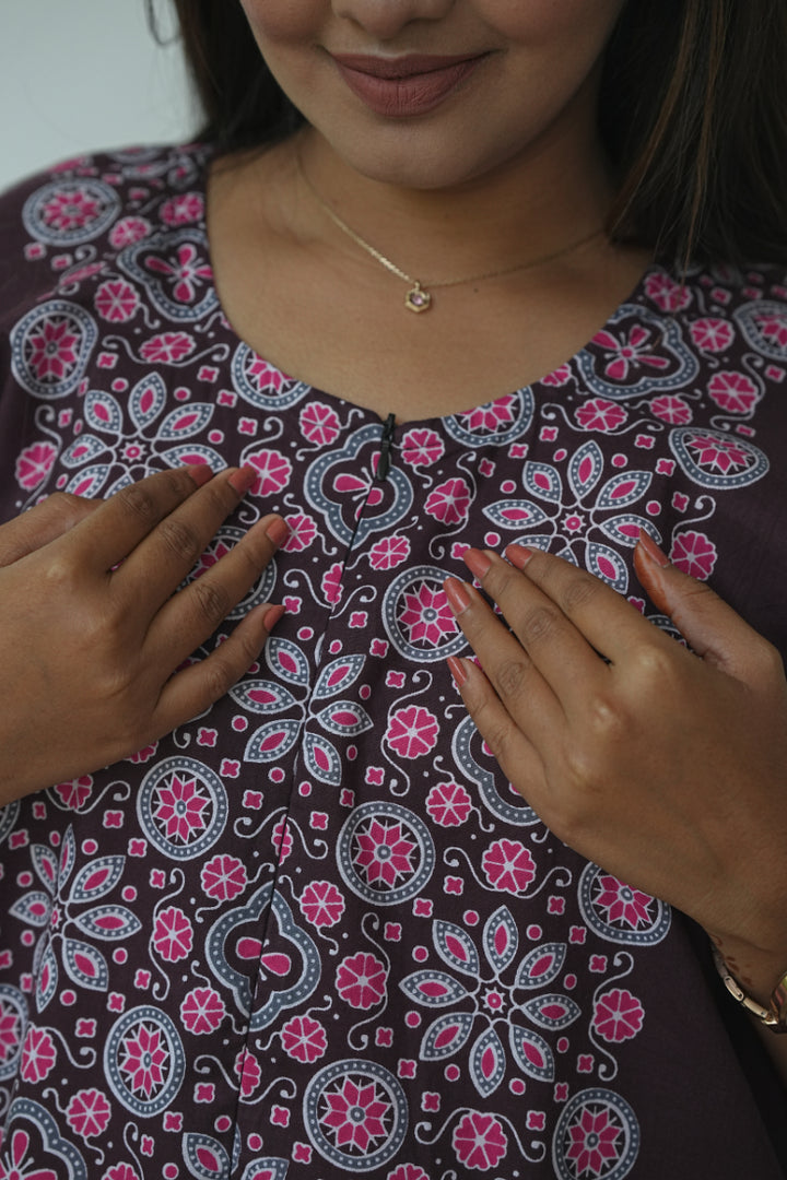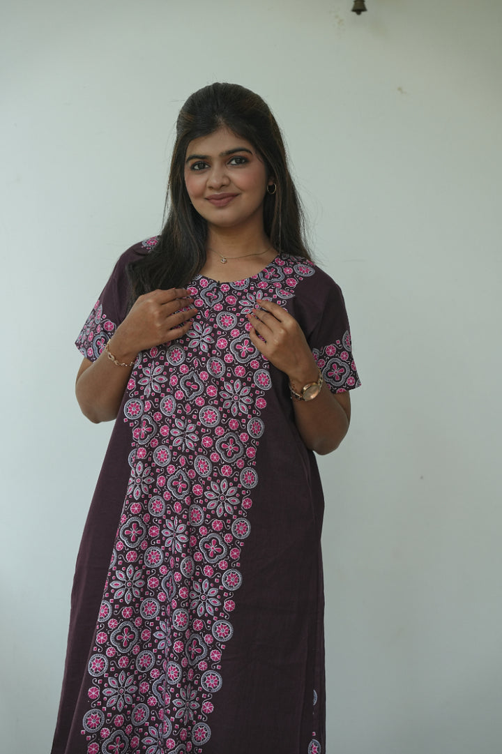 Dark Maroon With Gray Floral Invisible Center Zip Feeding Nighty