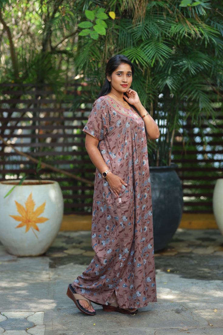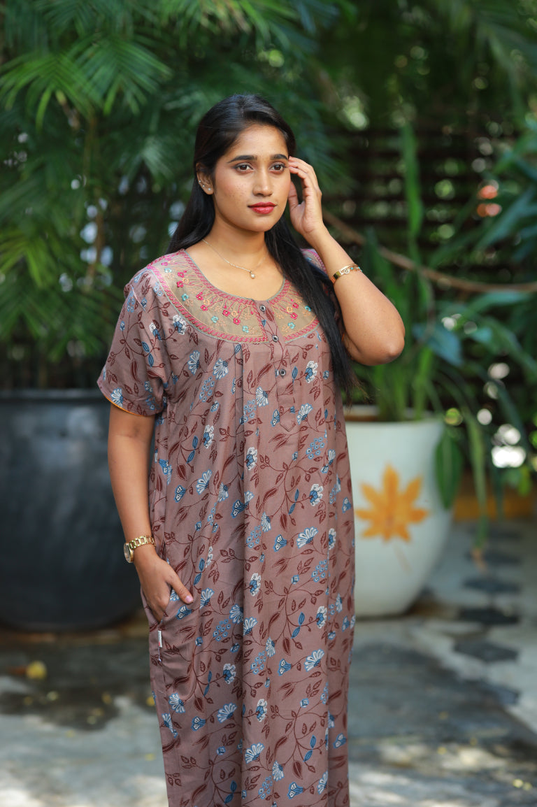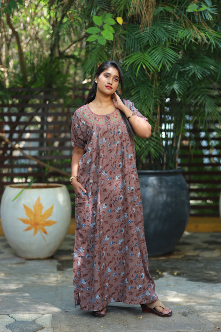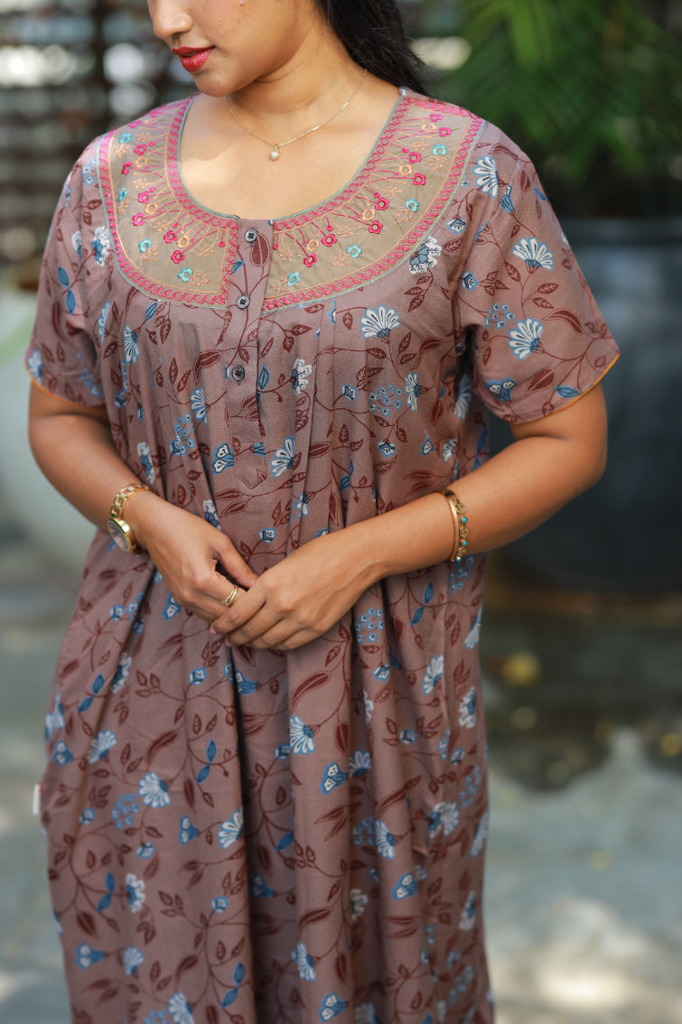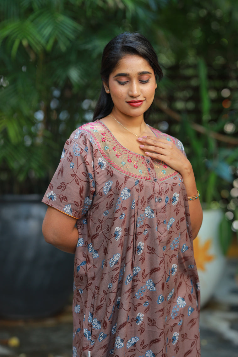 Chocolate Brown Floral Neck Embroidery Alphine Nighty