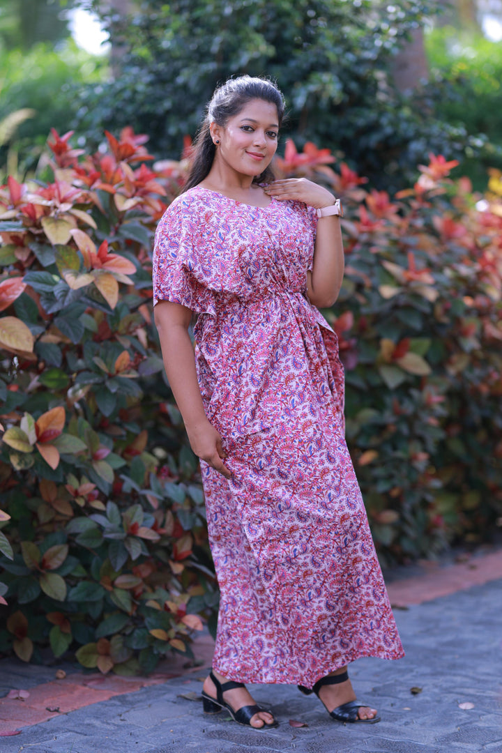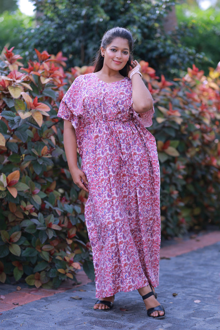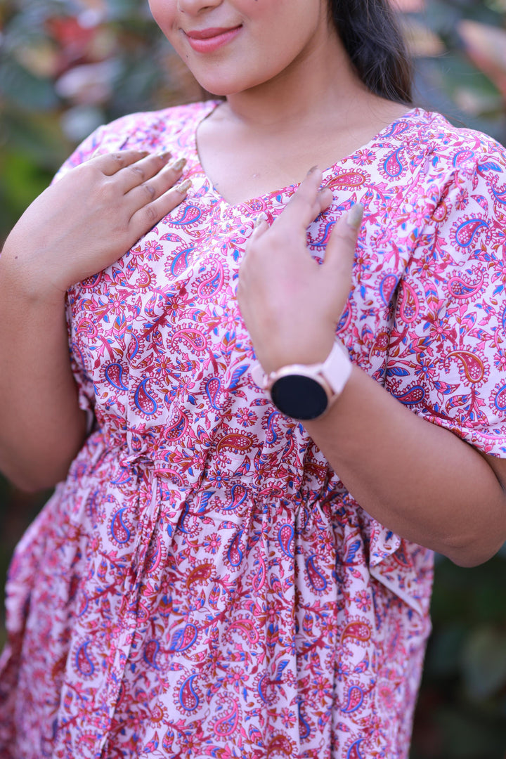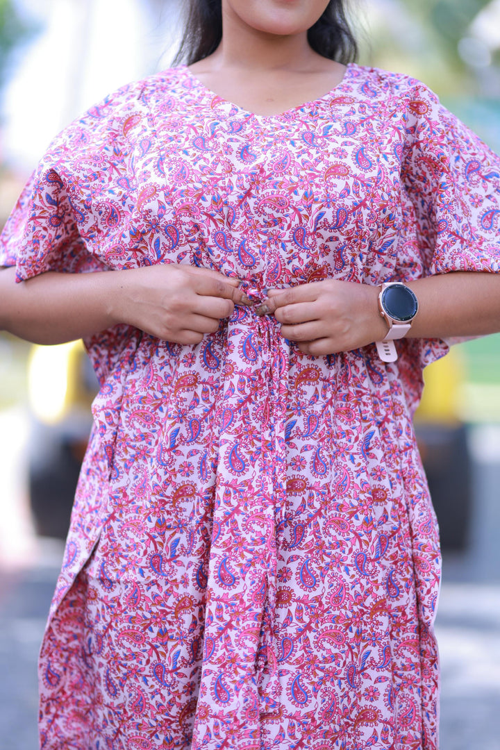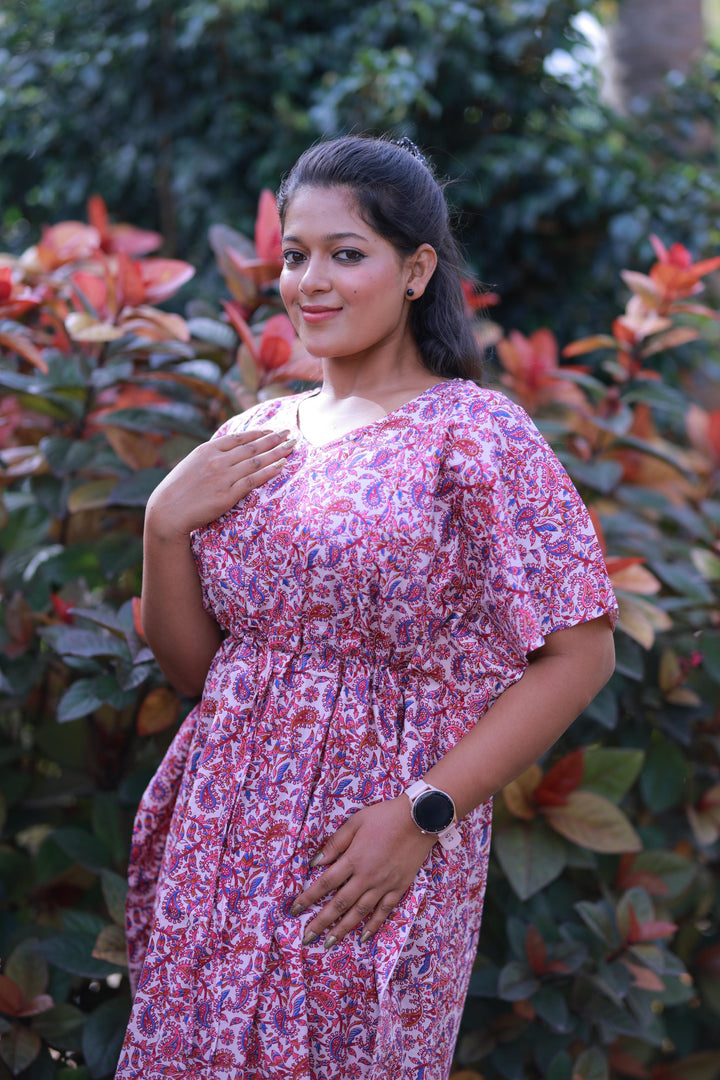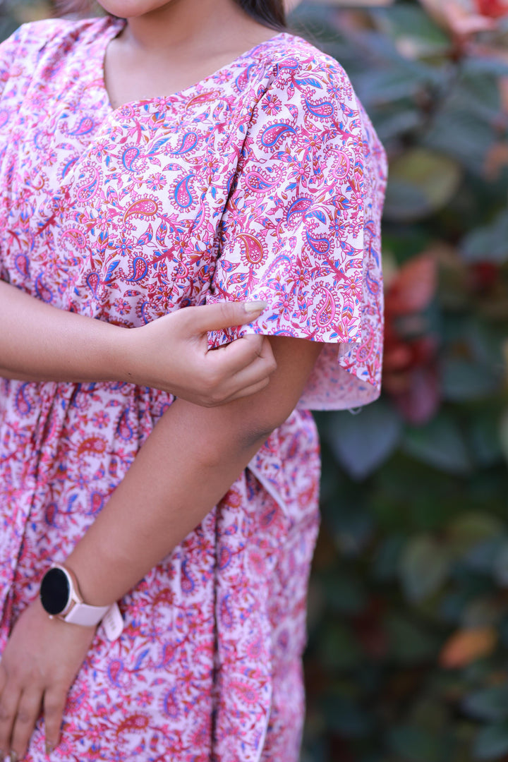 Purple With Pink Kalamkari Design kaftan with feeding side zip