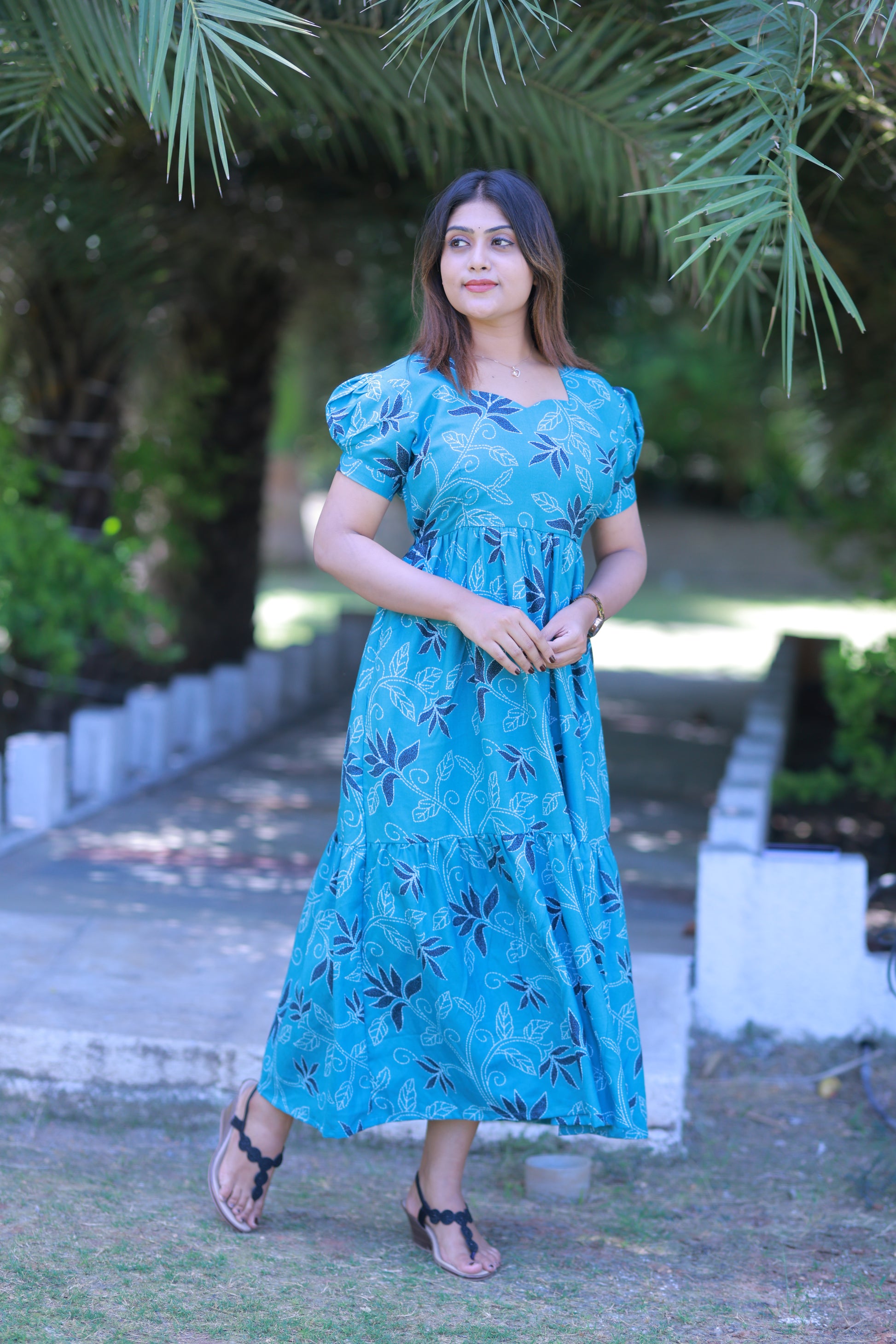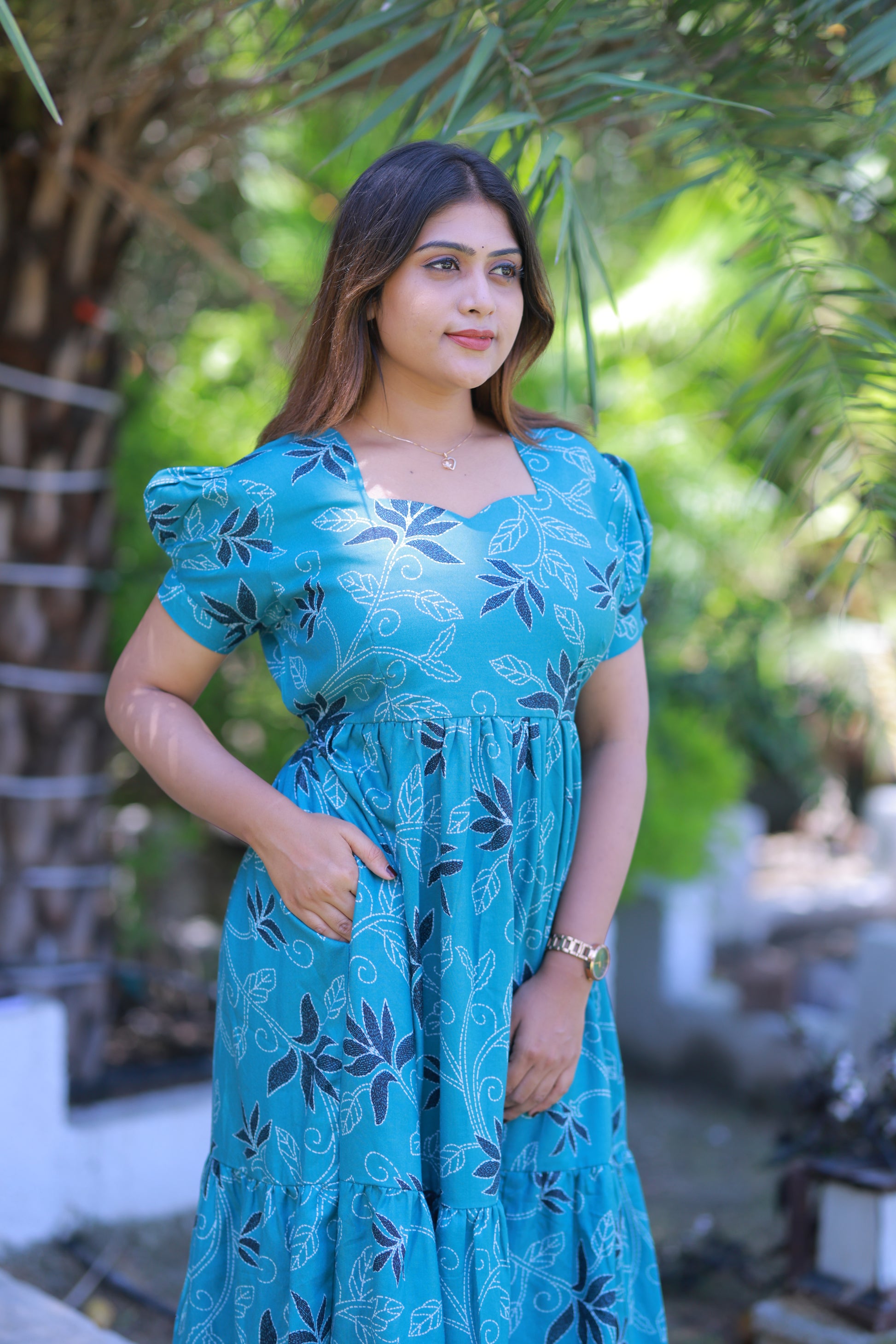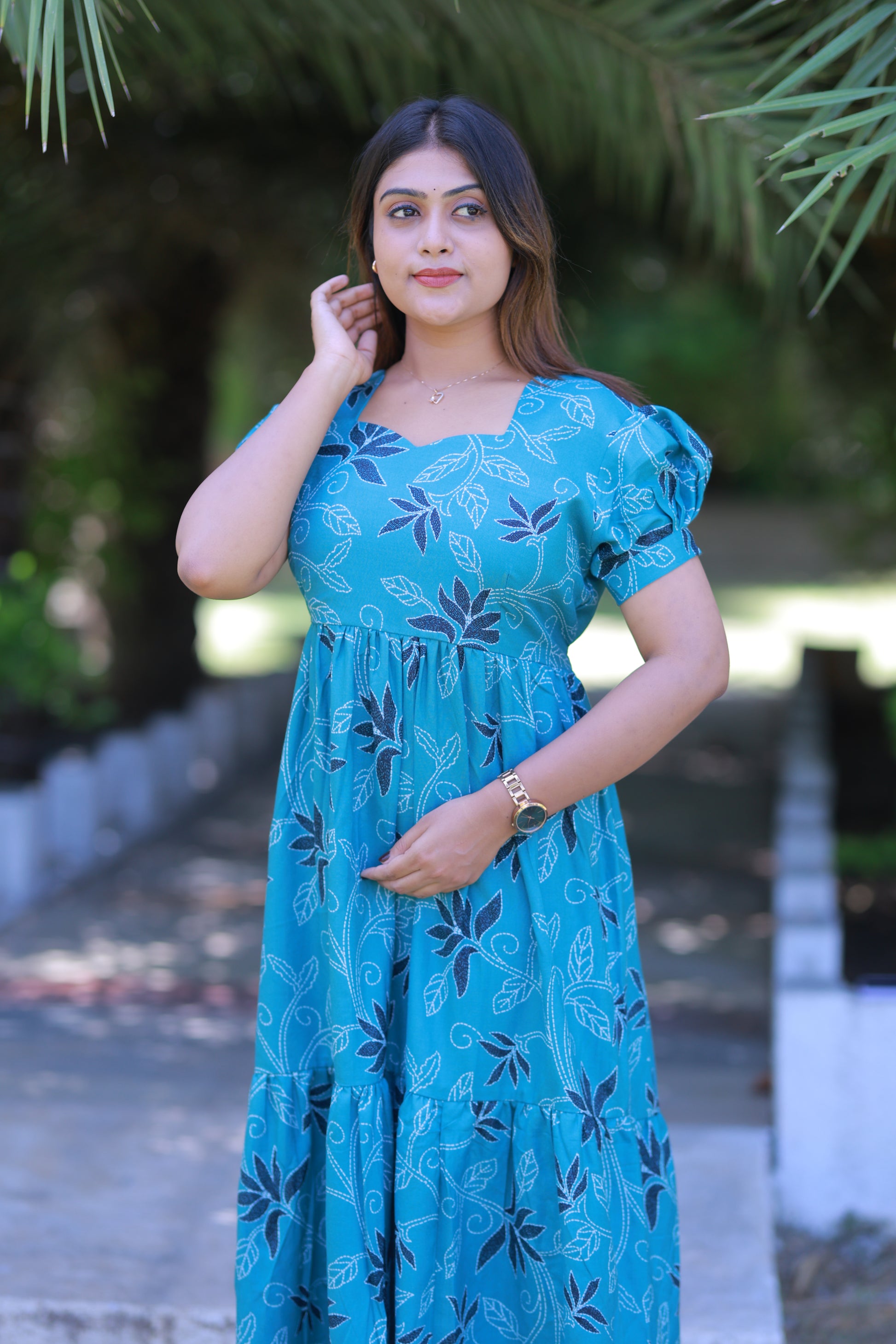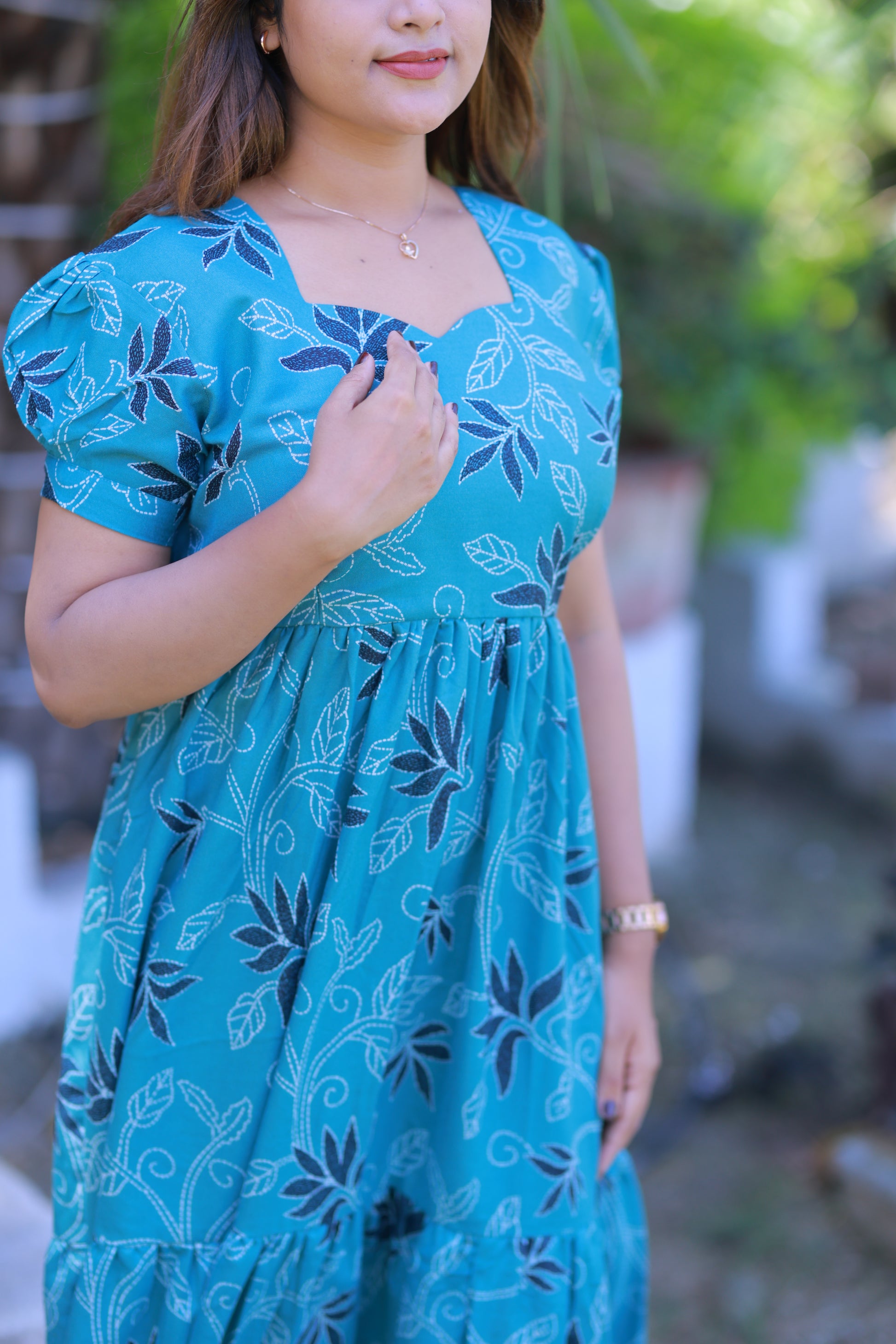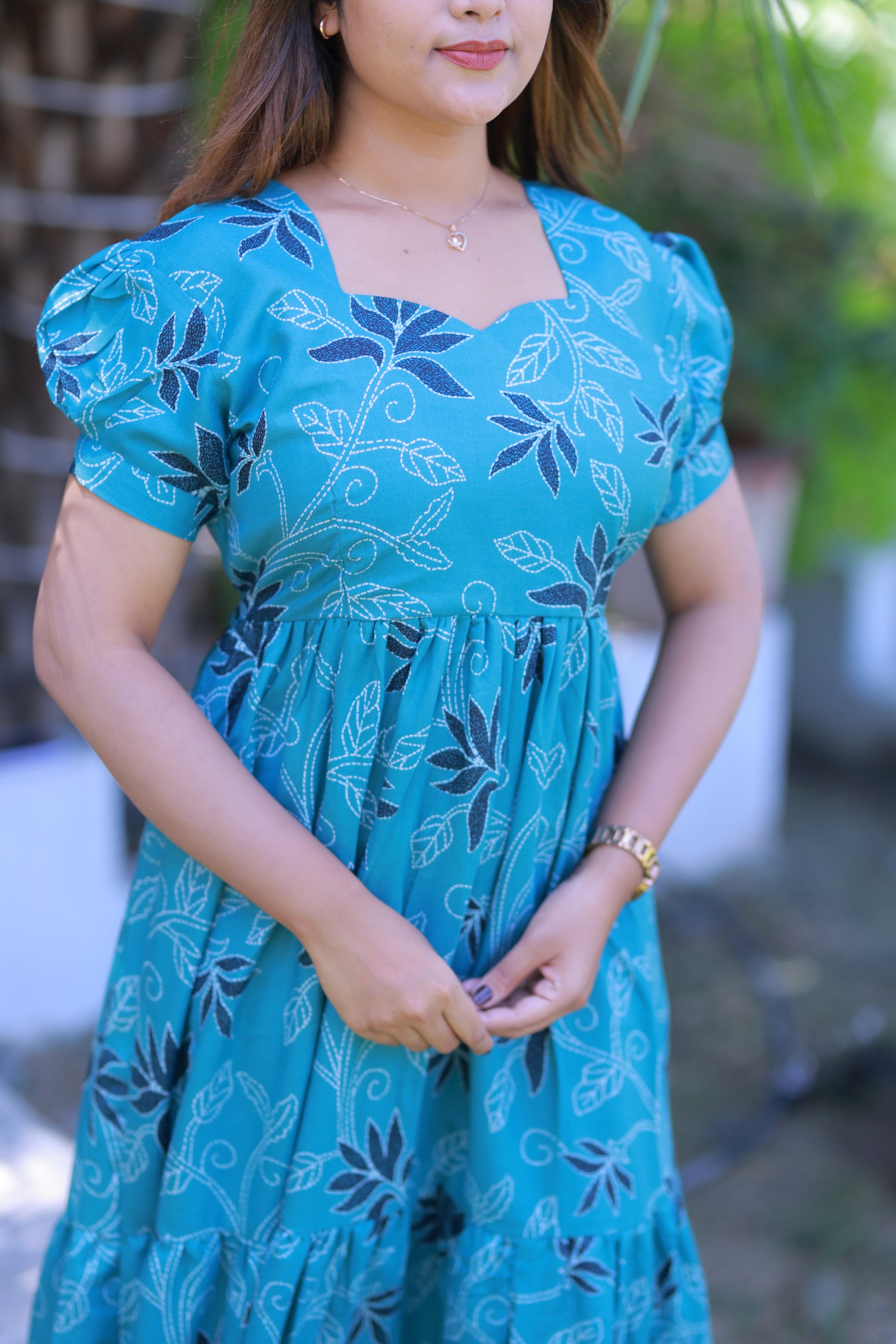 Ramar Green with White Leaf design Double Layer Alphine Without zip Frock
