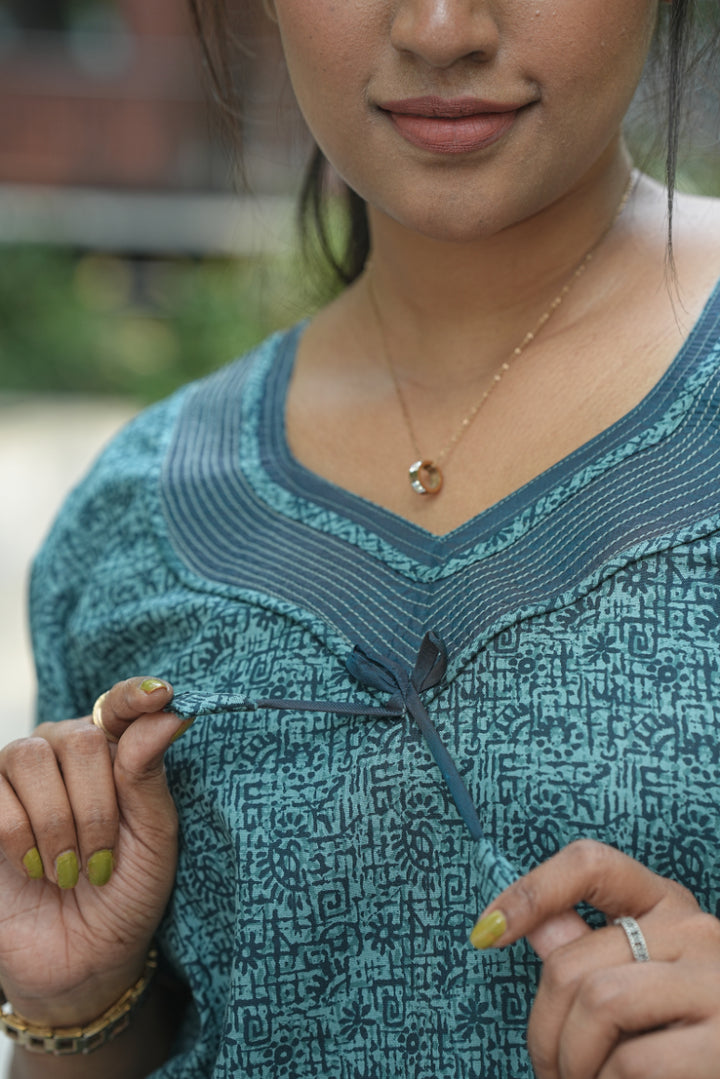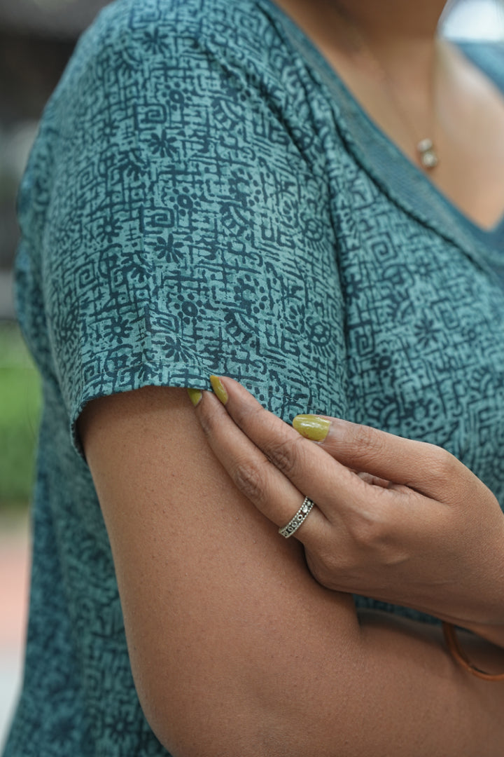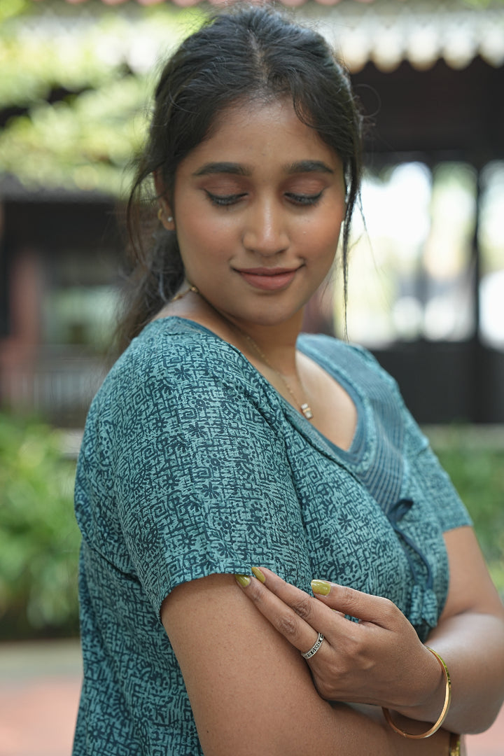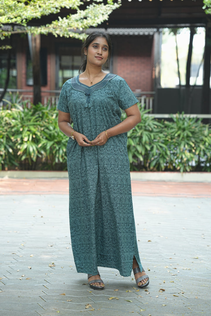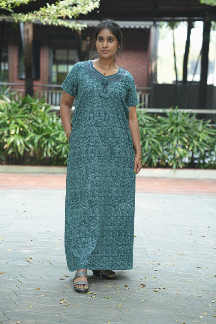 Teal Green With Dark Green Floral Design Zipless Nighty