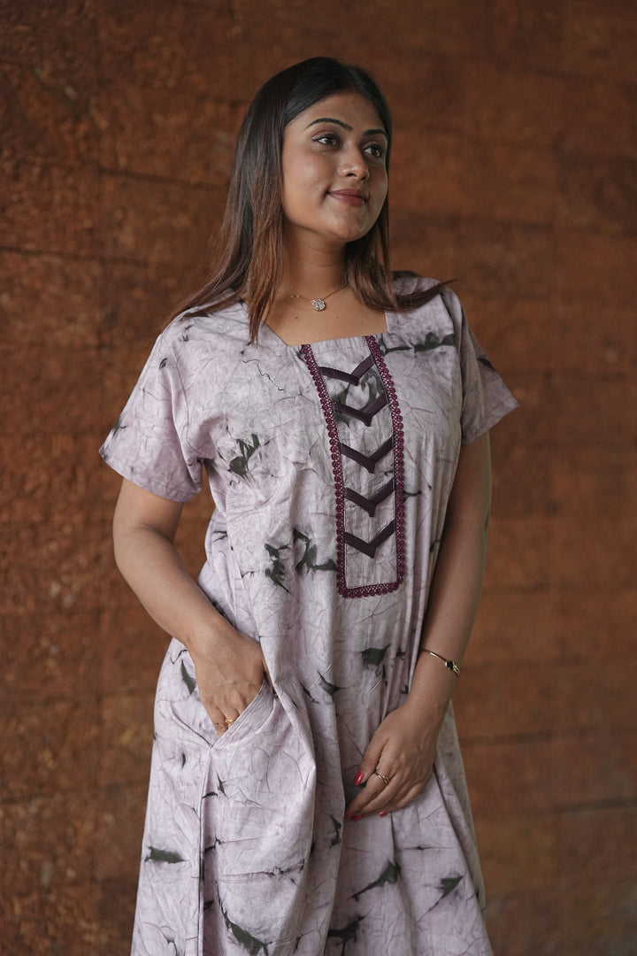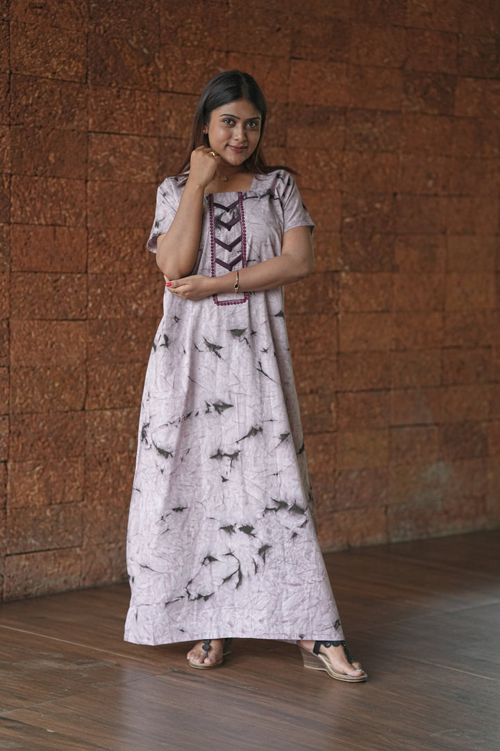 Light Maroon with Neck Design Tie and Dye Design Without Zip Nighty