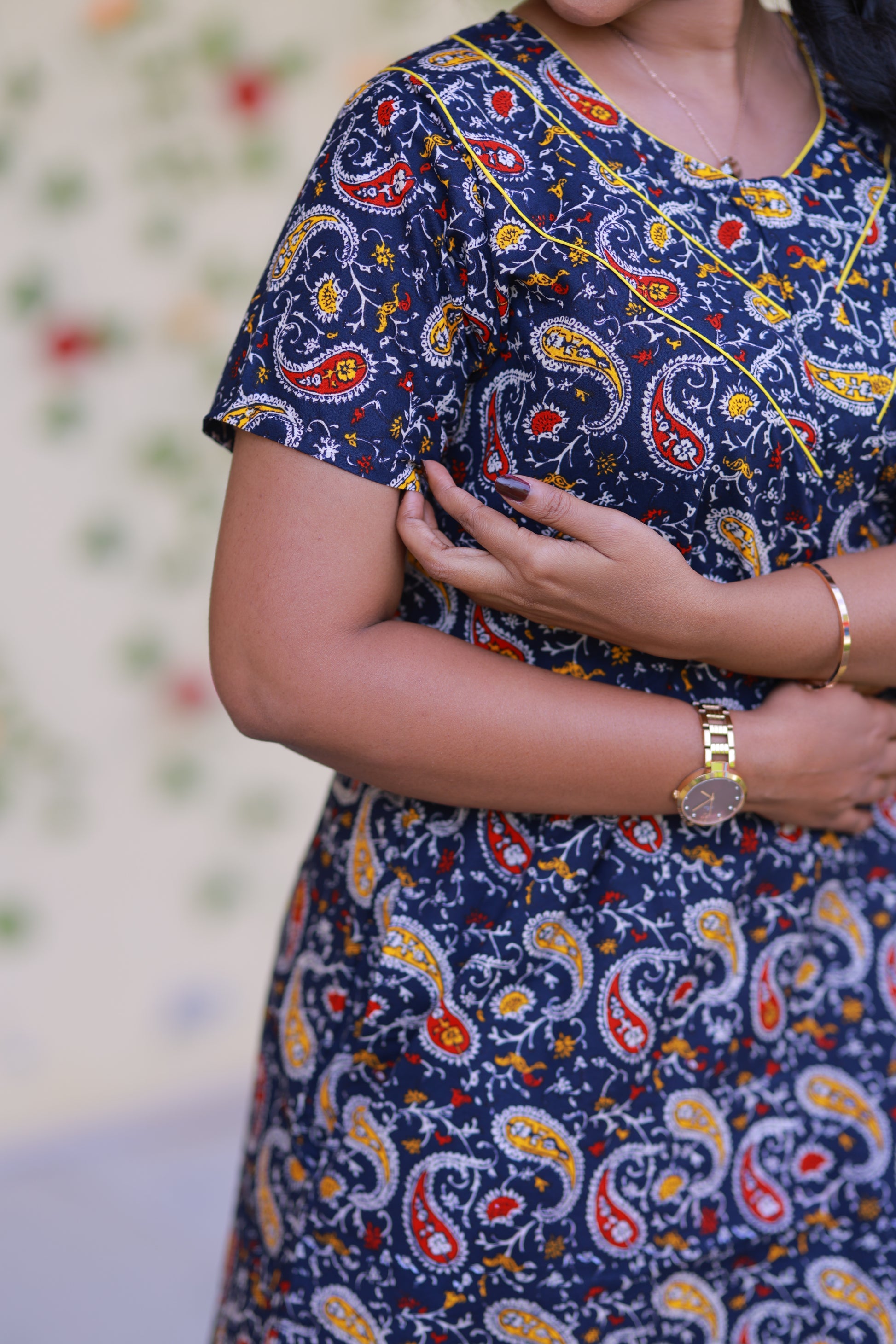 Drak Blue With Red Kalamkari Flower Design Piping Center Zip Nighty