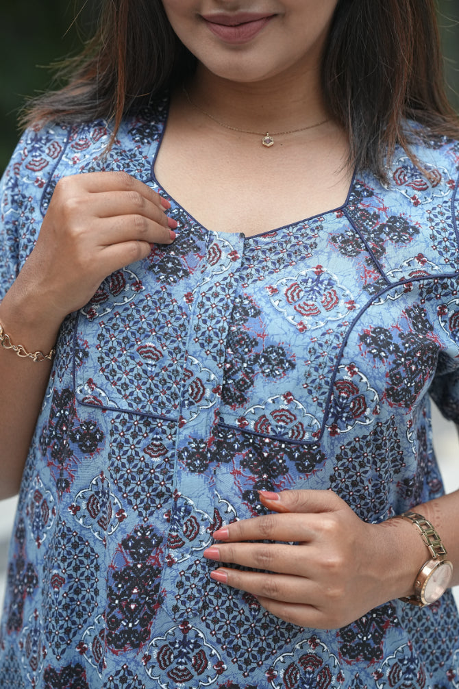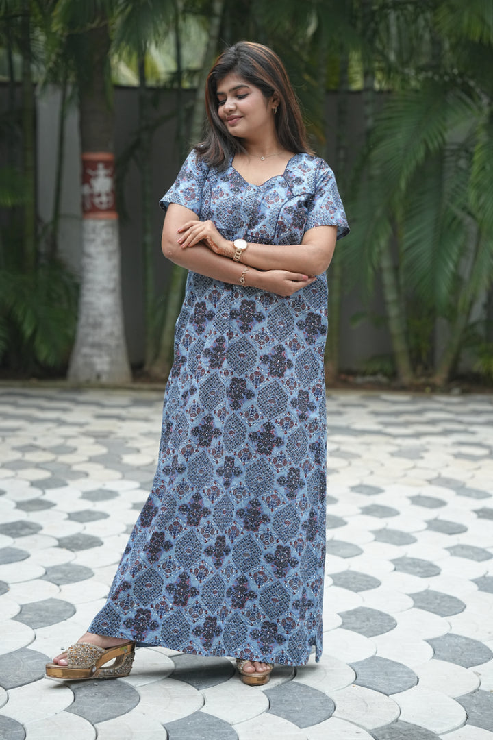 Light Blue With Gray Floral Design Piping Center Zip Nighty