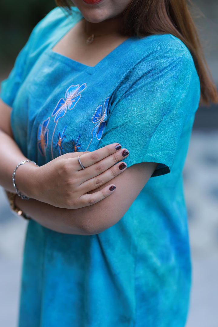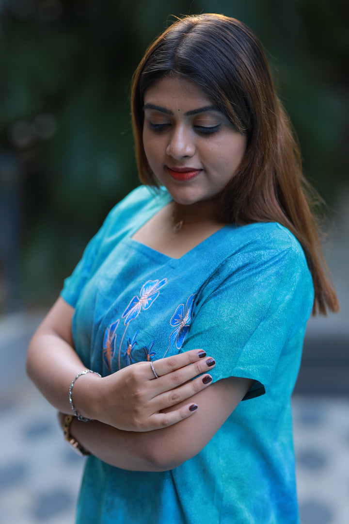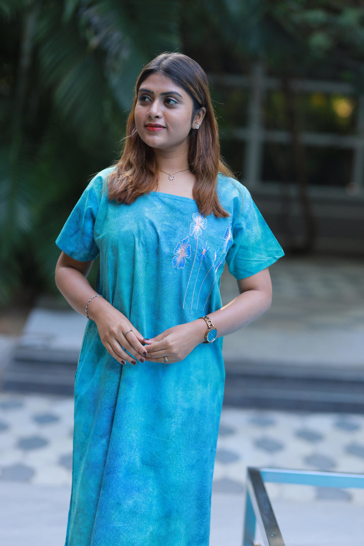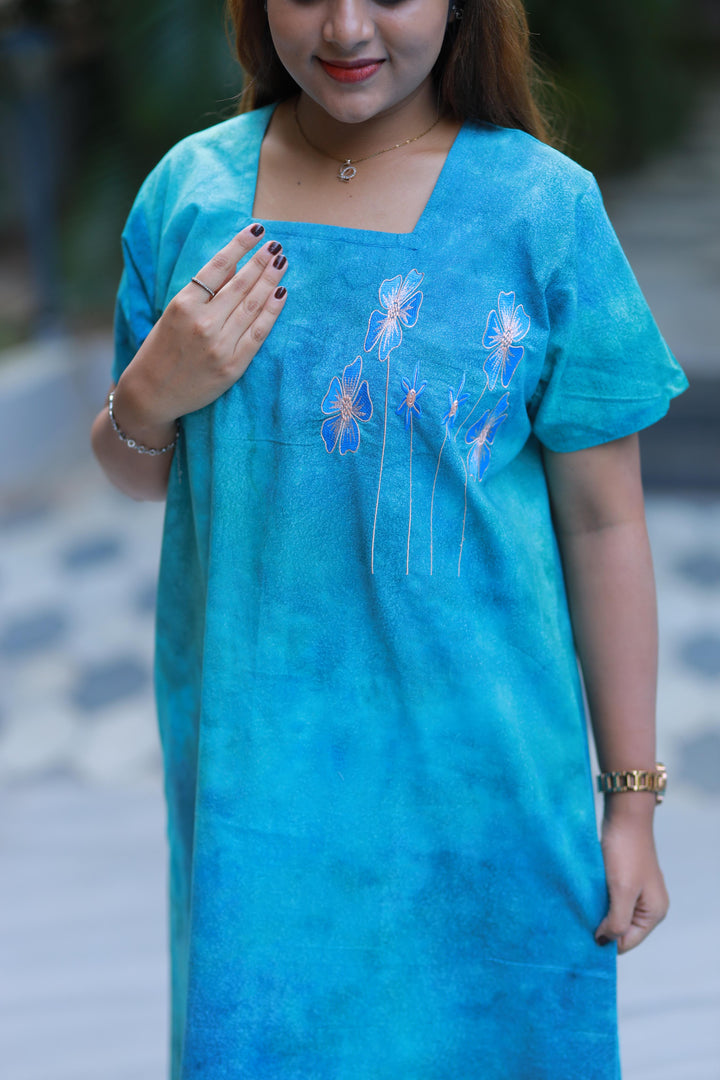 Light Shade Of Green Pure Cotton Batik Nighty With Elegent Embroidery Design