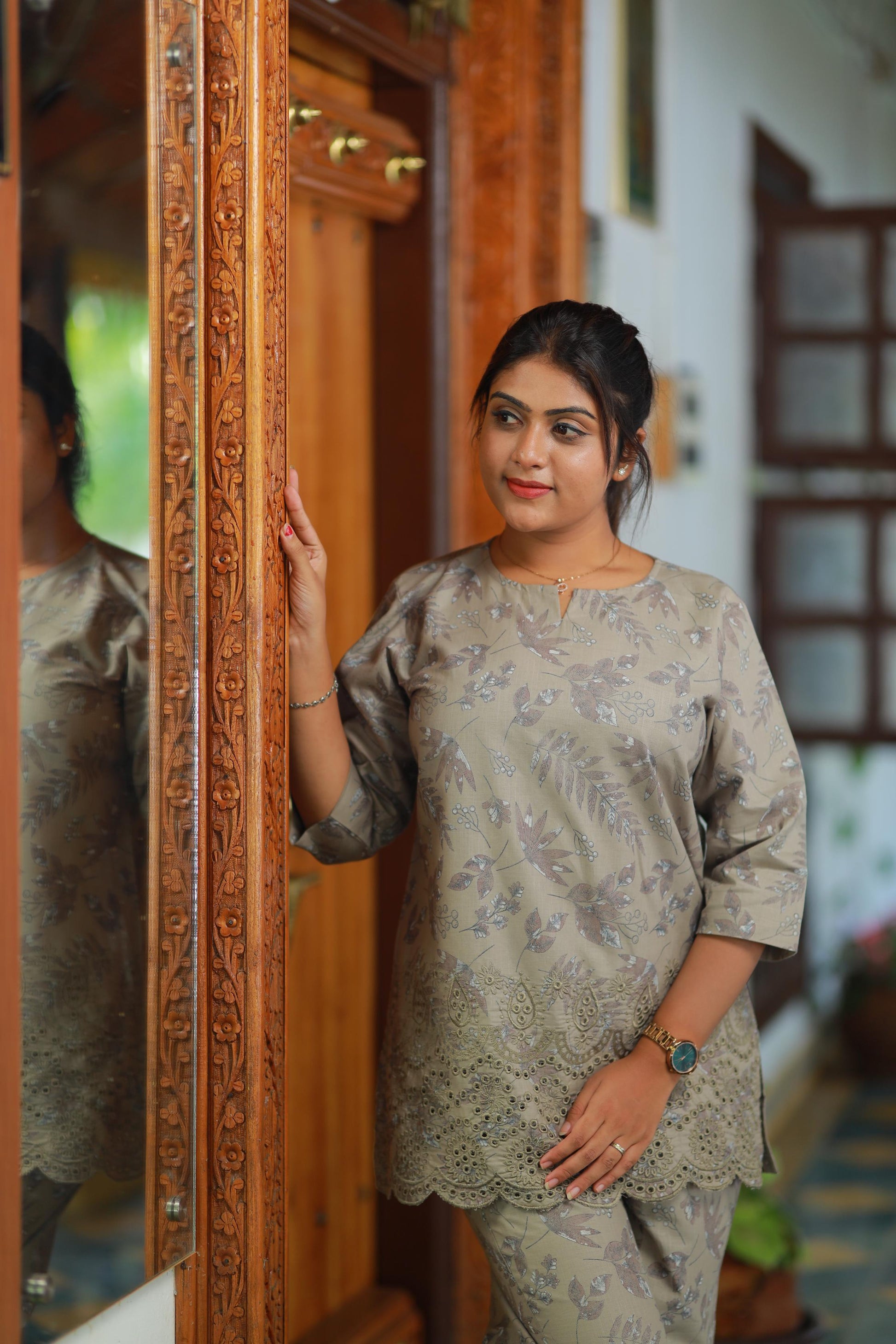 Linen Grey with leaf design embroidery co-ord set nightdress