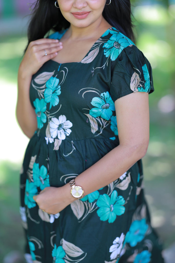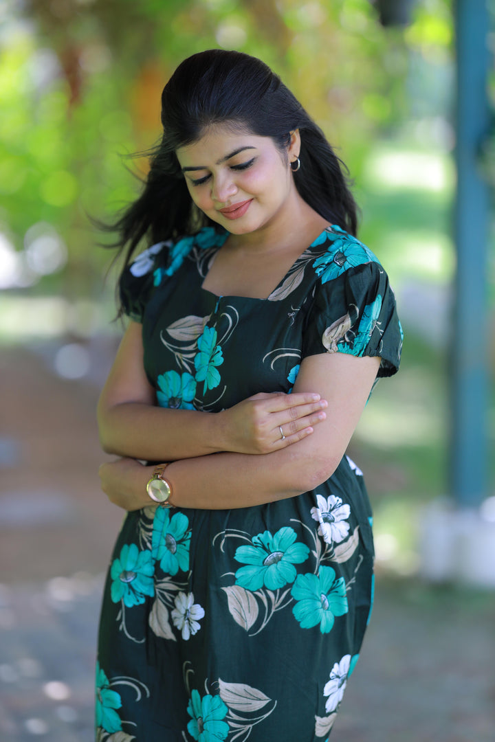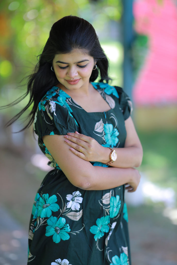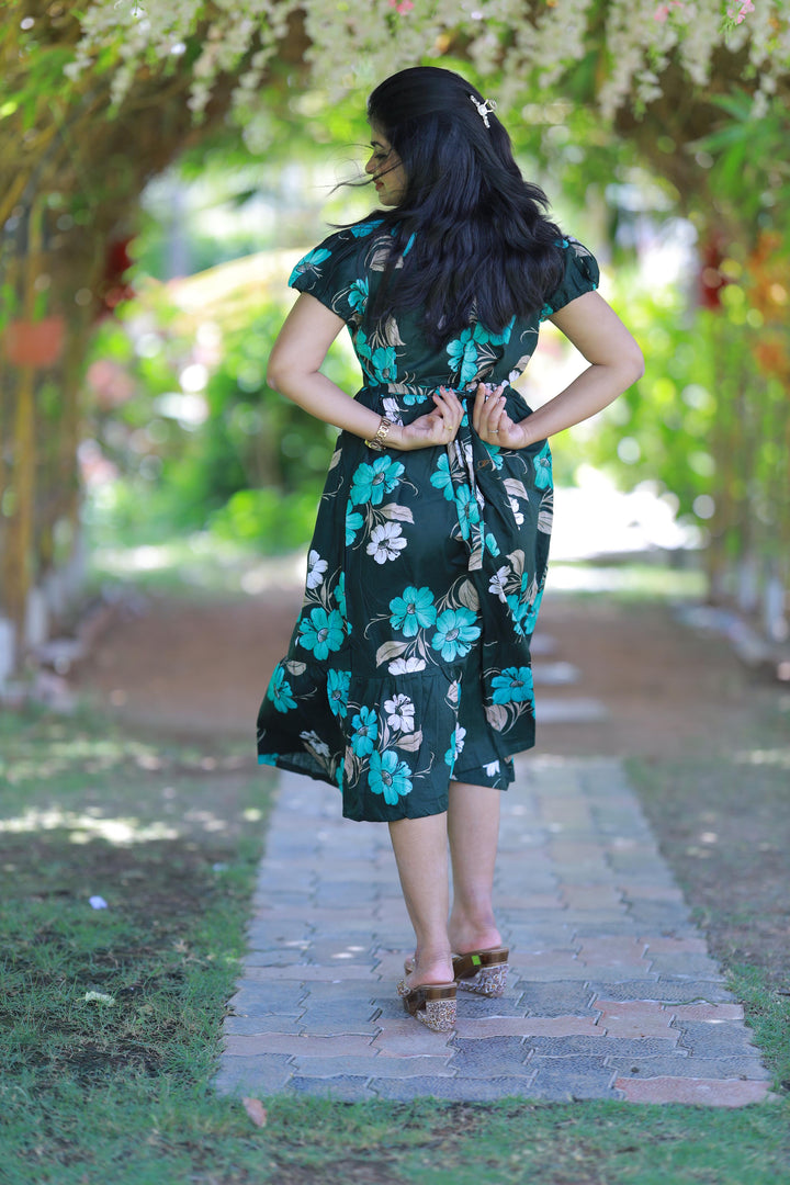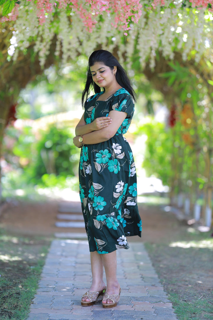 Dark Green With Green and Sandal flower Design Midi Length center zip frock