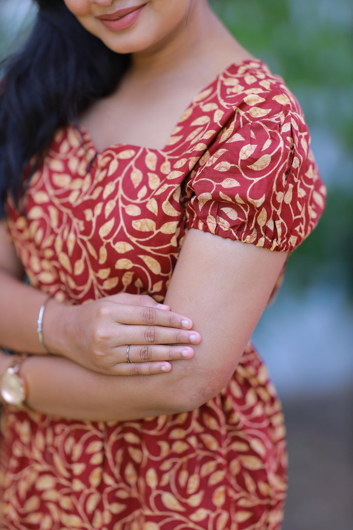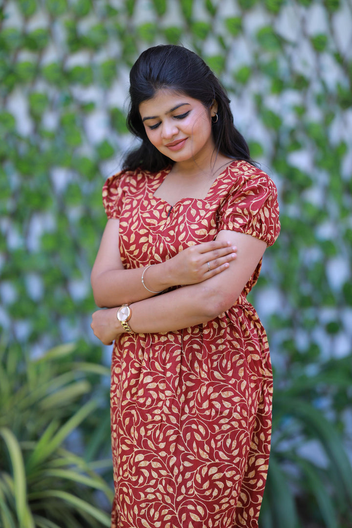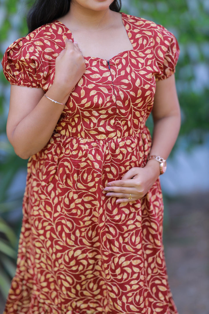 Maroon With Yellow Leaf Design Midi Length center zip frock