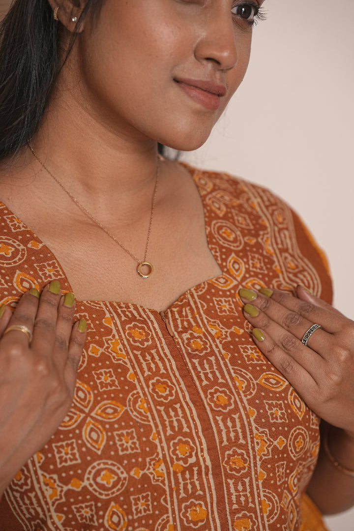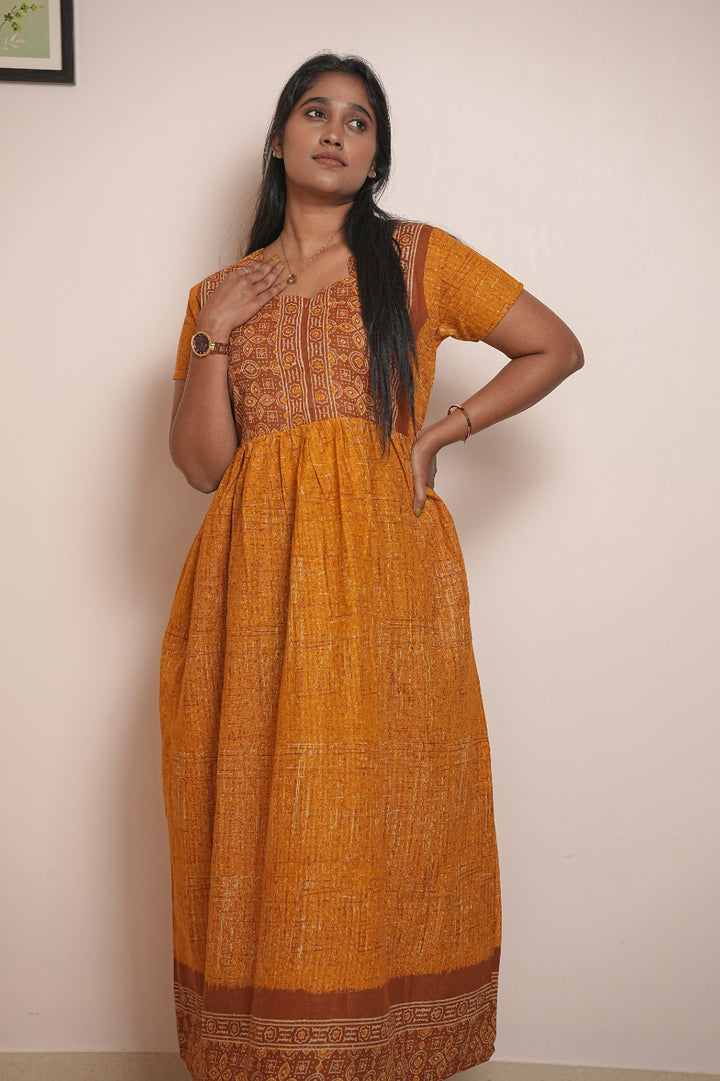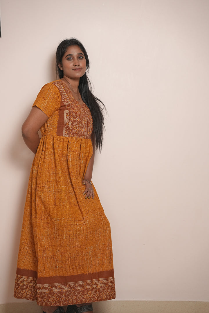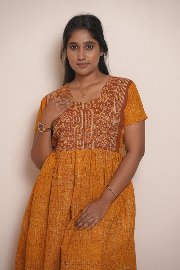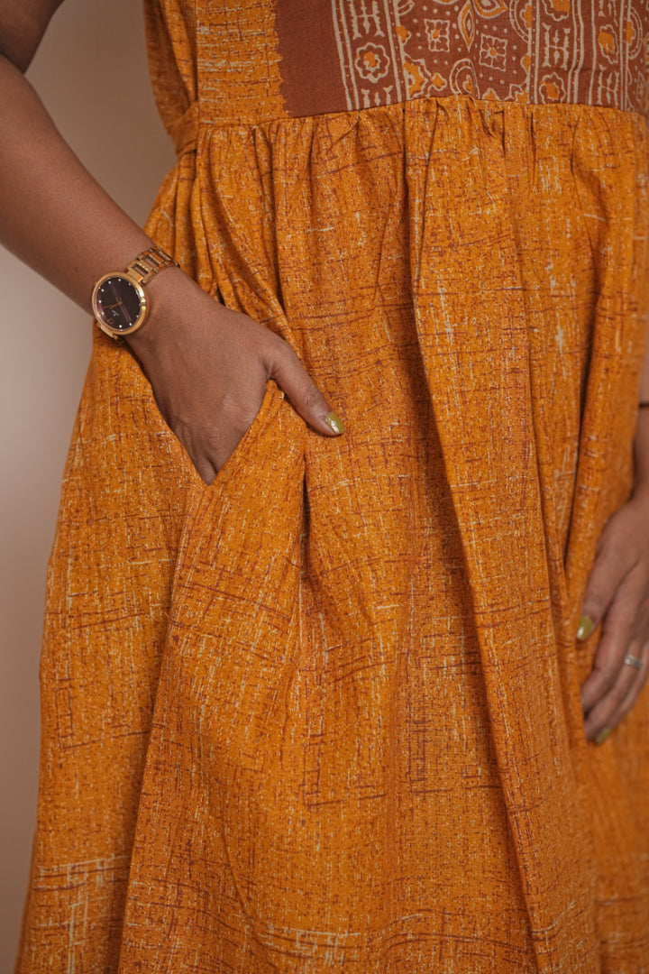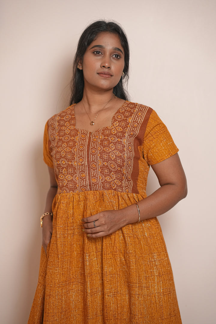 Yellow Ajrakh fabric Center Zip Frock