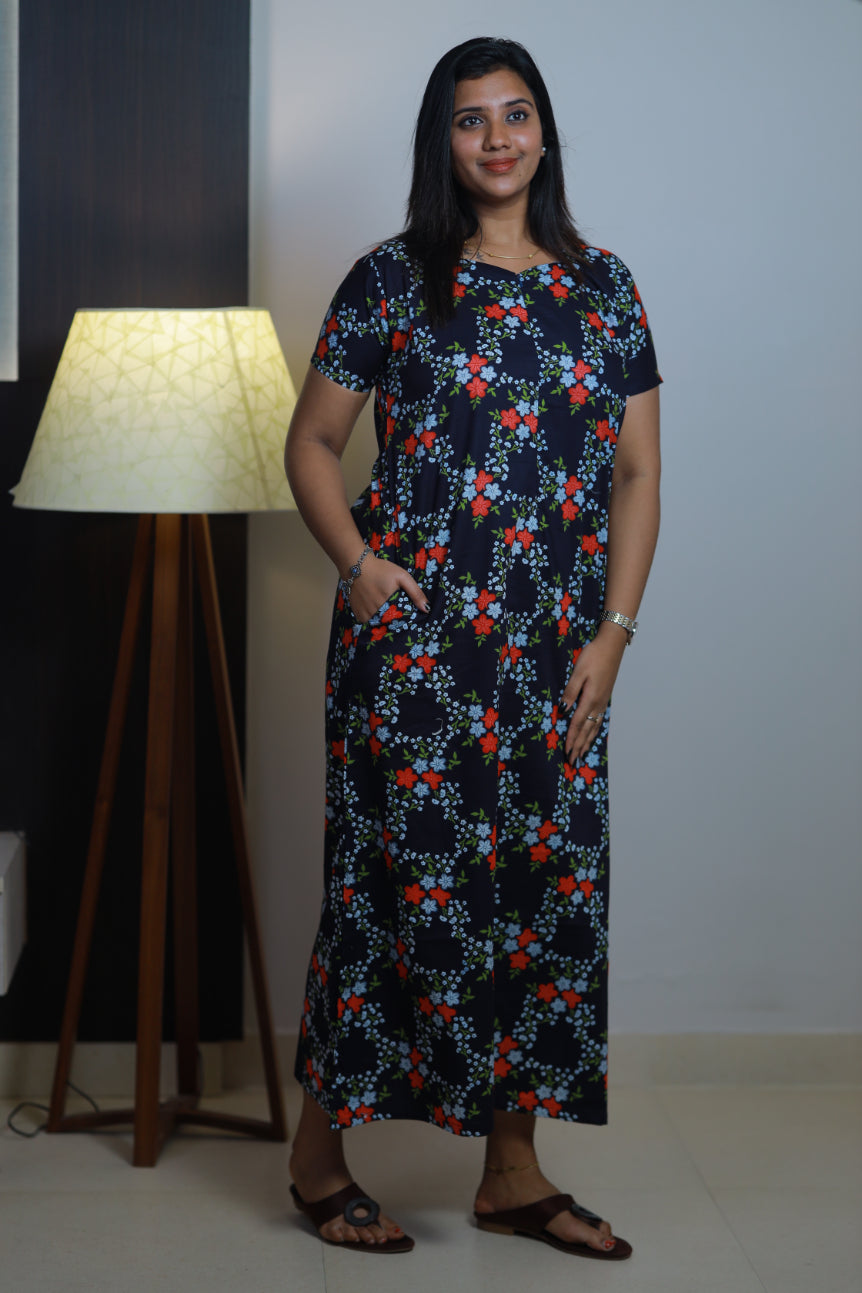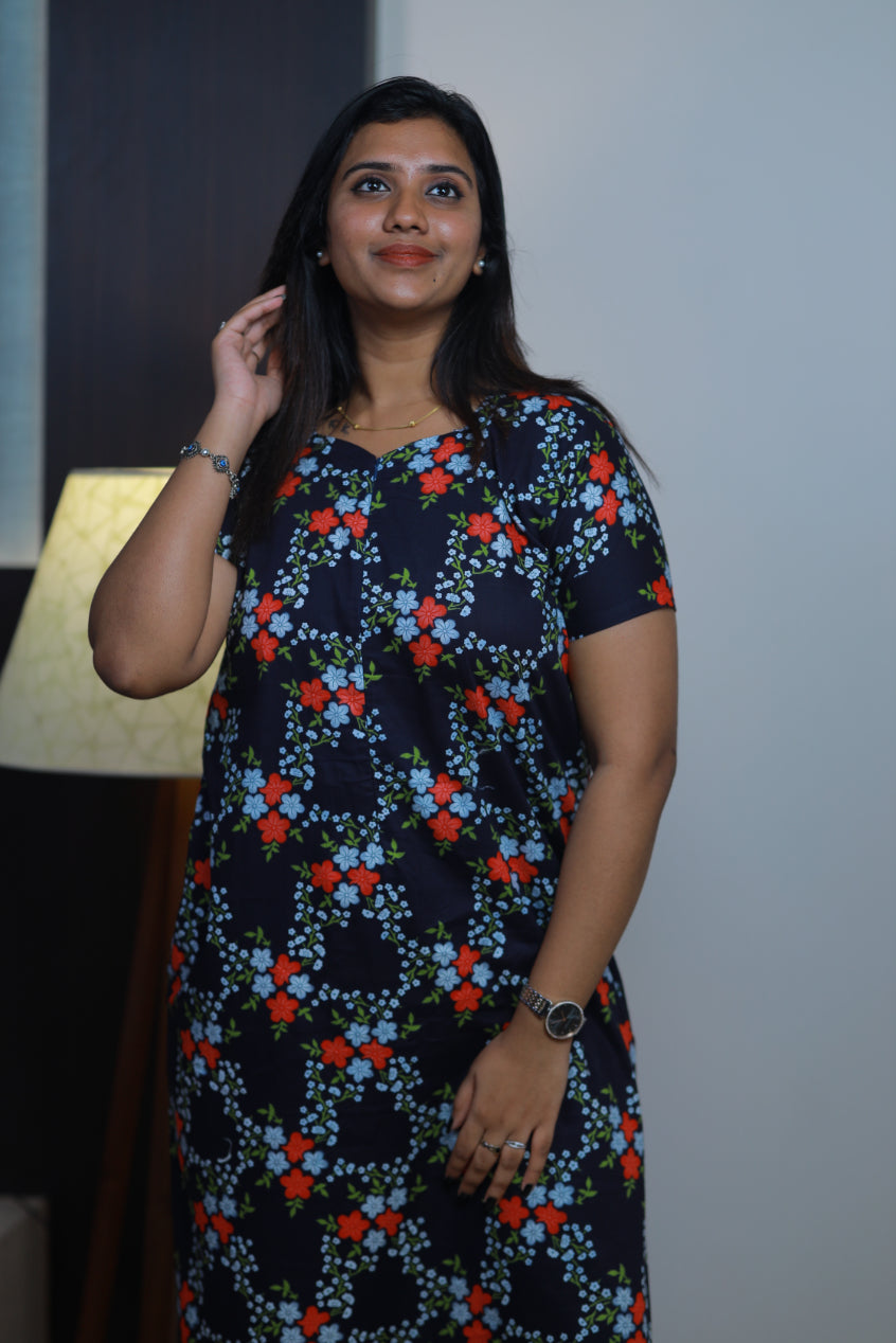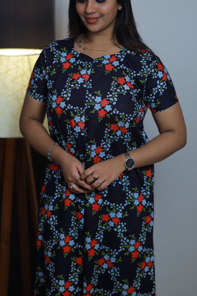 Navy Blue Wth Flower Invisible Center Zip Feeding Nighty