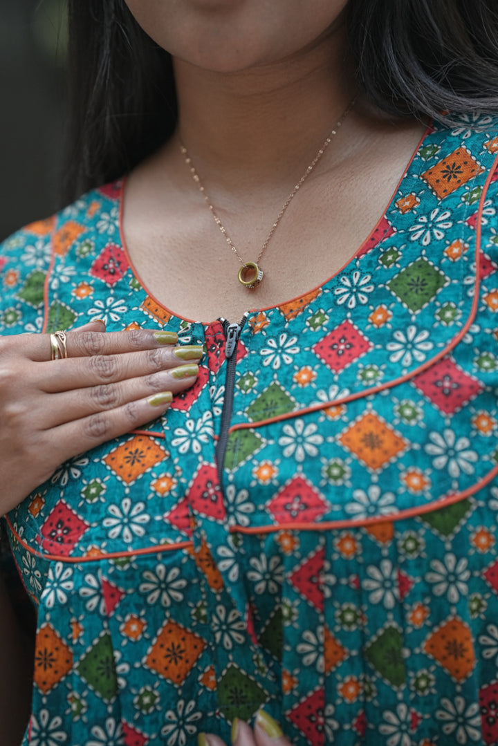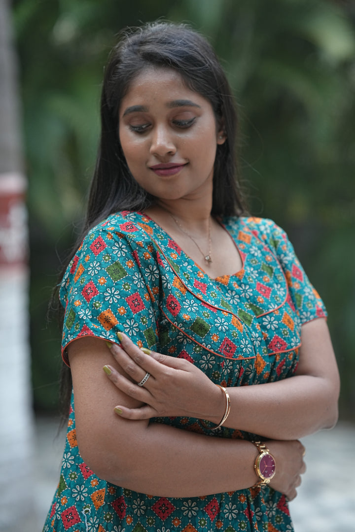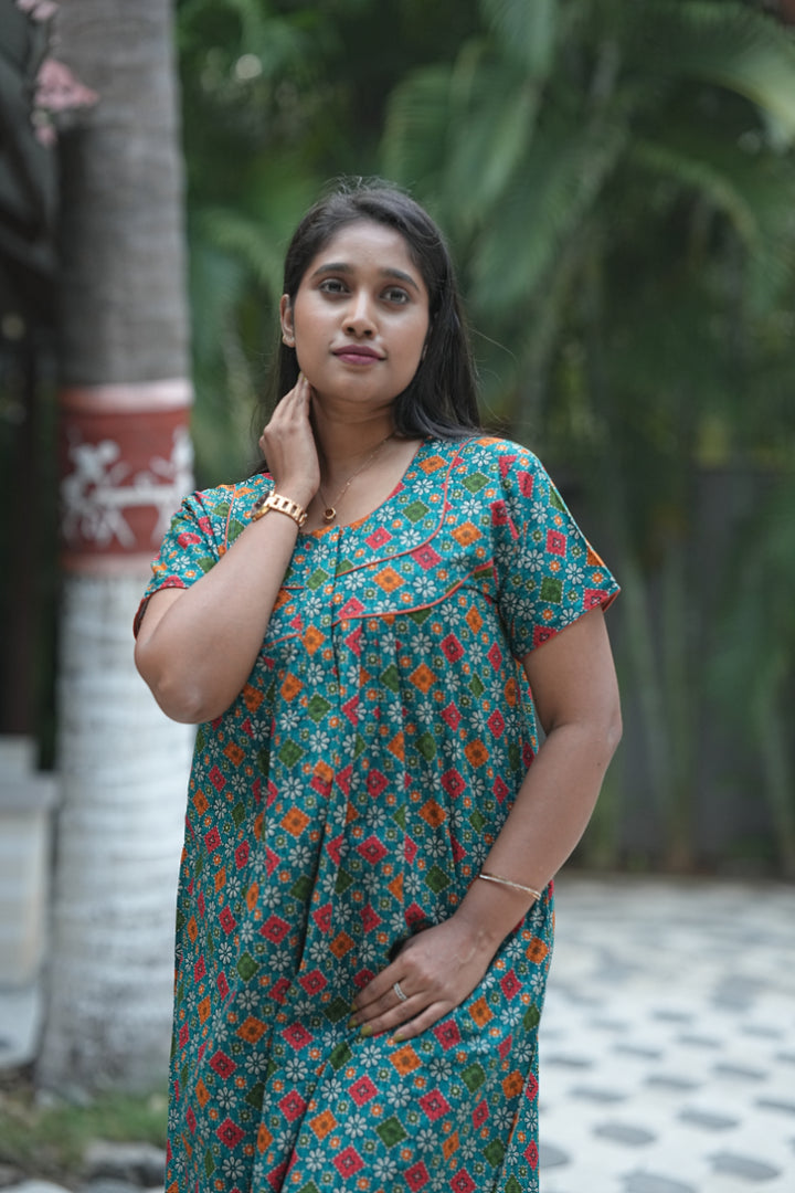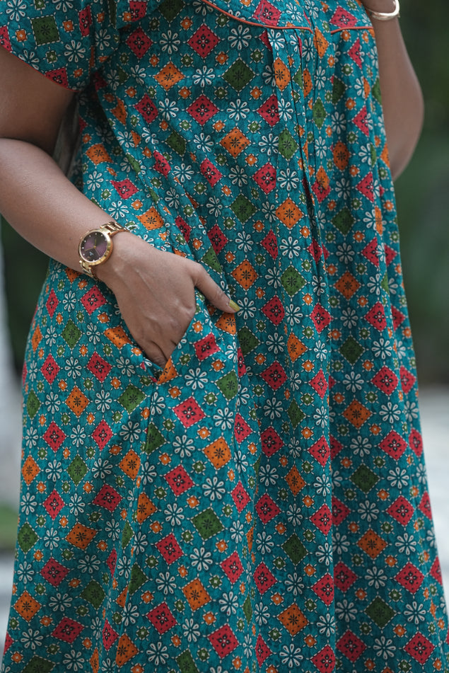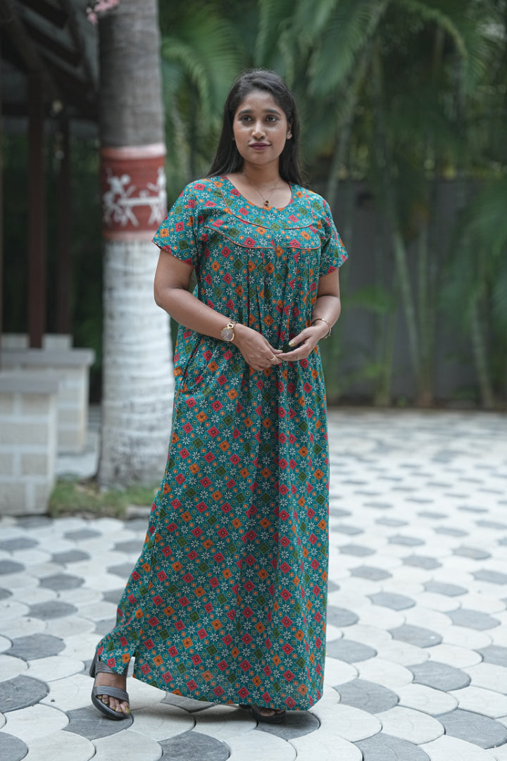 Dark Green Orange Floral Pattern Kalamkari Fleet cut Piping Center Zip Nighty