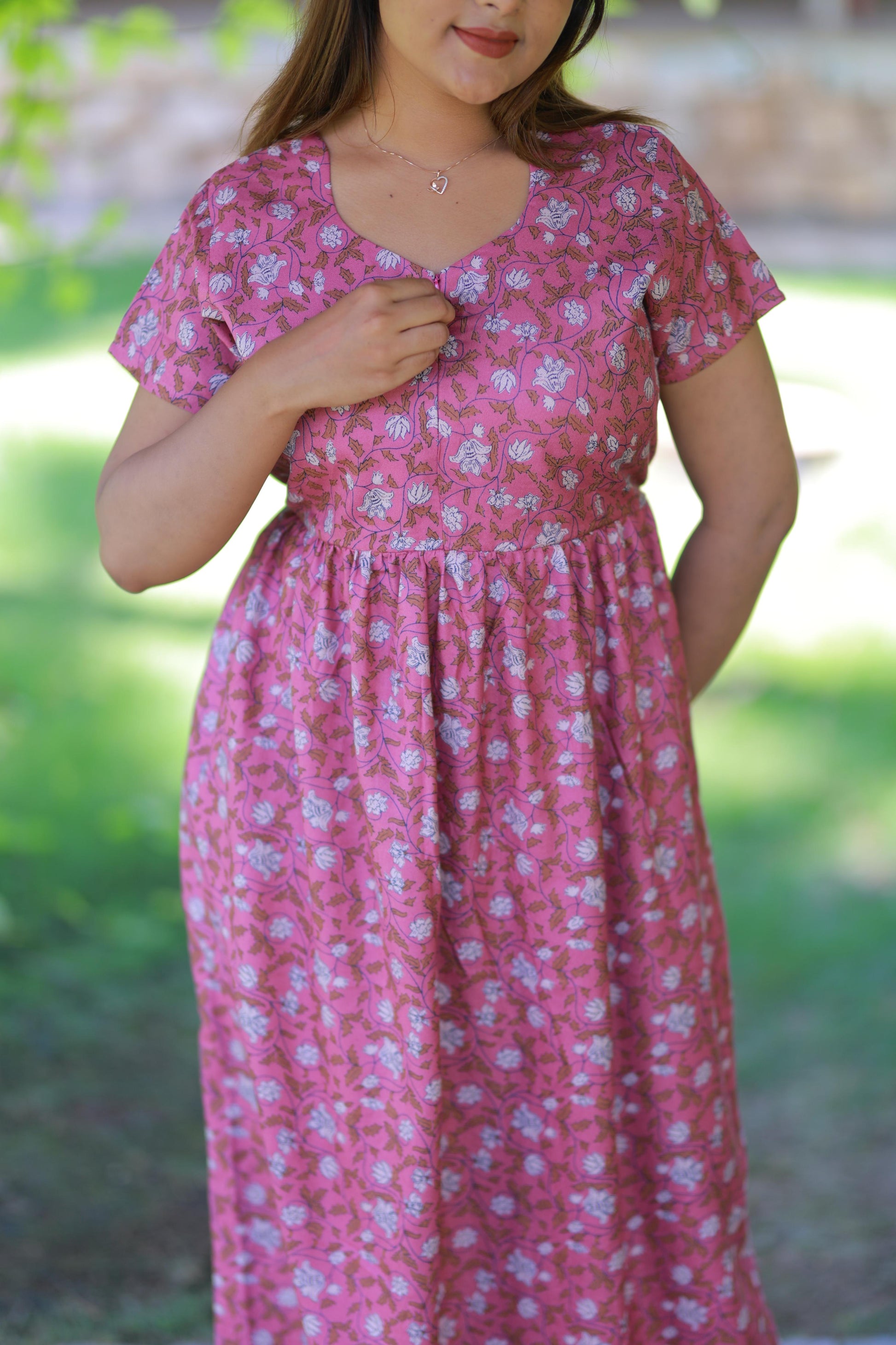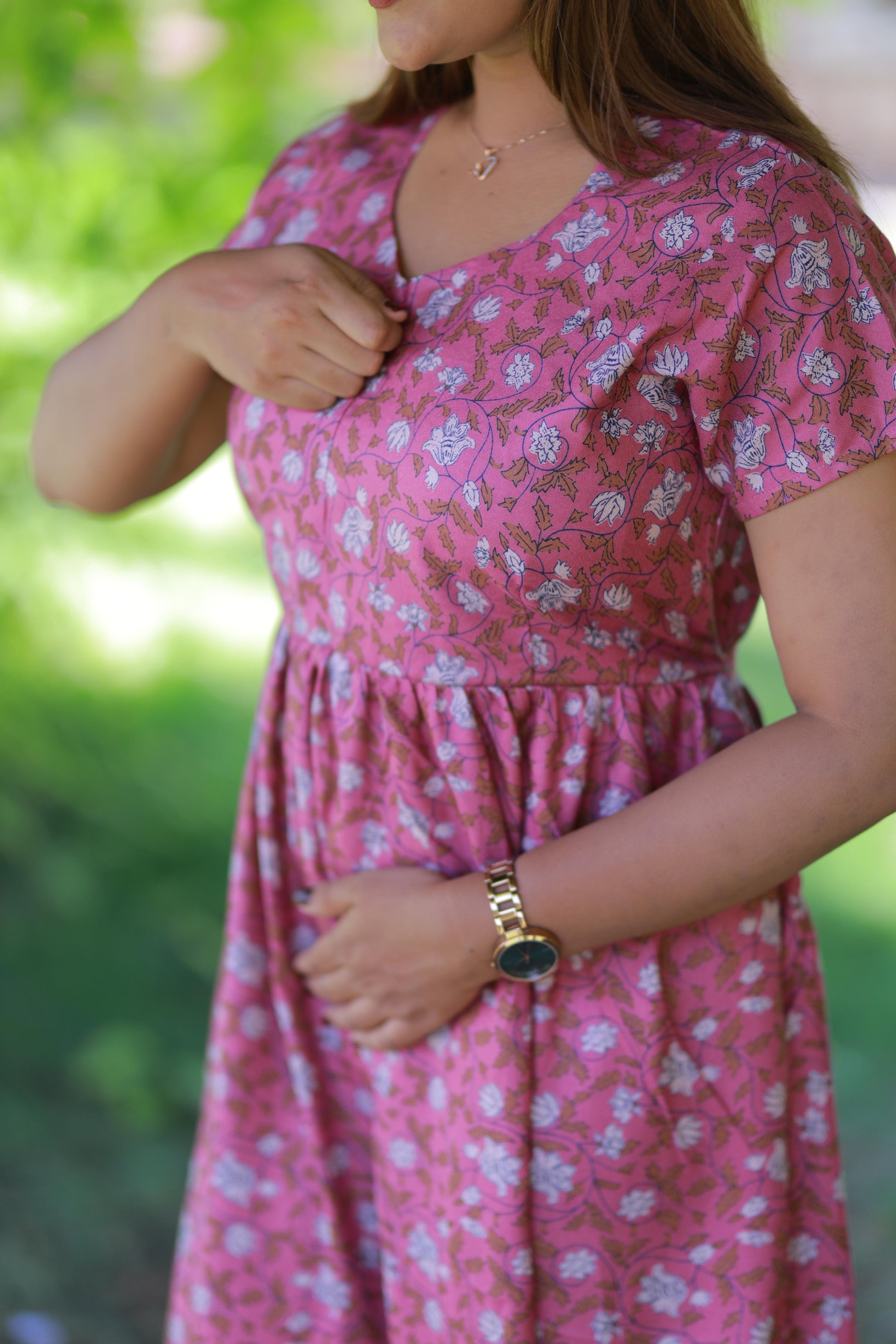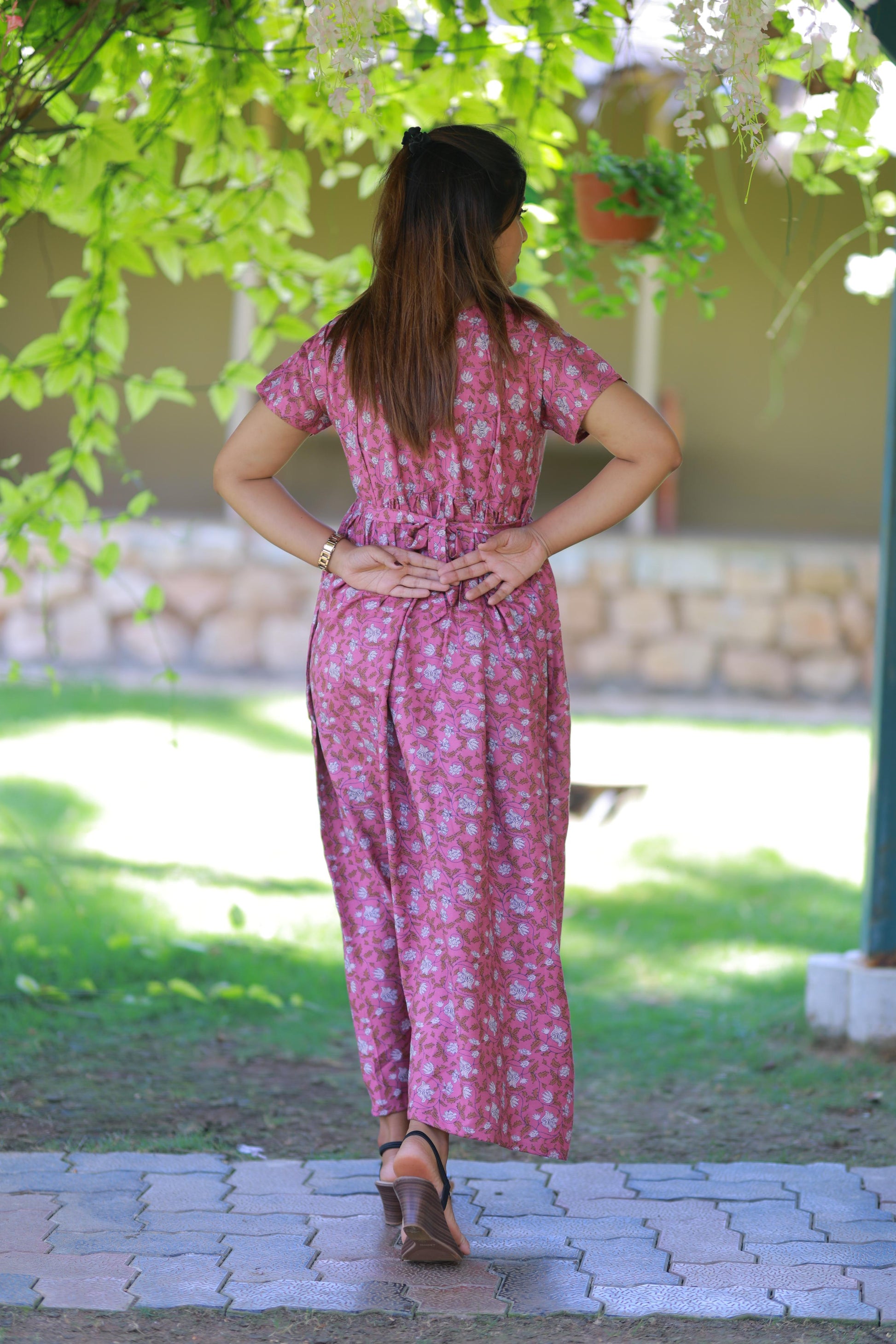 Pink with Brown Leaves Floral Alphine design Center zip Frock