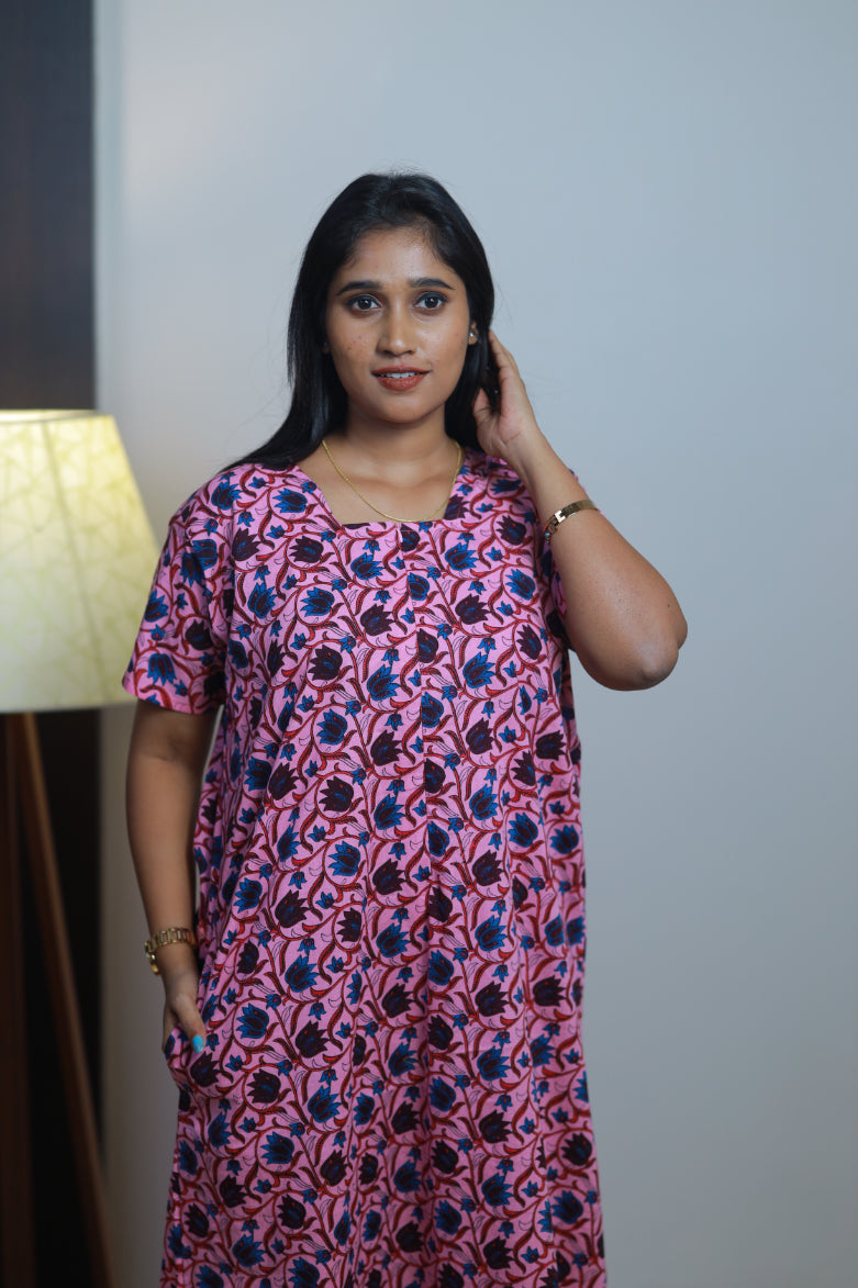 Pink With Flower Design Invisible Center Zip Feeding Nighty