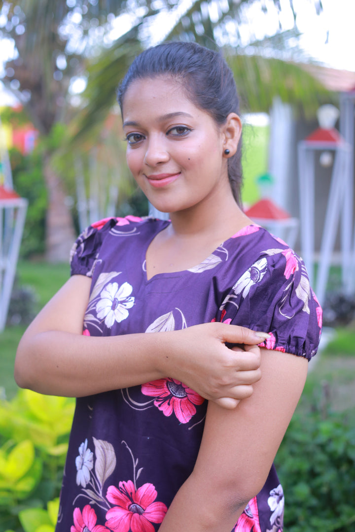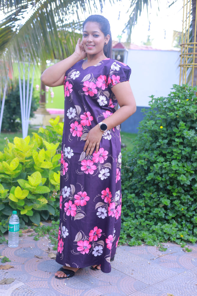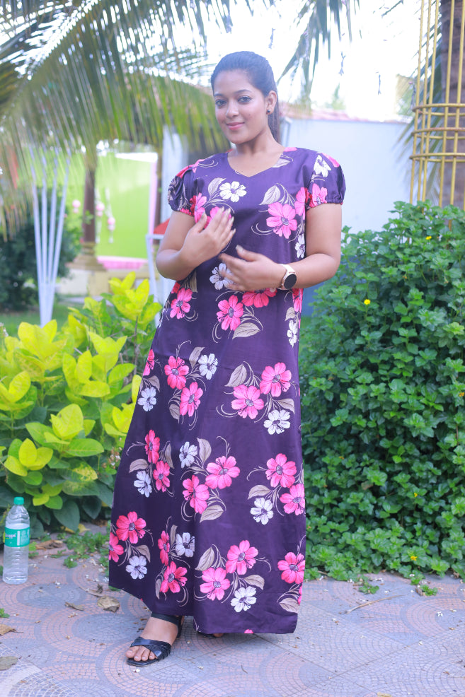 Drak Purple With Pink Flower Design V Neck Pattern Puff Sleeve Without Zip Nighty