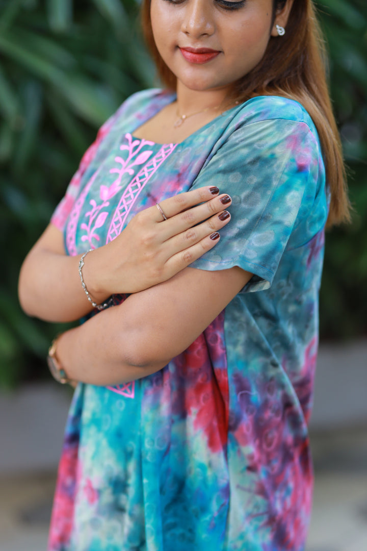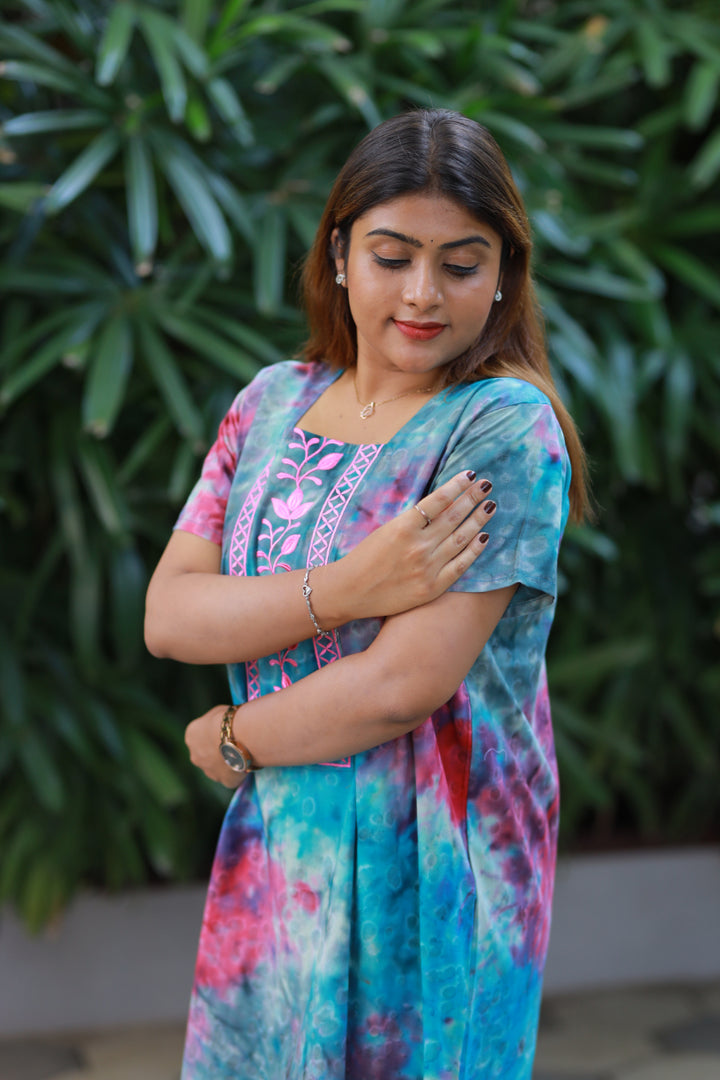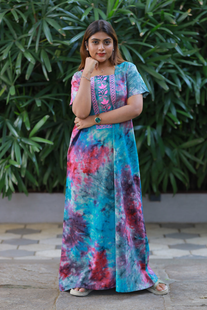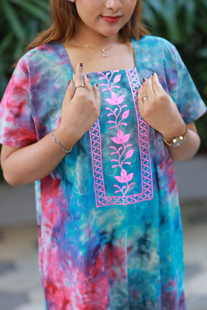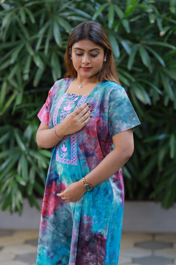Pure Cotton Batik Nighty With Elegent Embroidery Design