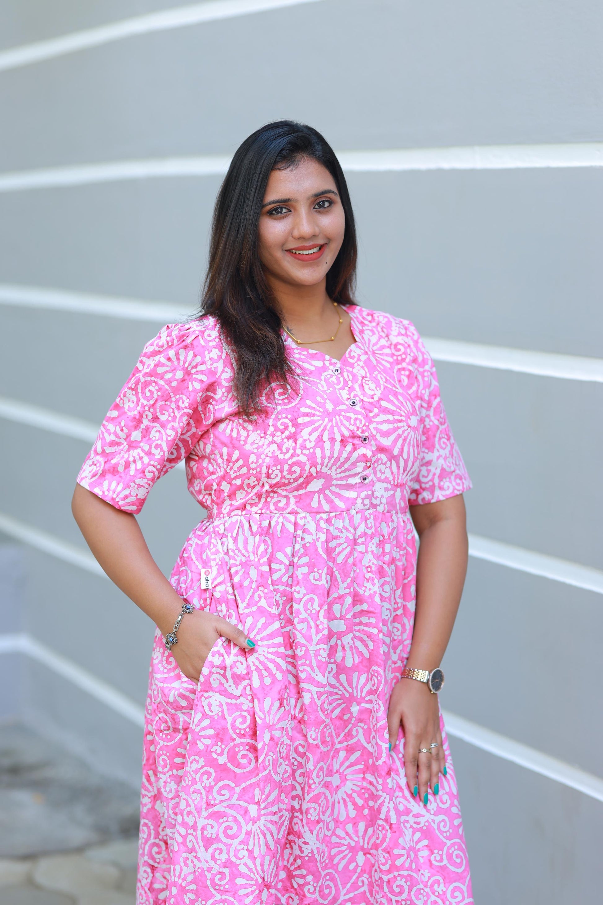 Pure cotton Hand Dyed Pink With White Batik double layer frock with Center Button