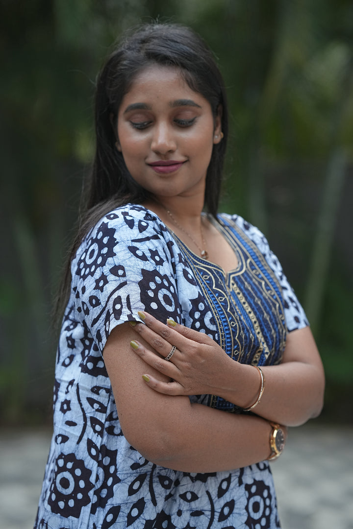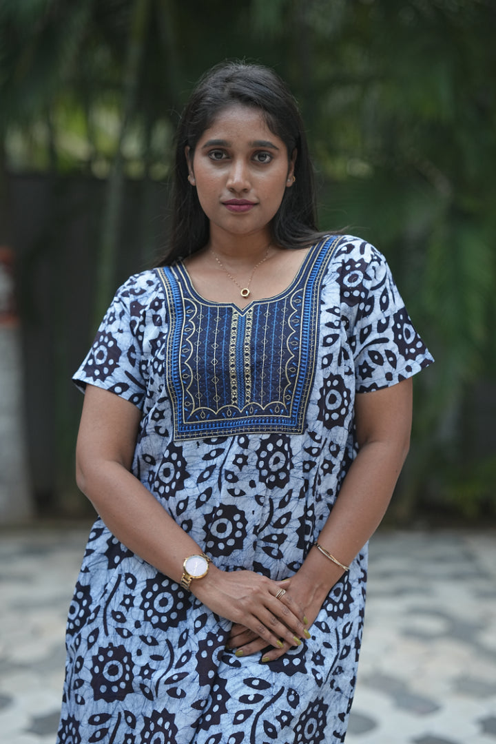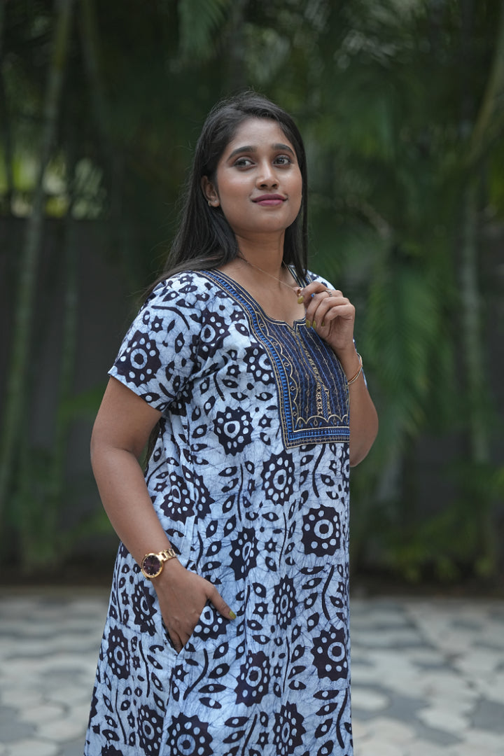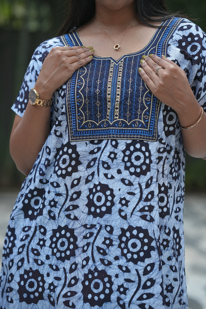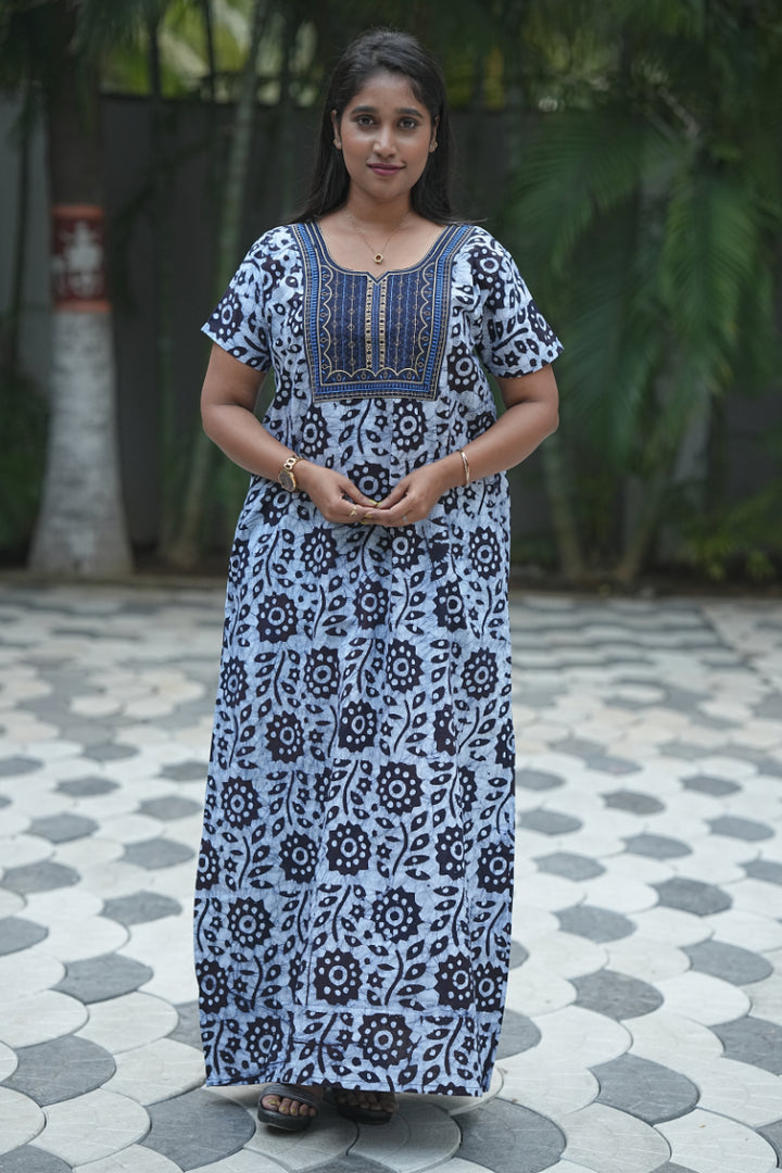 Dark Blue Batik Cotton Front Embroidery Nighty