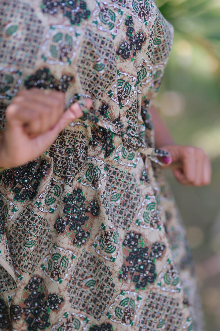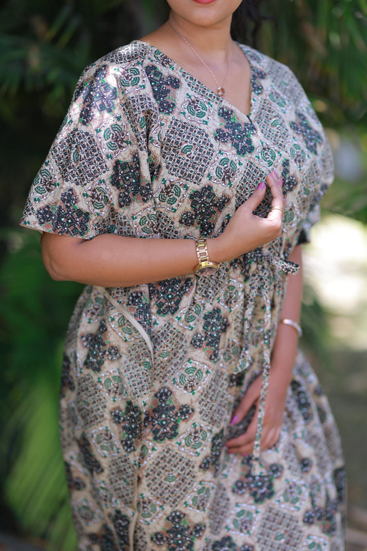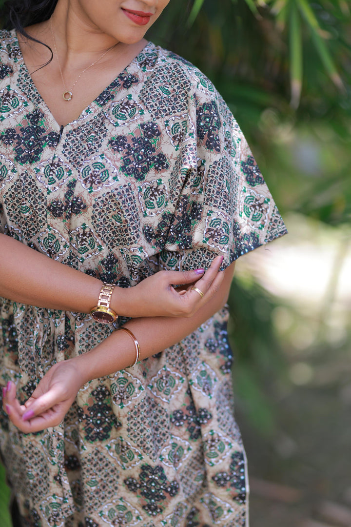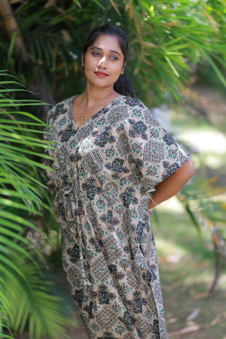 Brown With Green Kalamkari Design kaftan with feeding Side zip