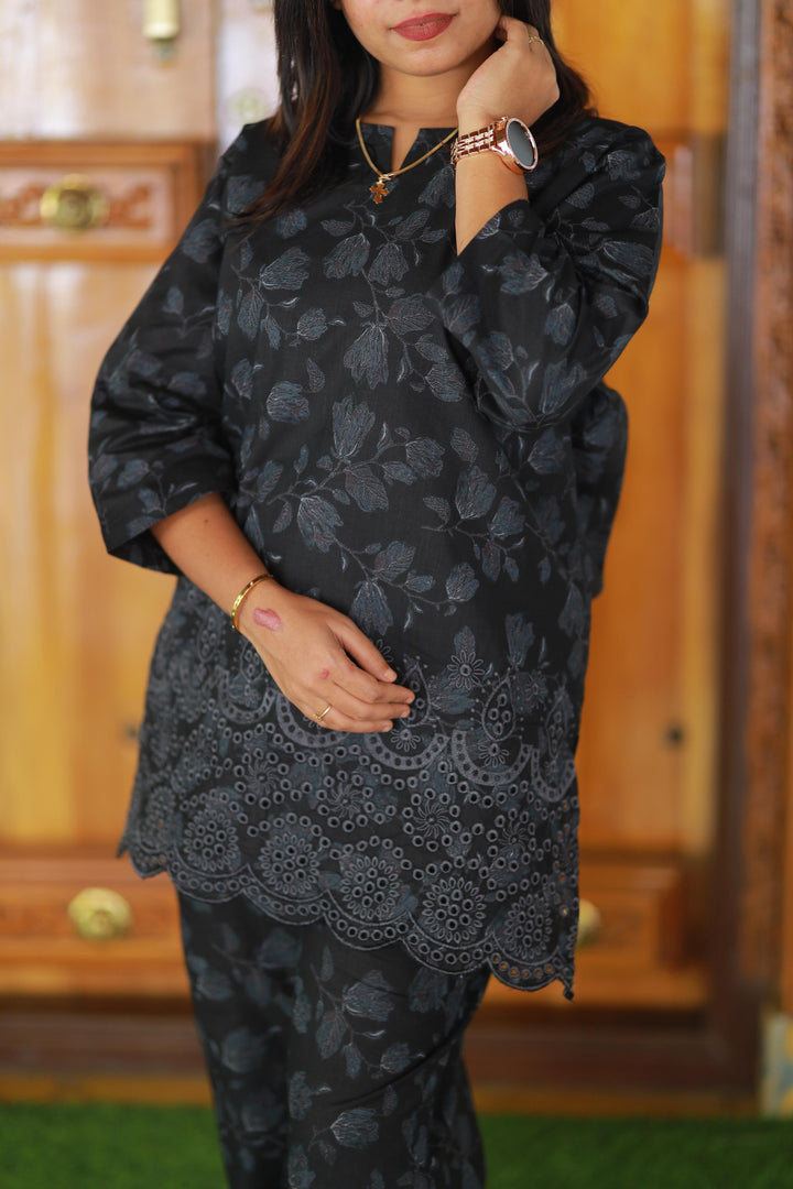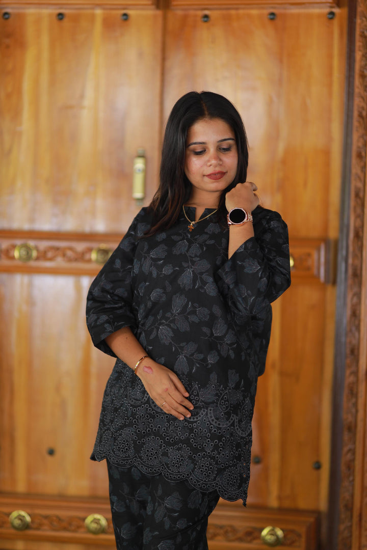 Black Blossom Linen schiffli embroidery co-ord set