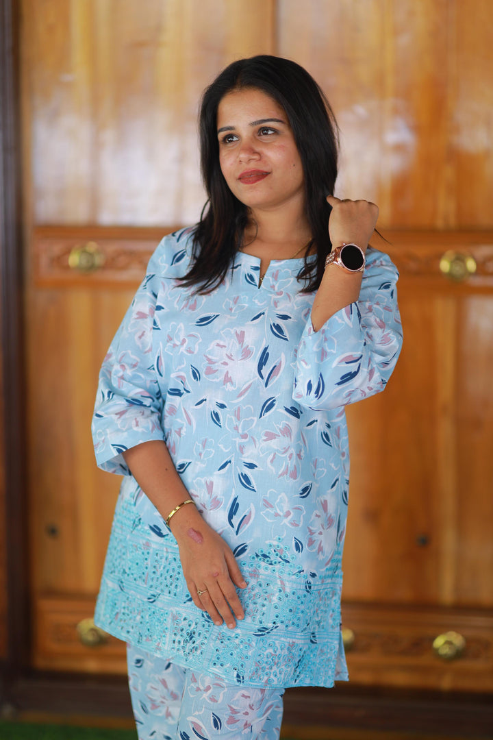Sky blue Blossom Linen schiffli embroidery co-ord set