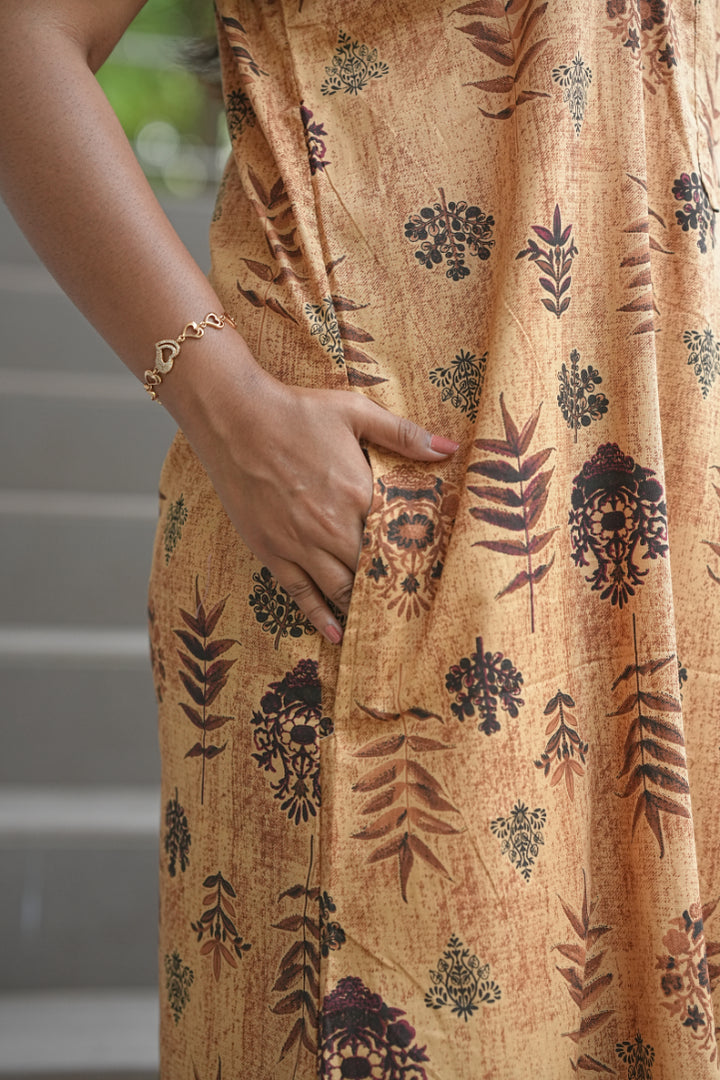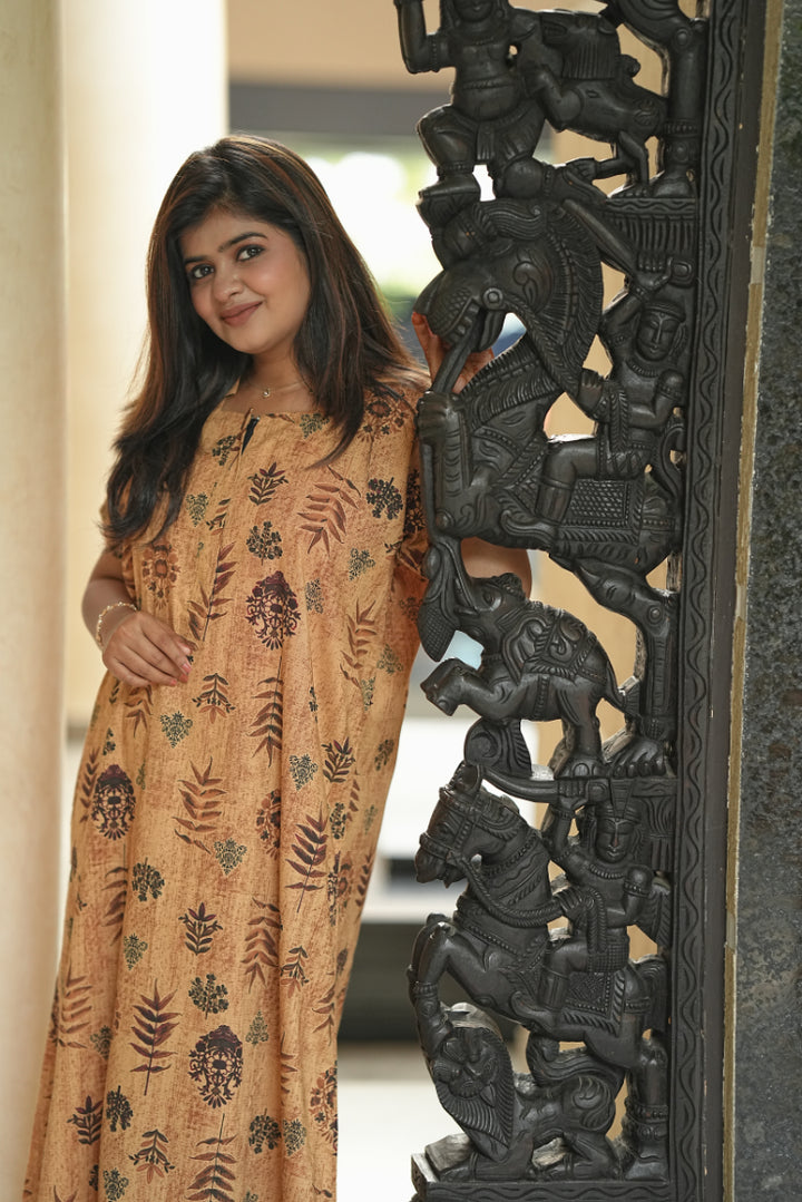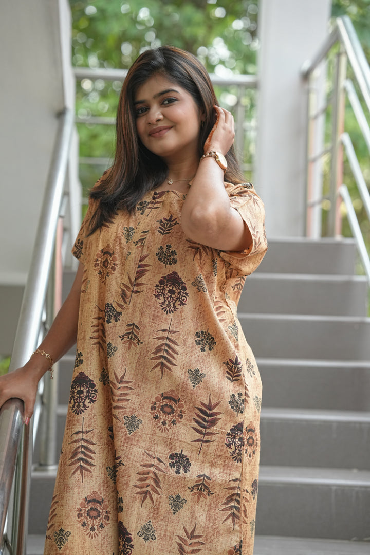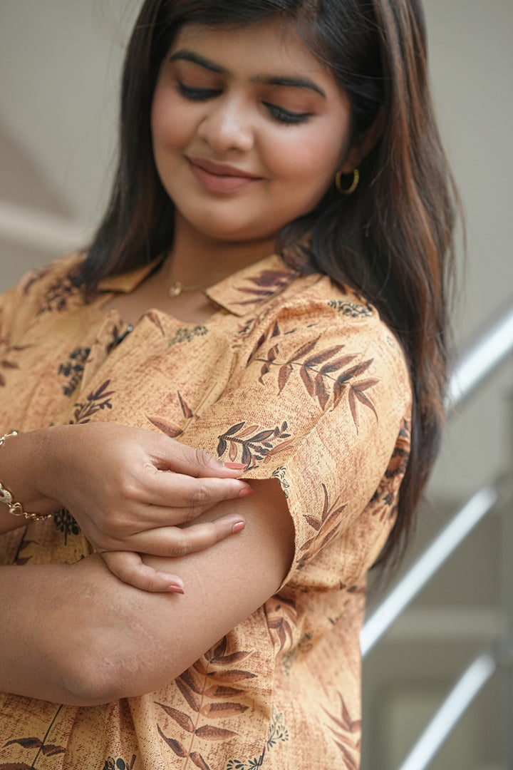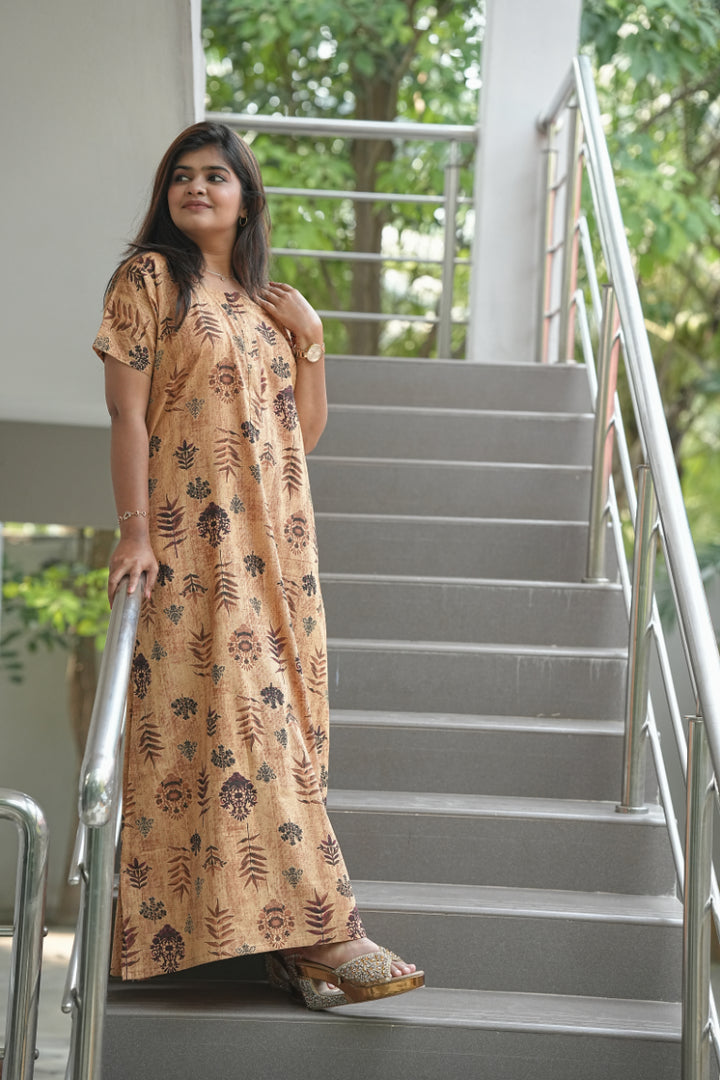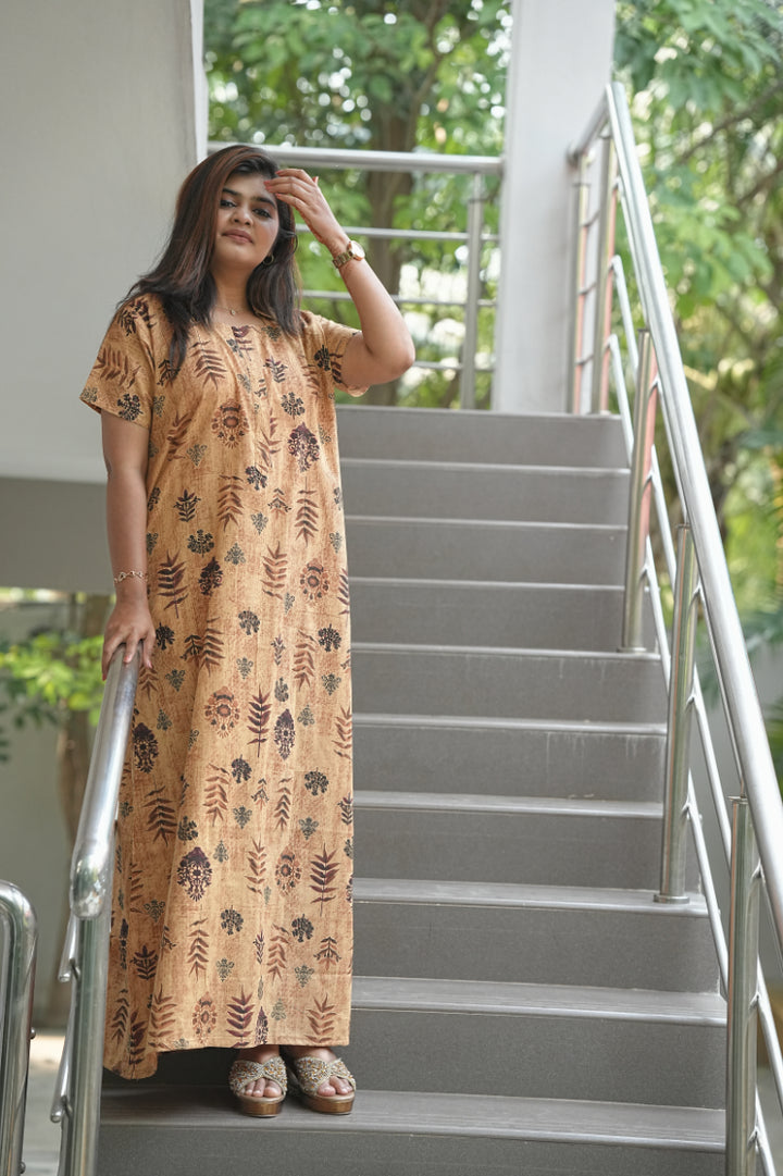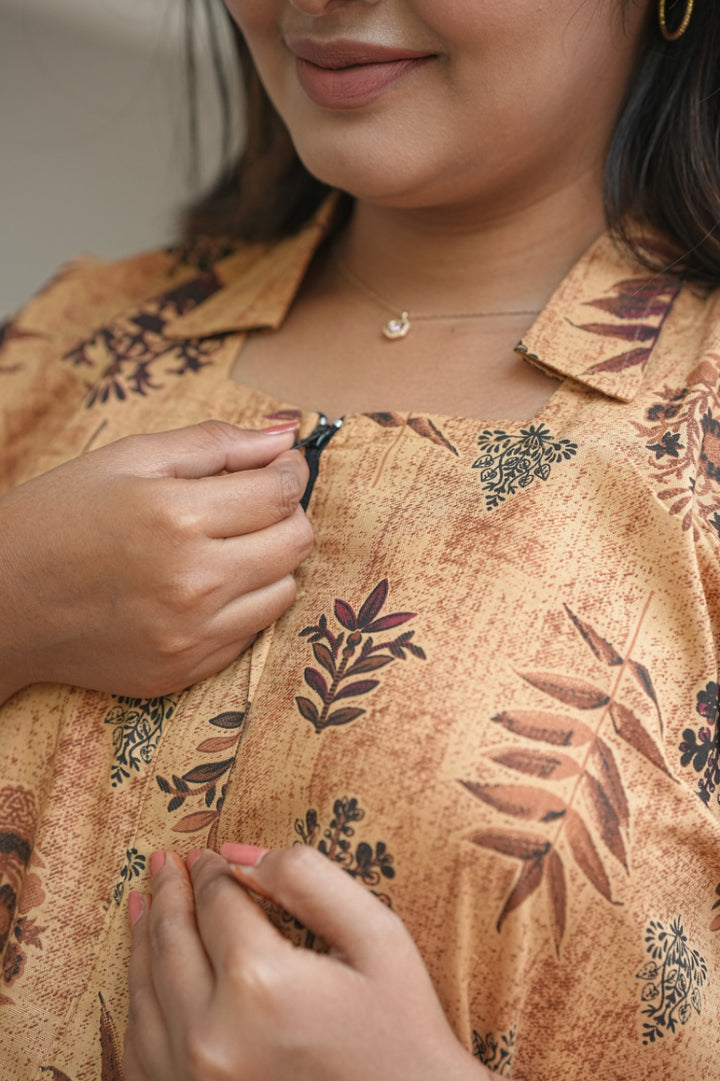 Brown With Dark Brown Leaf design Collar zip Nighty