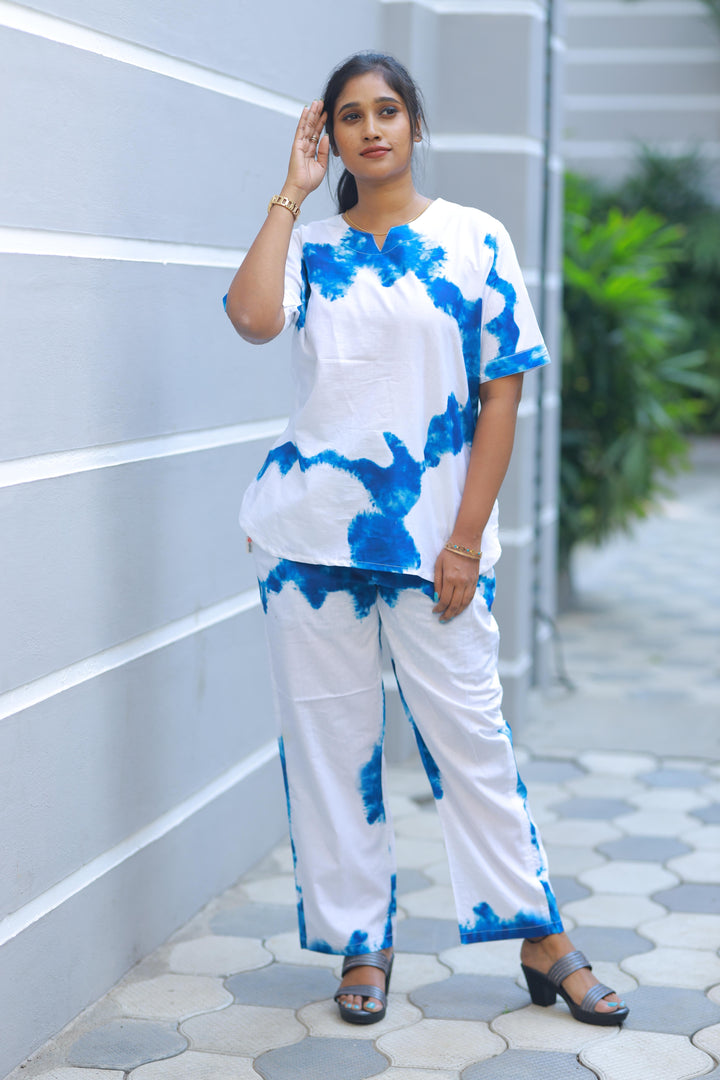 White With Blue design V neck nightdress