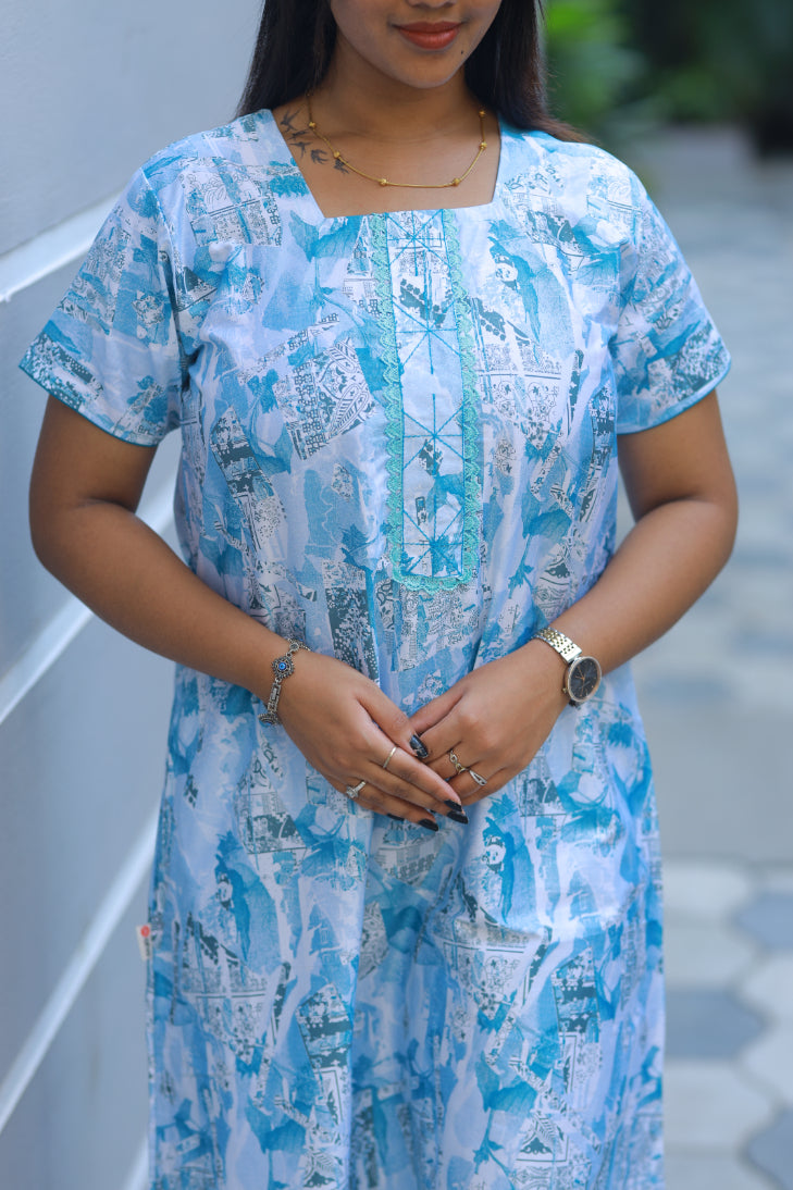 White With Sky Blue Floral Design Without Zip Premium Nighty