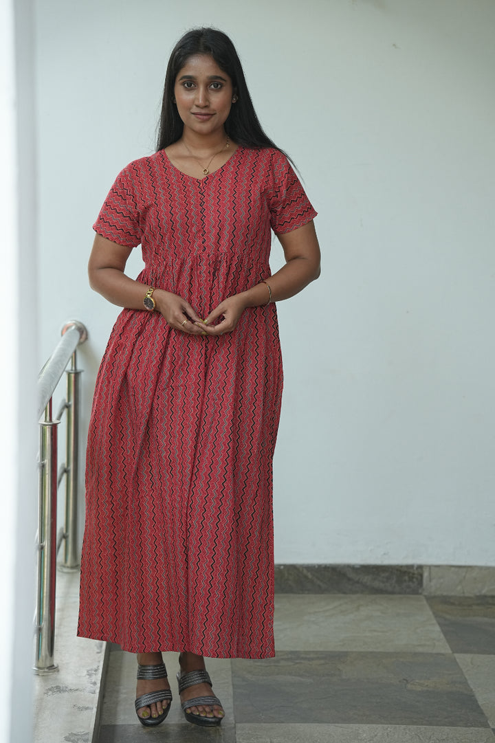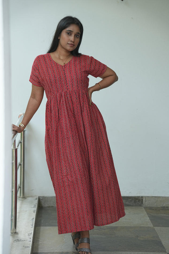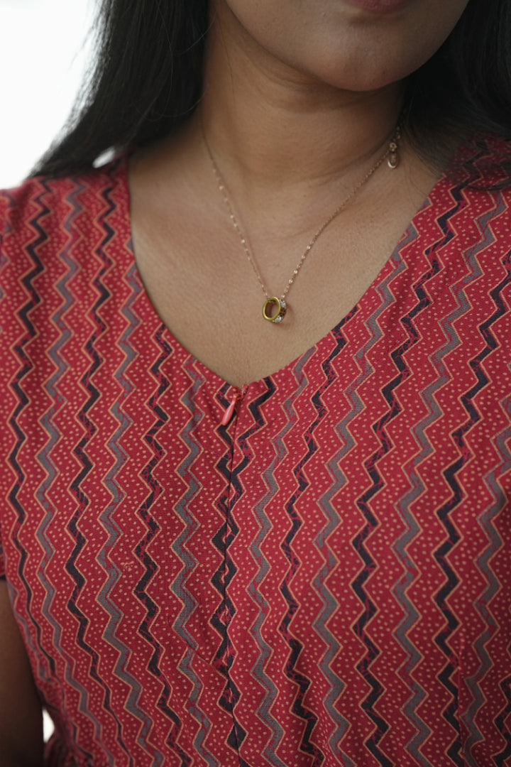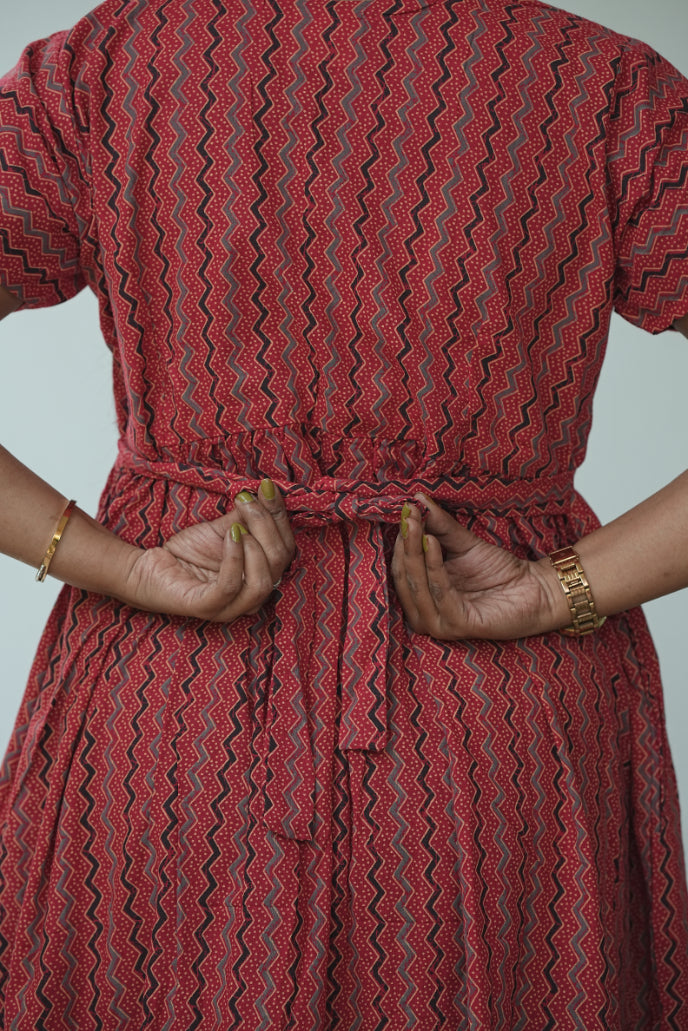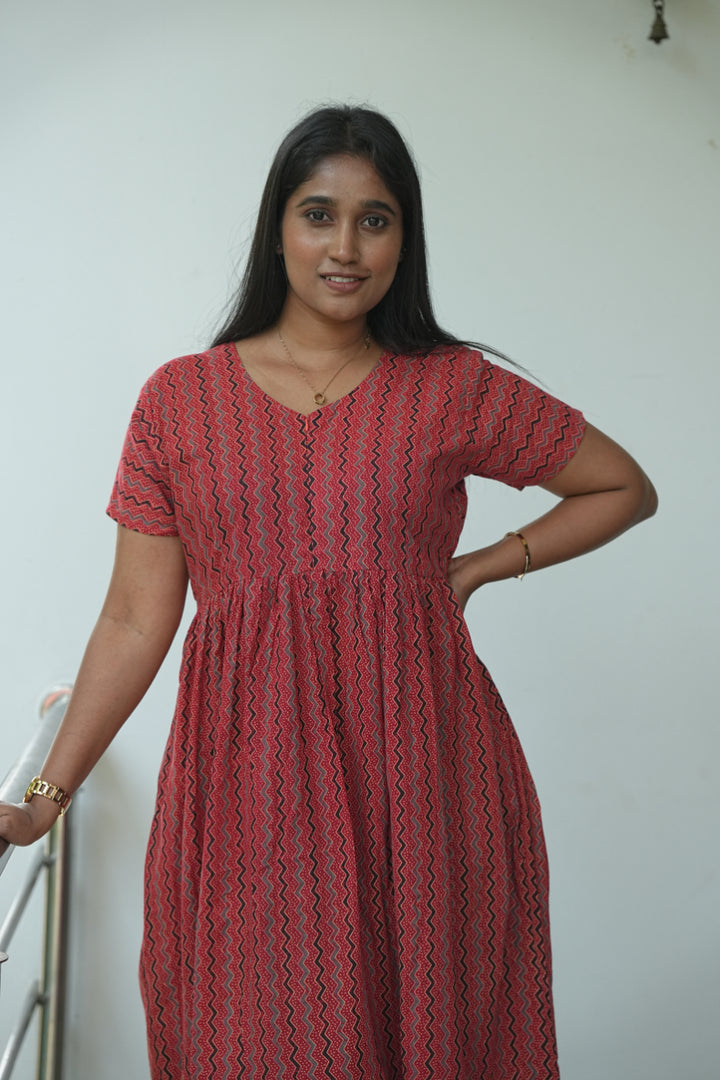 Red stripes Ajrakh fabric Center Zip Frock